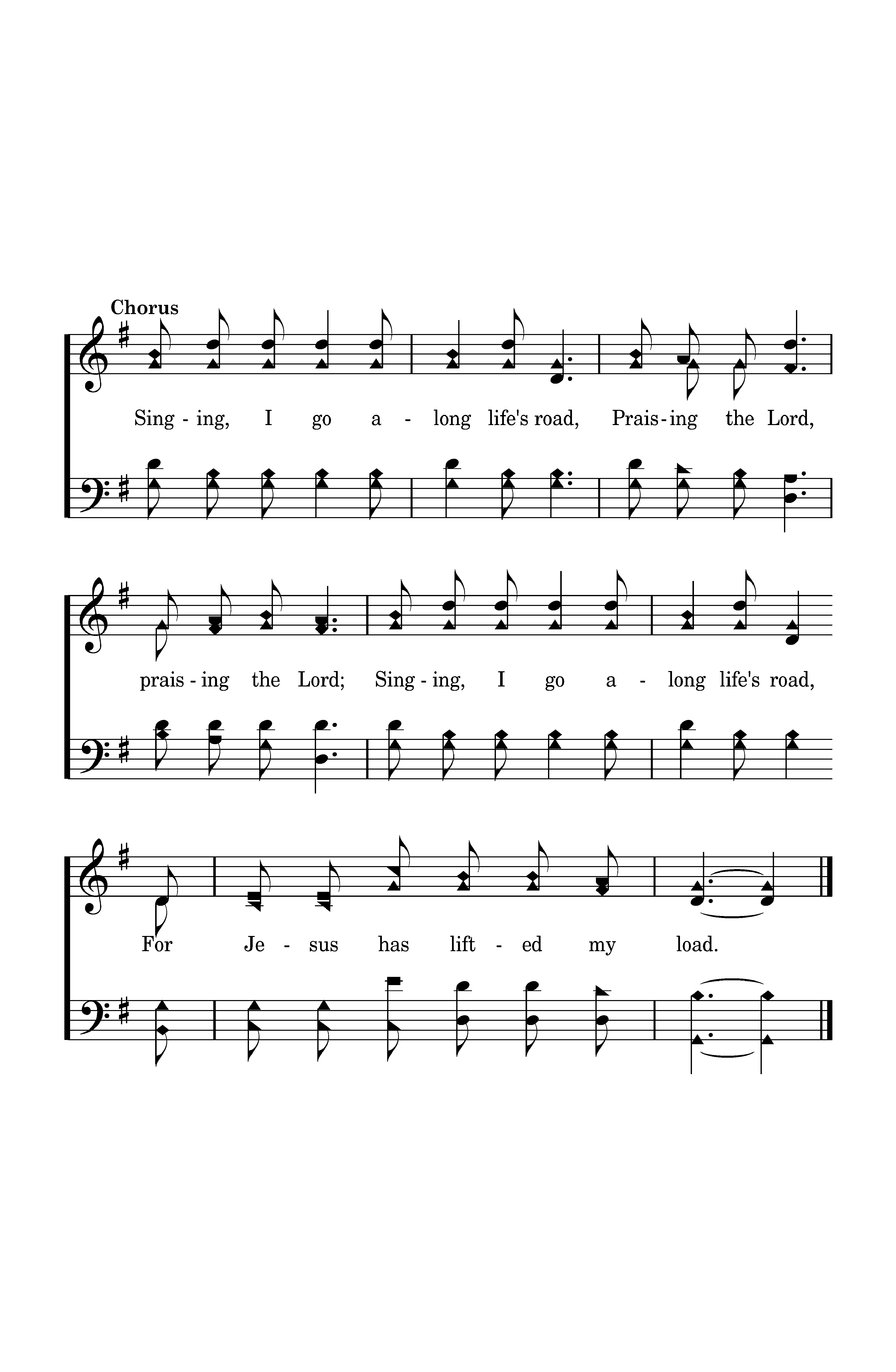 Singing, I go along life's road, Praising the Lord, praising the Lord; Singing, I go along life's road, For Jesus has lifted my load.