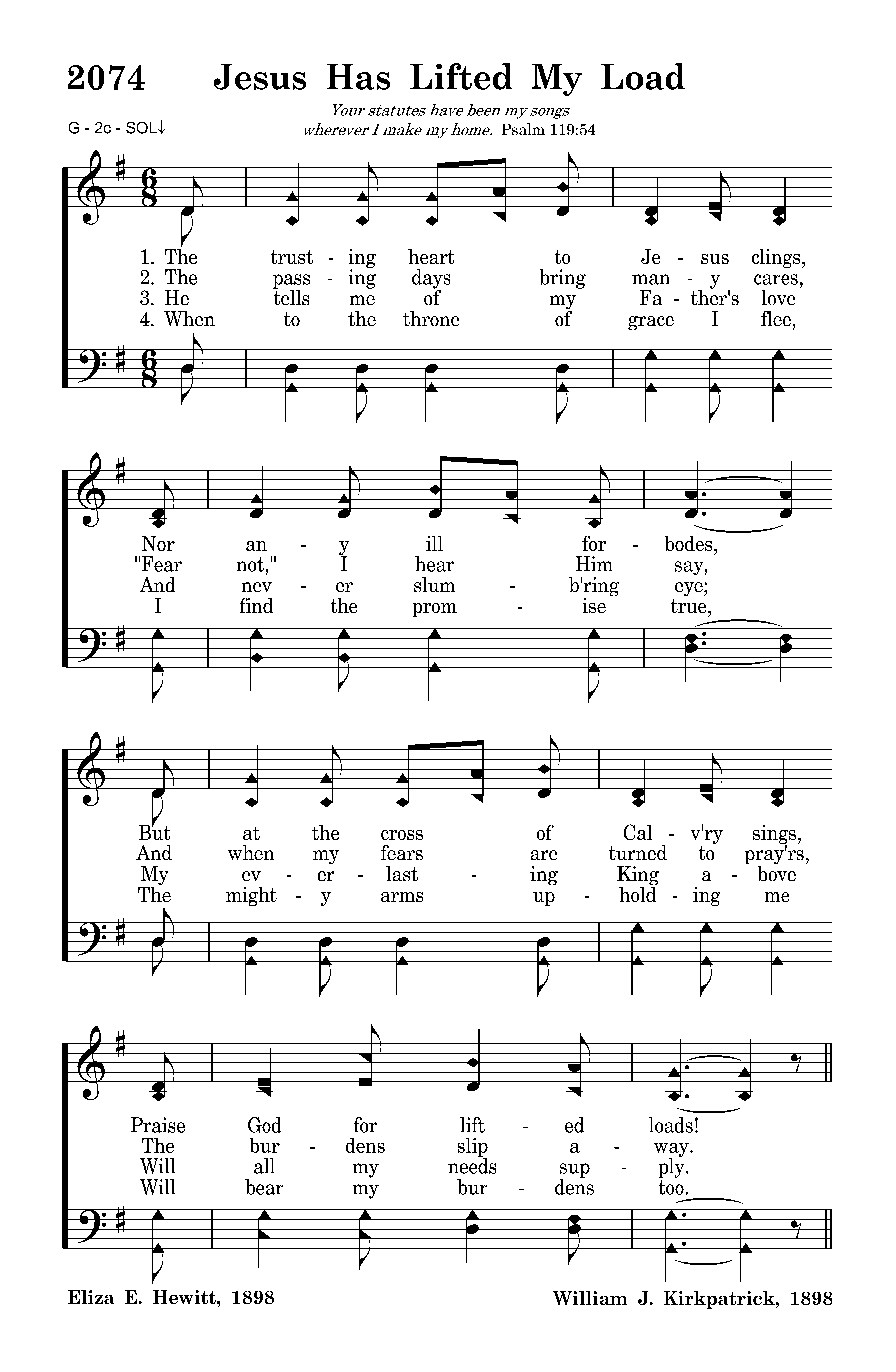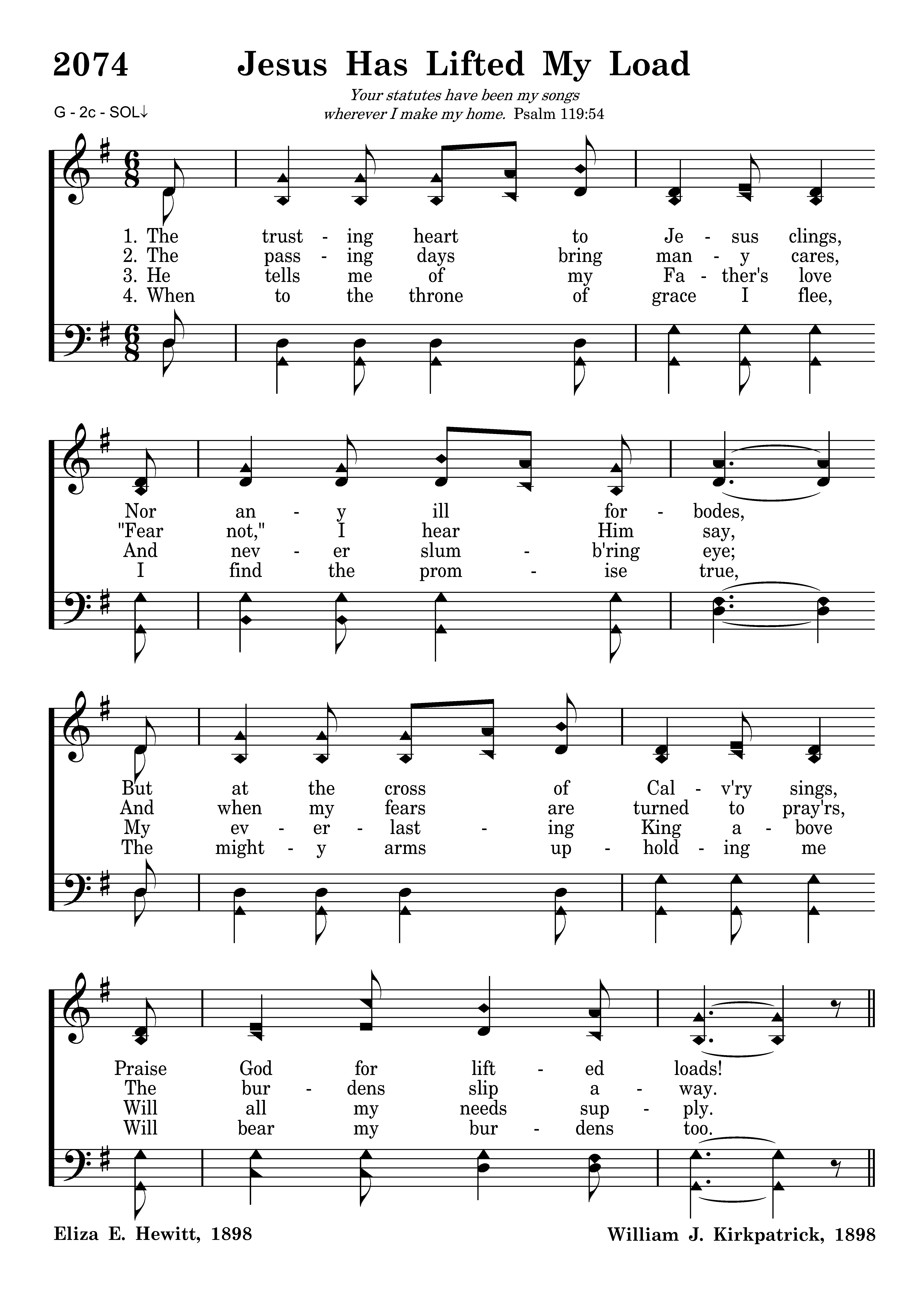 The trusting heart to Jesus clings, Nor any ill forbodes, But at the cross of Calv'ry sings, Praise God for lifted loads!