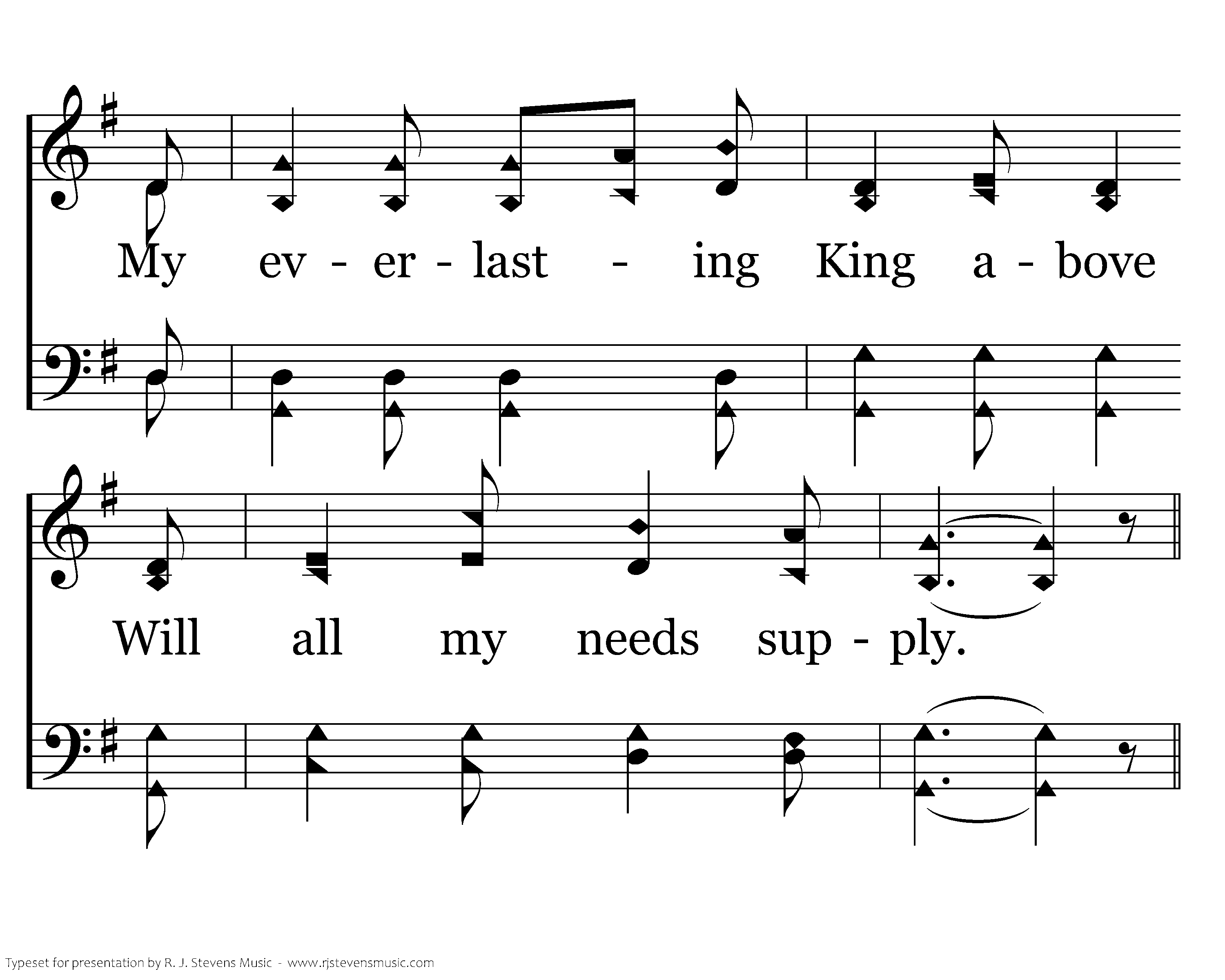 He tells me of my Father's love And never slumb'ring eye; My everlasting King above Will all my needs supply.