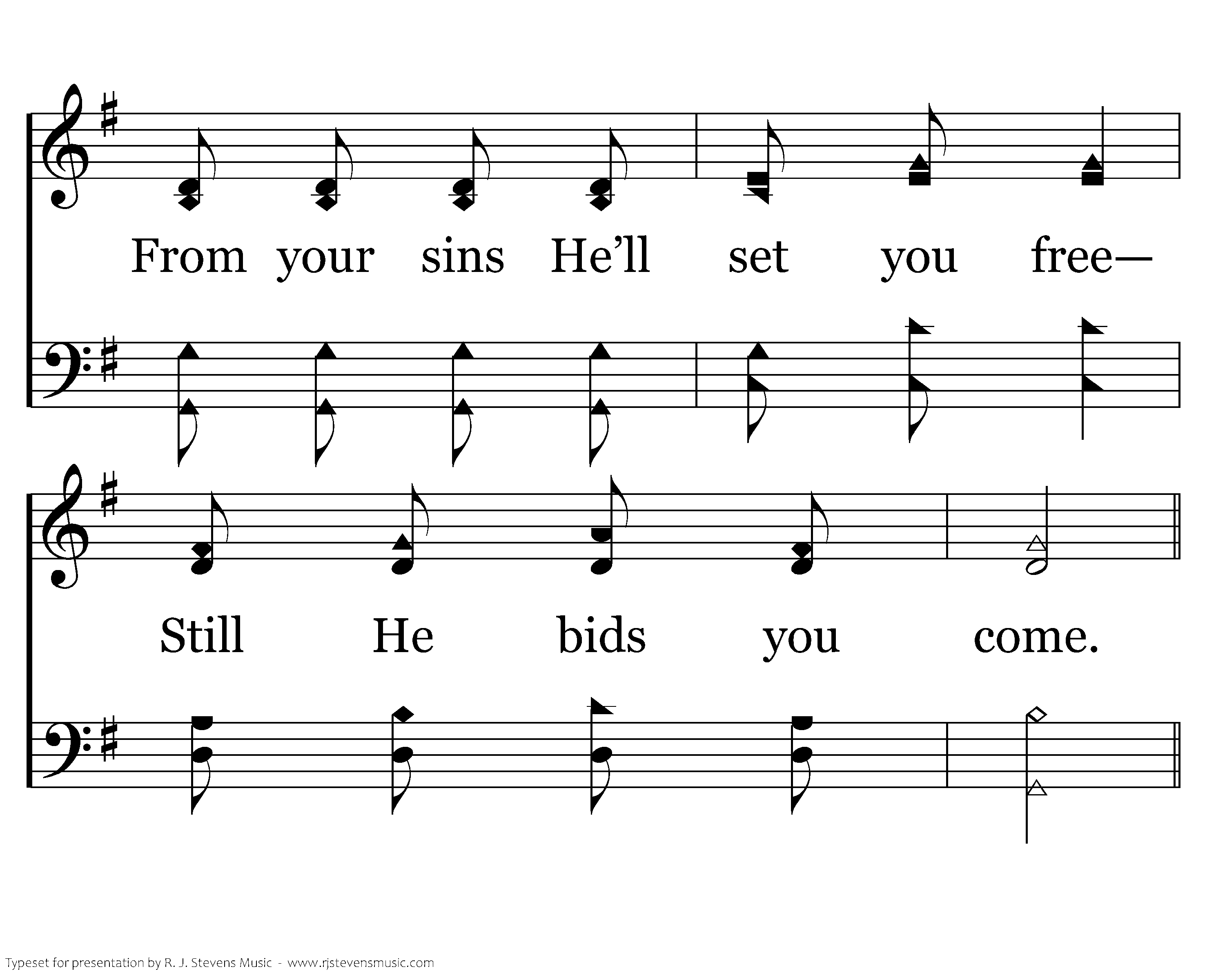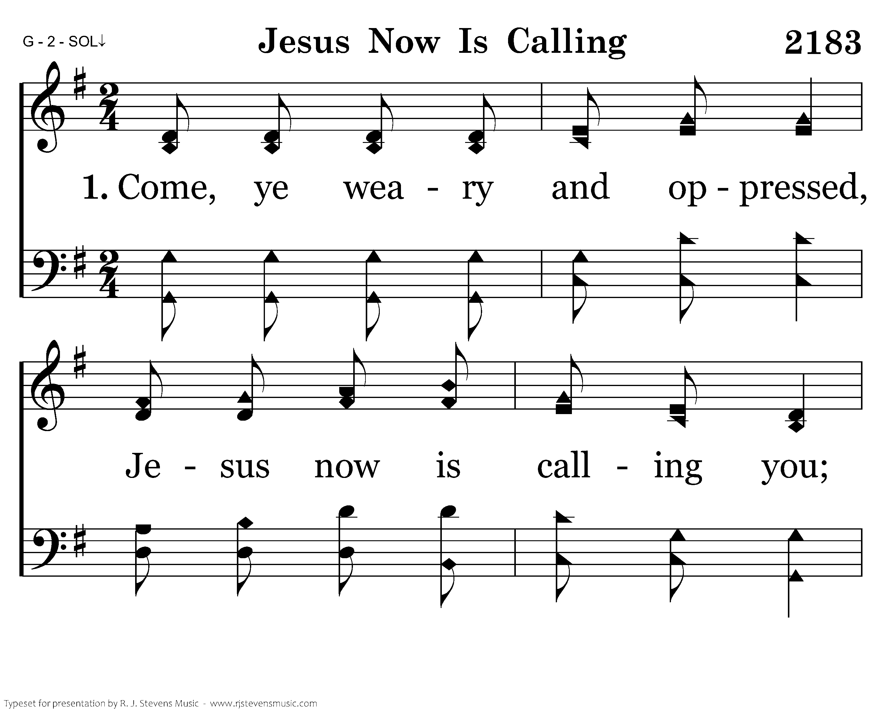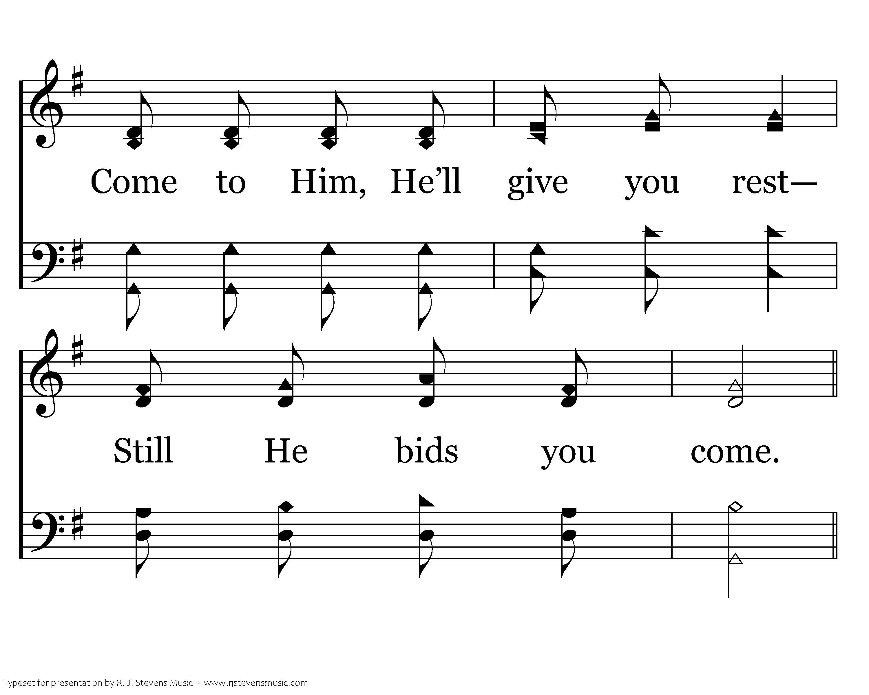 Come, ye weary and oppressed, Jesus now is calling you; Come to Him, He’ll give you rest— Still He bids you come.