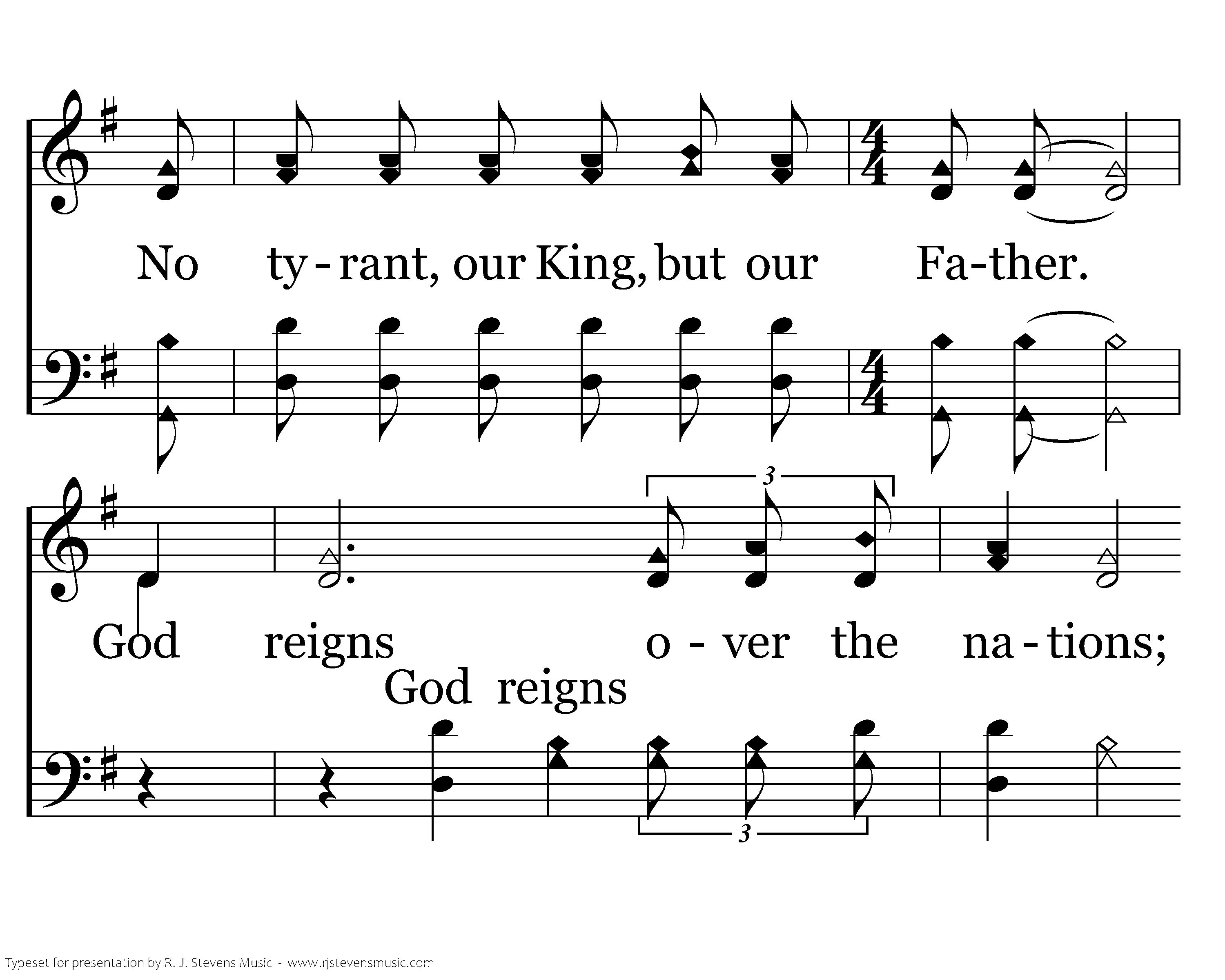 God reigns over the nations; God sits on His Holy throne. Our God, the Most High God, doth rule in the kingdom of men. God of our fathers, That throne sits on high in the depths of men's hearts, Won over by willing surrender. A warfare with weapons too carnal a fare, No tyrant, our King, but our Father.