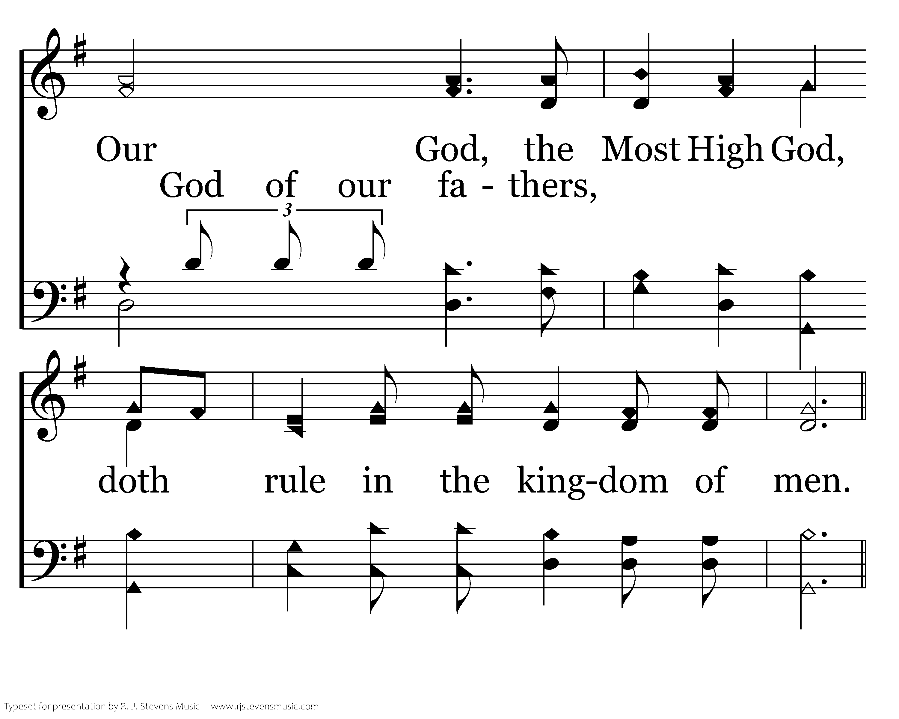 God reigns over the nations; God sits on His Holy throne. Our God, the Most High God, doth rule in the kingdom of men. God of our fathers, The stone from a mountain, cut out without hands, This kingdom will never be conquered. Against it hell's gates shall never prevail, Its throne will be left to no other.