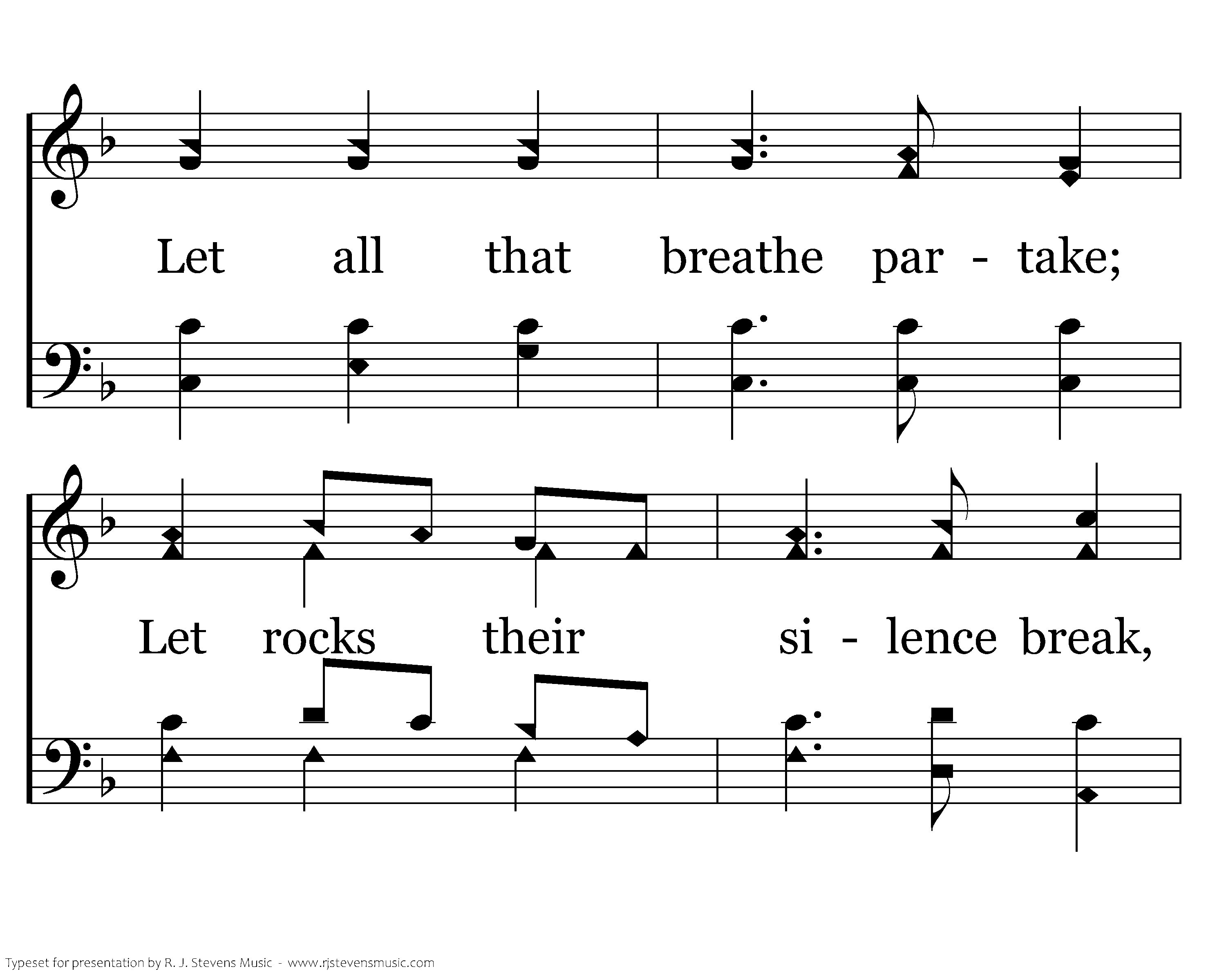 Let all that breathe partake; Let rocks their silence break, The sound prolong.