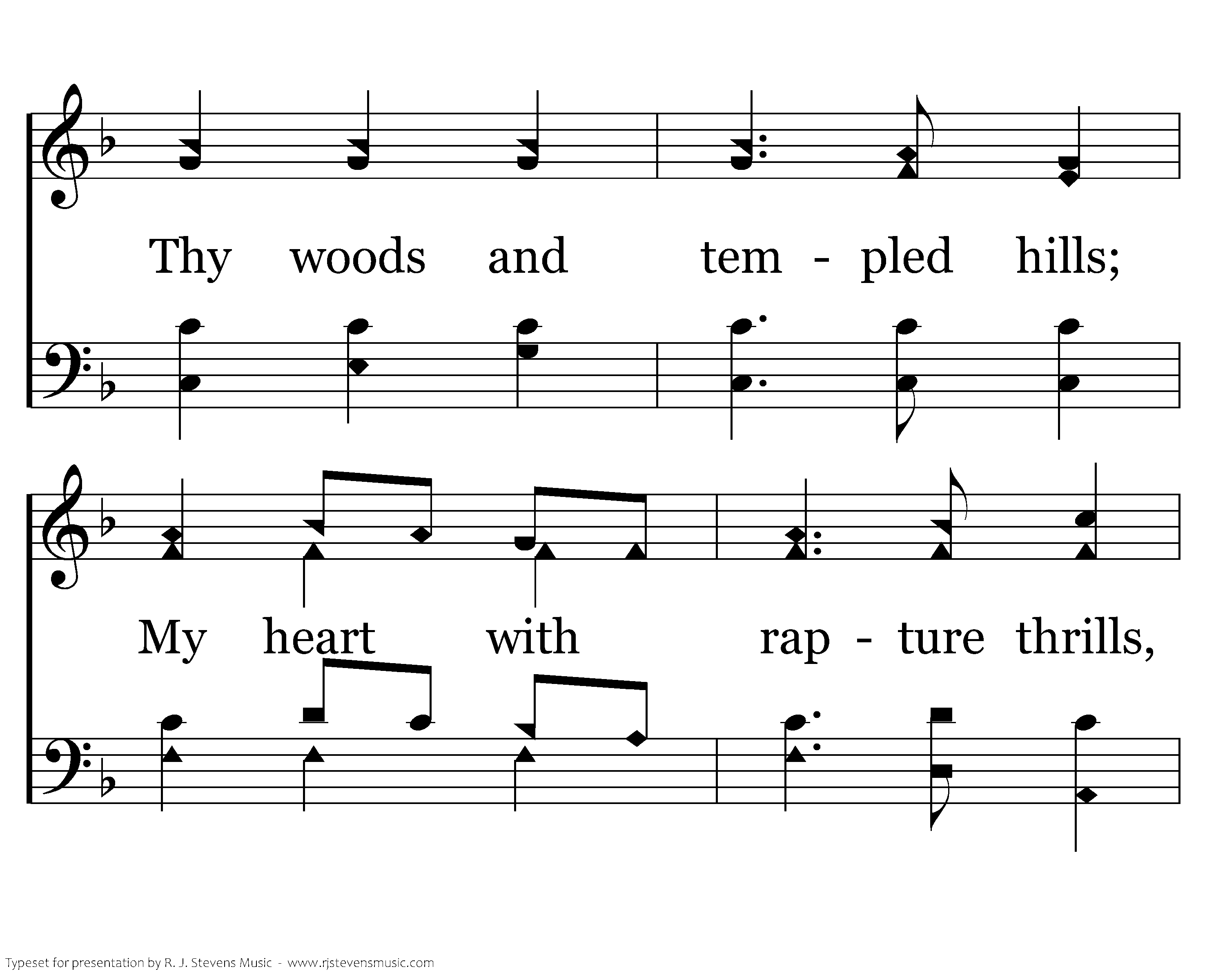 My native country, thee, Land of the noble free, Thy name I love; I love thy rocks and rills, Thy woods and templed hills;