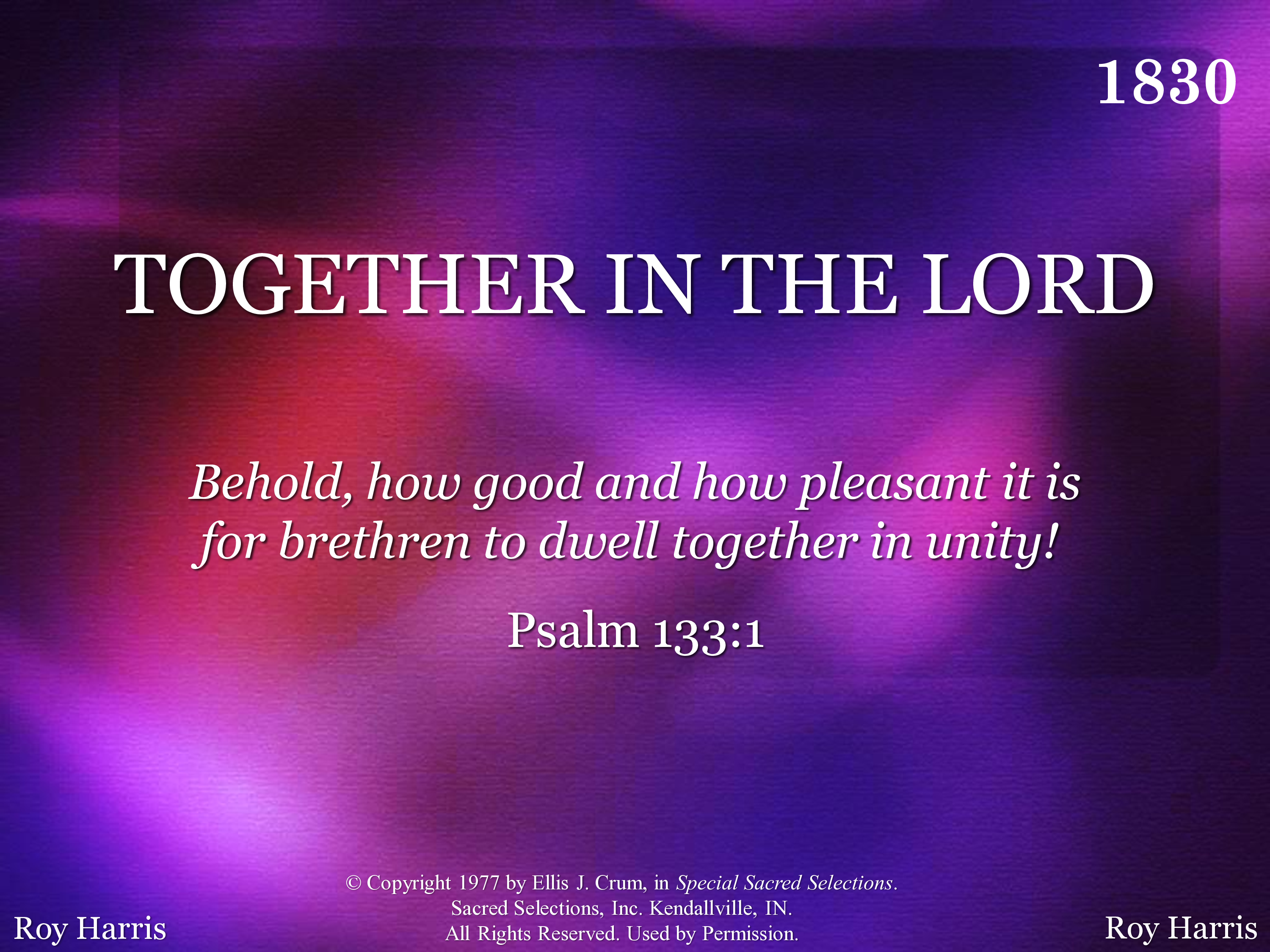 - © Copyright 1977 by Ellis J. Crum, in Special Sacred Selections. Sacred Selections, Inc. Kendallville, IN. All Rights Reserved. Used by Permission.