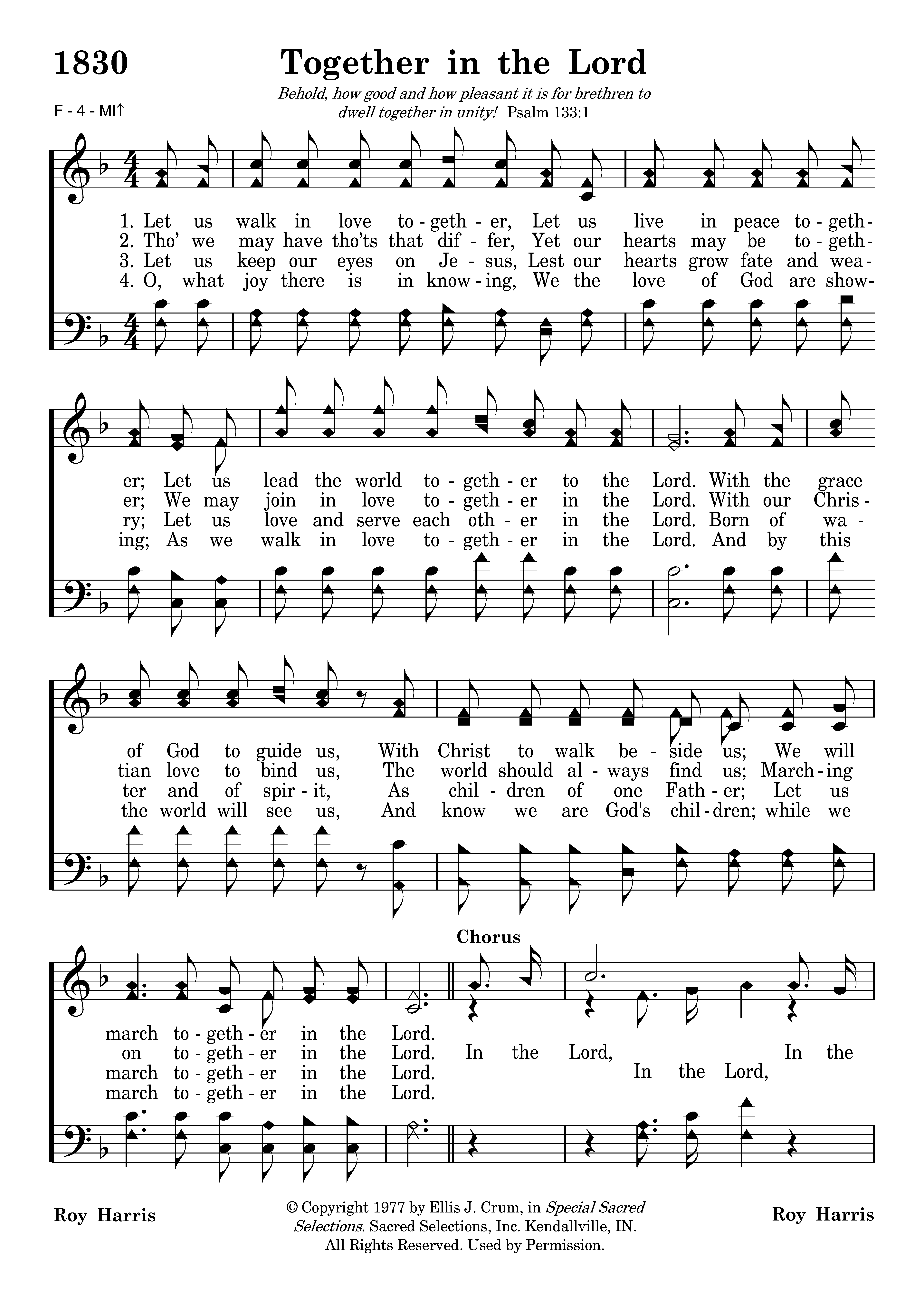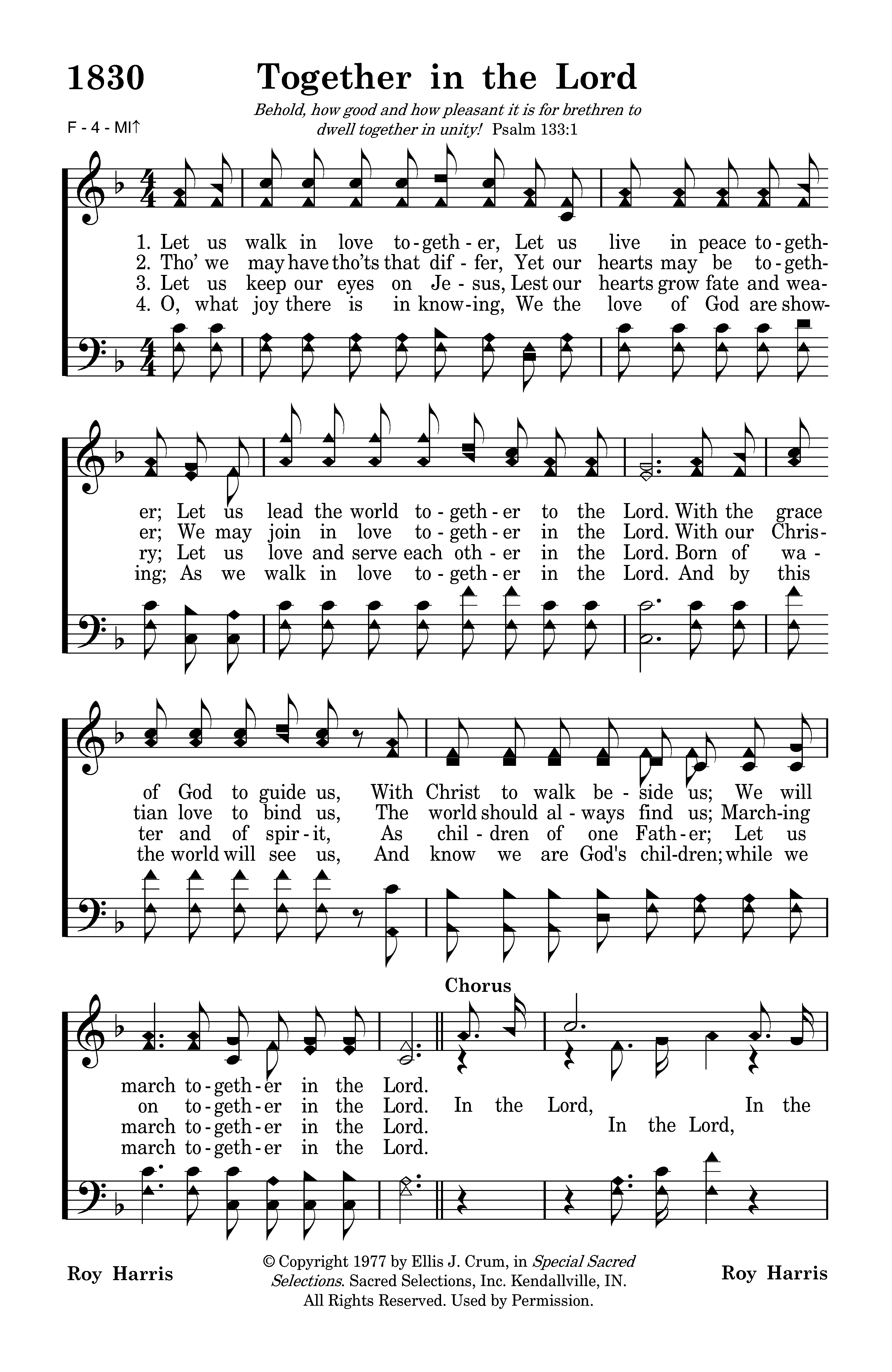 Let us walk in love together, Let us live in peace together; Let us lead the world together to the Lord. With the grace of God to guide us, With Christ to walk beside us; We will march together in the Lord.