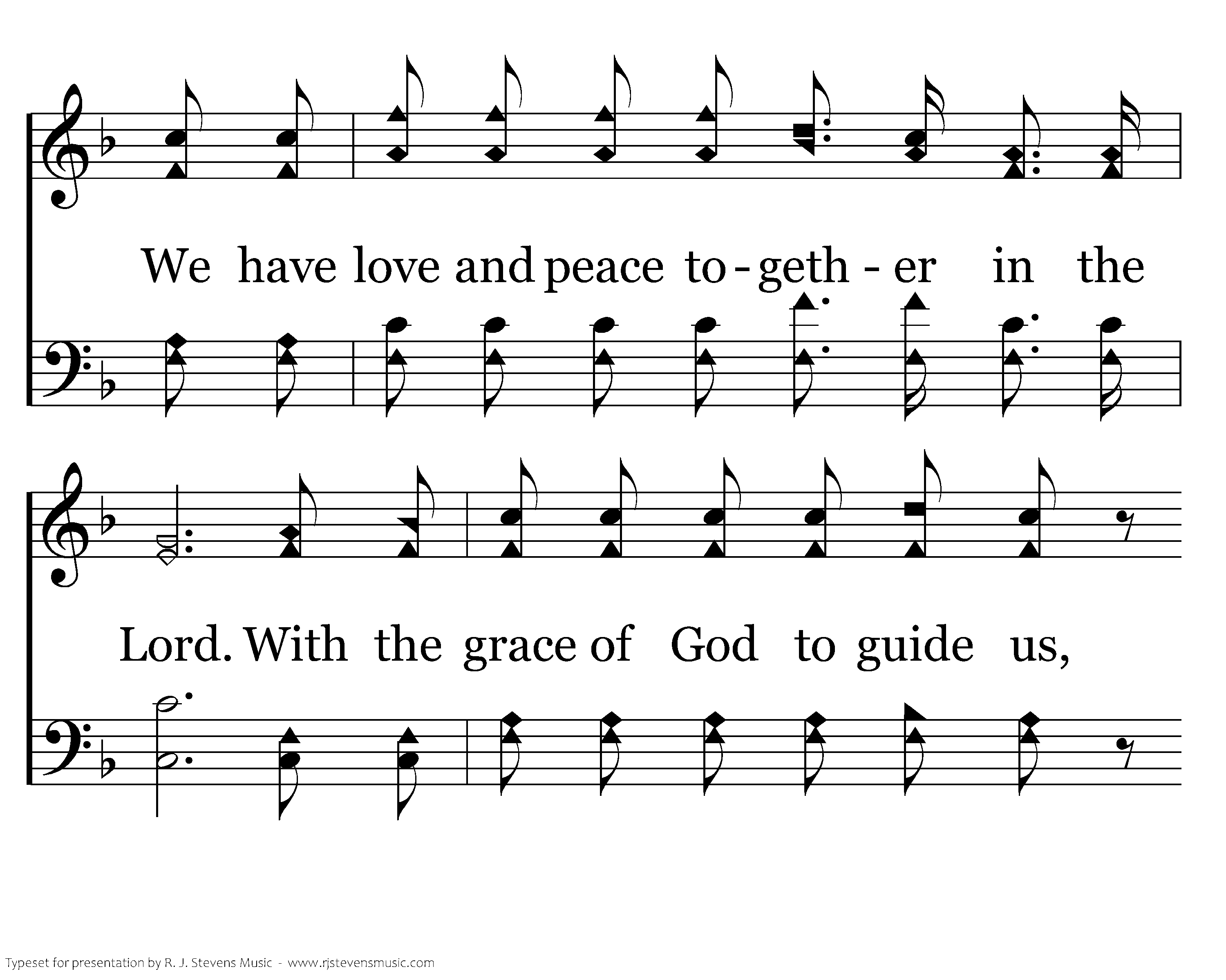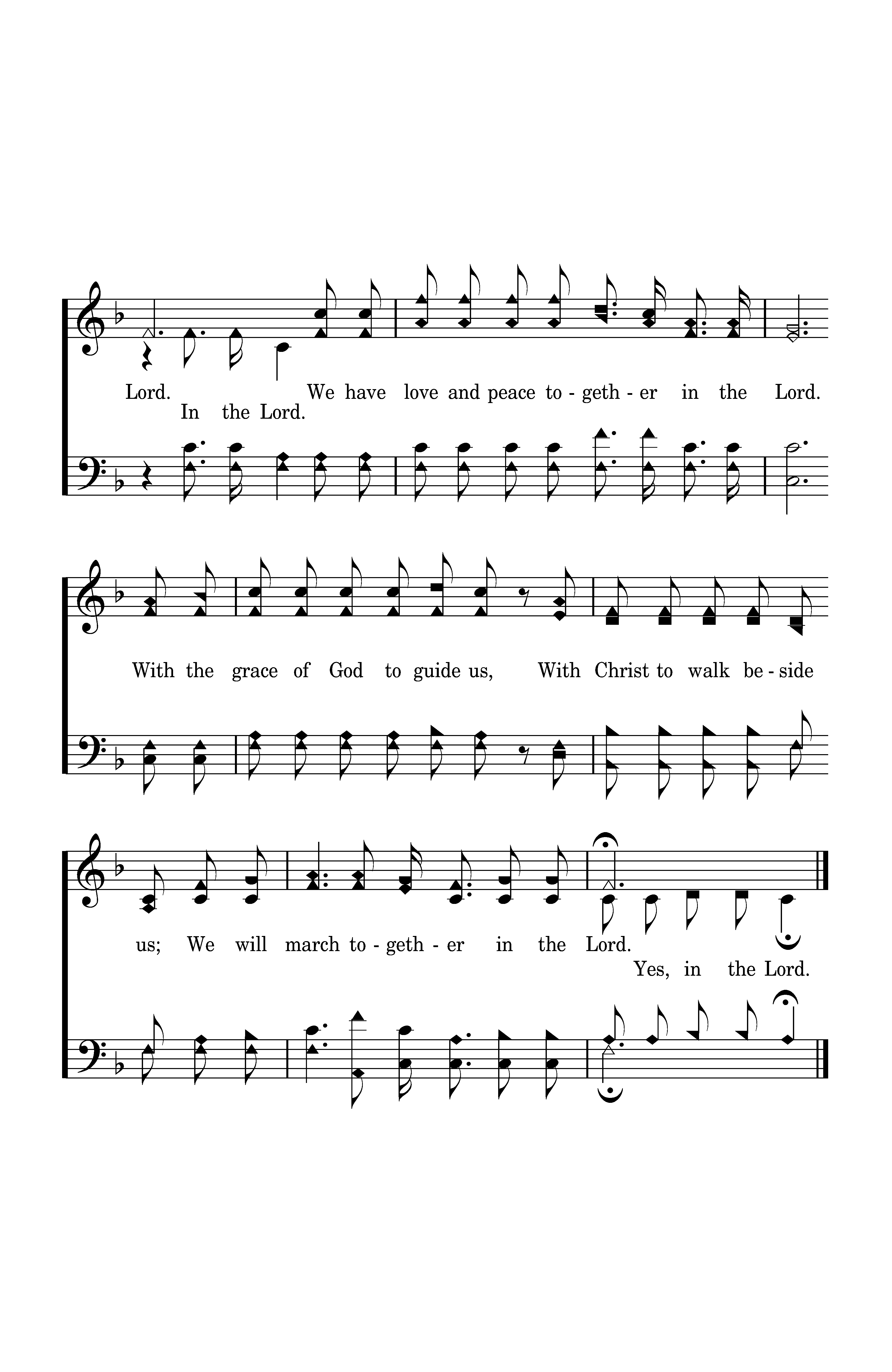 In the Lord, In the Lord. We have love and peace together in the Lord. With the grace of God to guide us, With Christ to walk beside us; We will march together in the Lord.