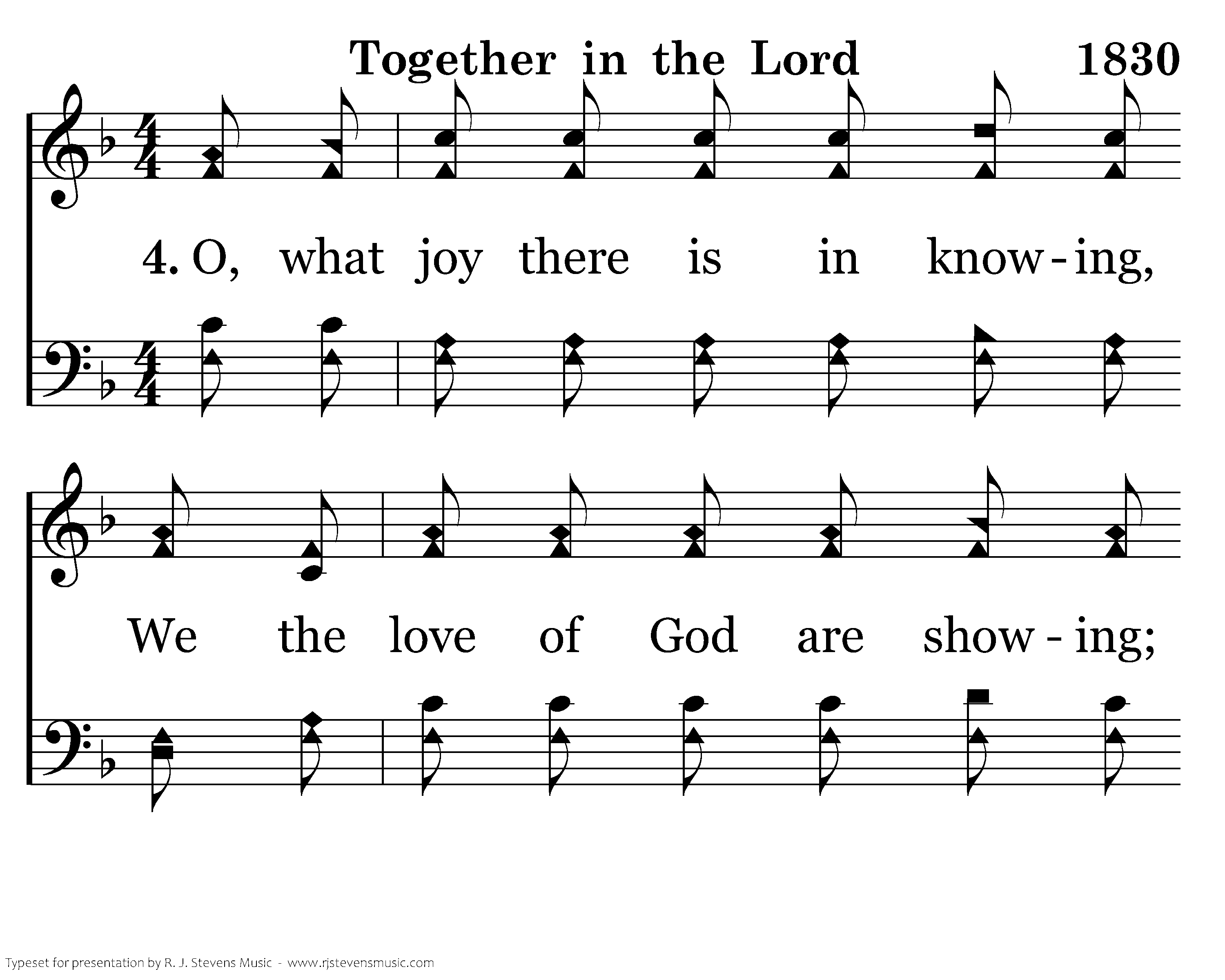 O, what joy there is in knowing, We the love of God are showing; As we walk in love together in the Lord. And by this the world will see us, And know we are God's children; while we march together in the Lord.