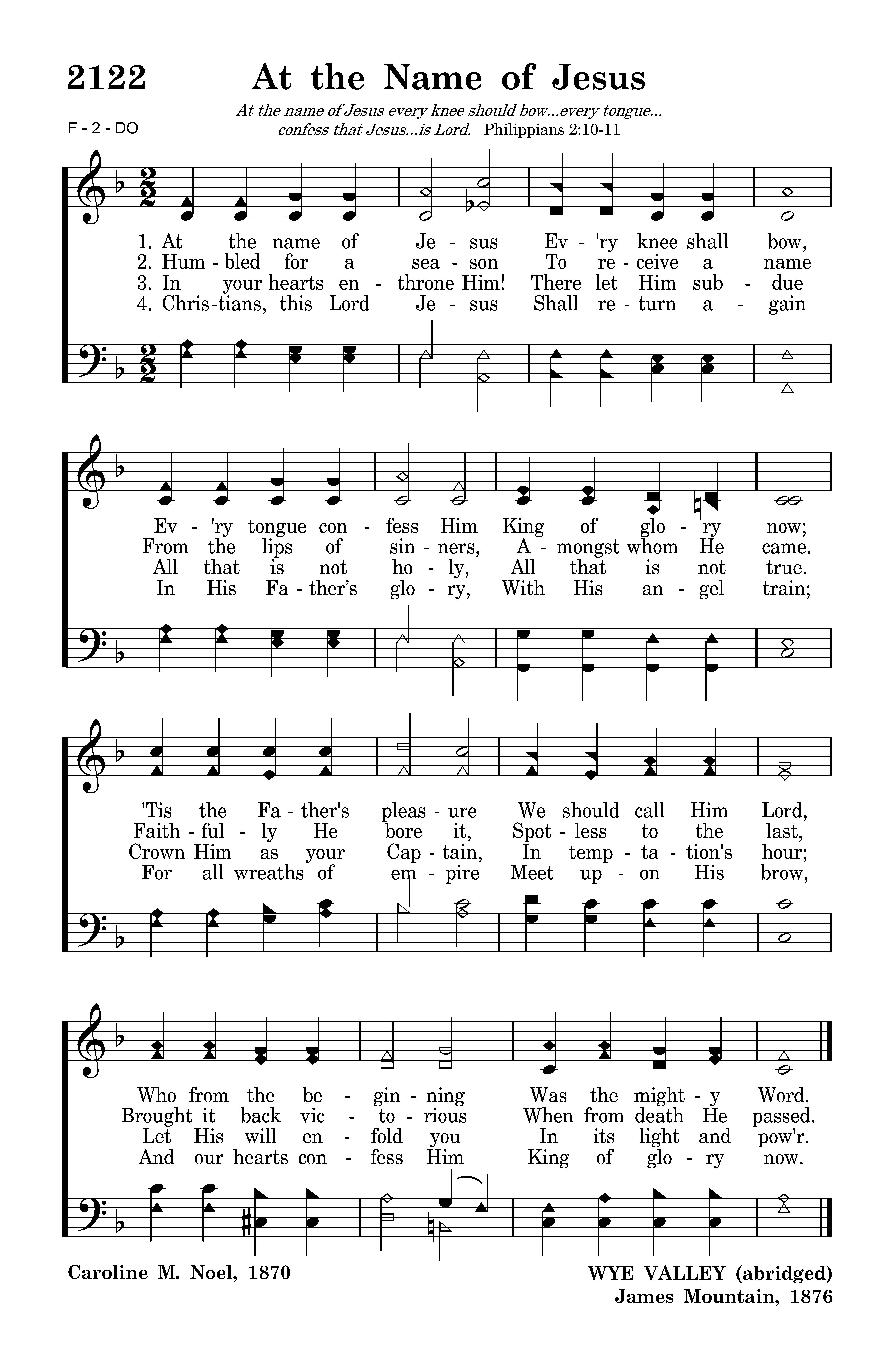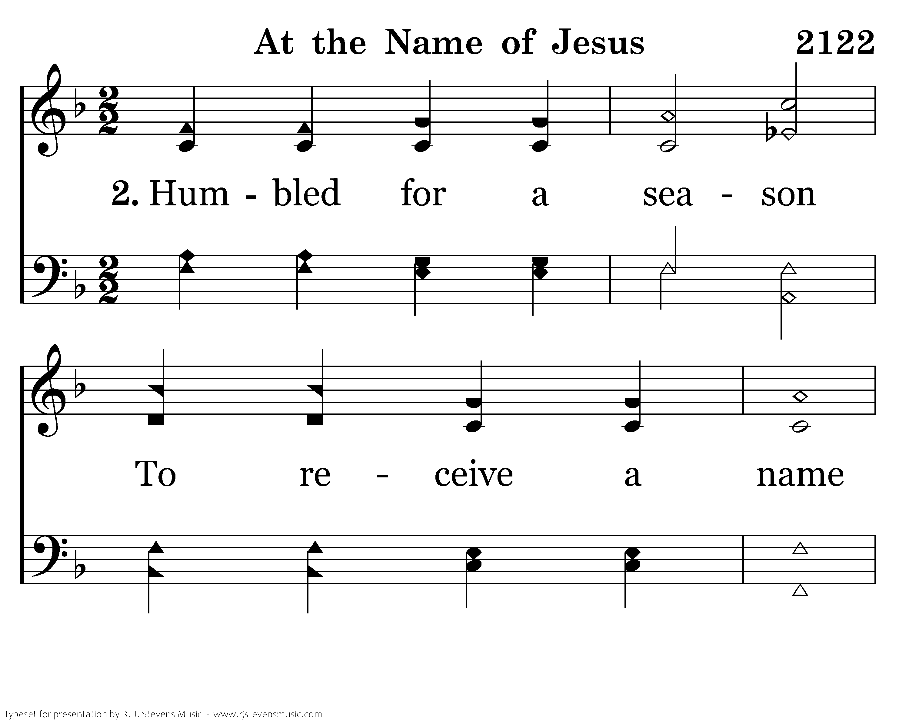Humbled for a season To receive a name From the lips of sinners, Amongst whom He came. Faithfully He bore it, Spotless to the last, Brought it back victorious When from death He passed.