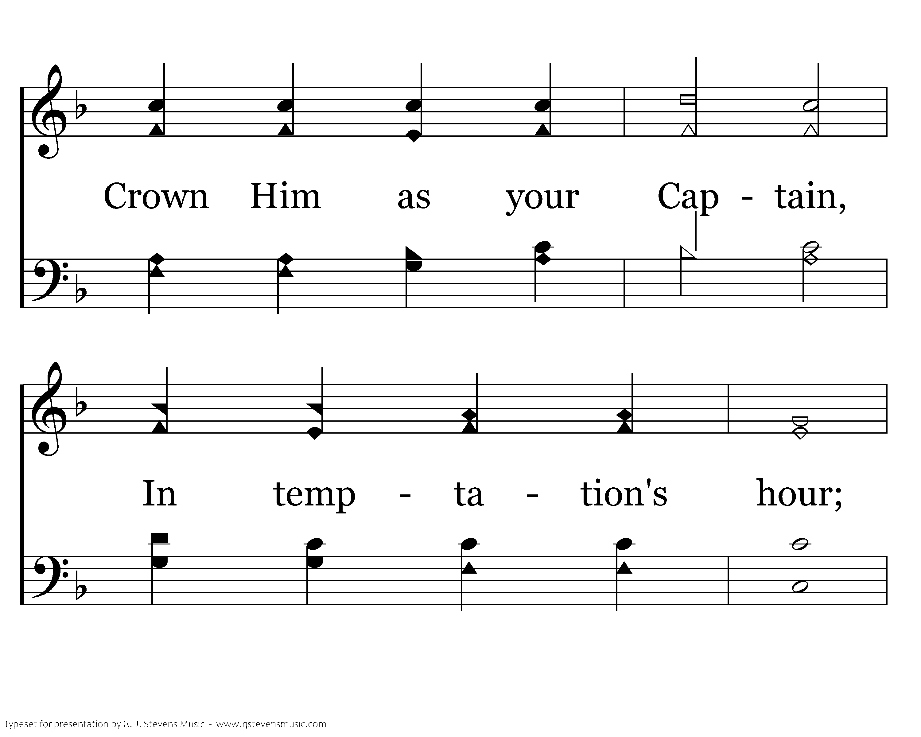 In your hearts enthrone Him! There let Him subdue All that is not holy, All that is not true. Crown Him as your Captain, In temptation's hour; Let His will enfold you In its light and pow'r.