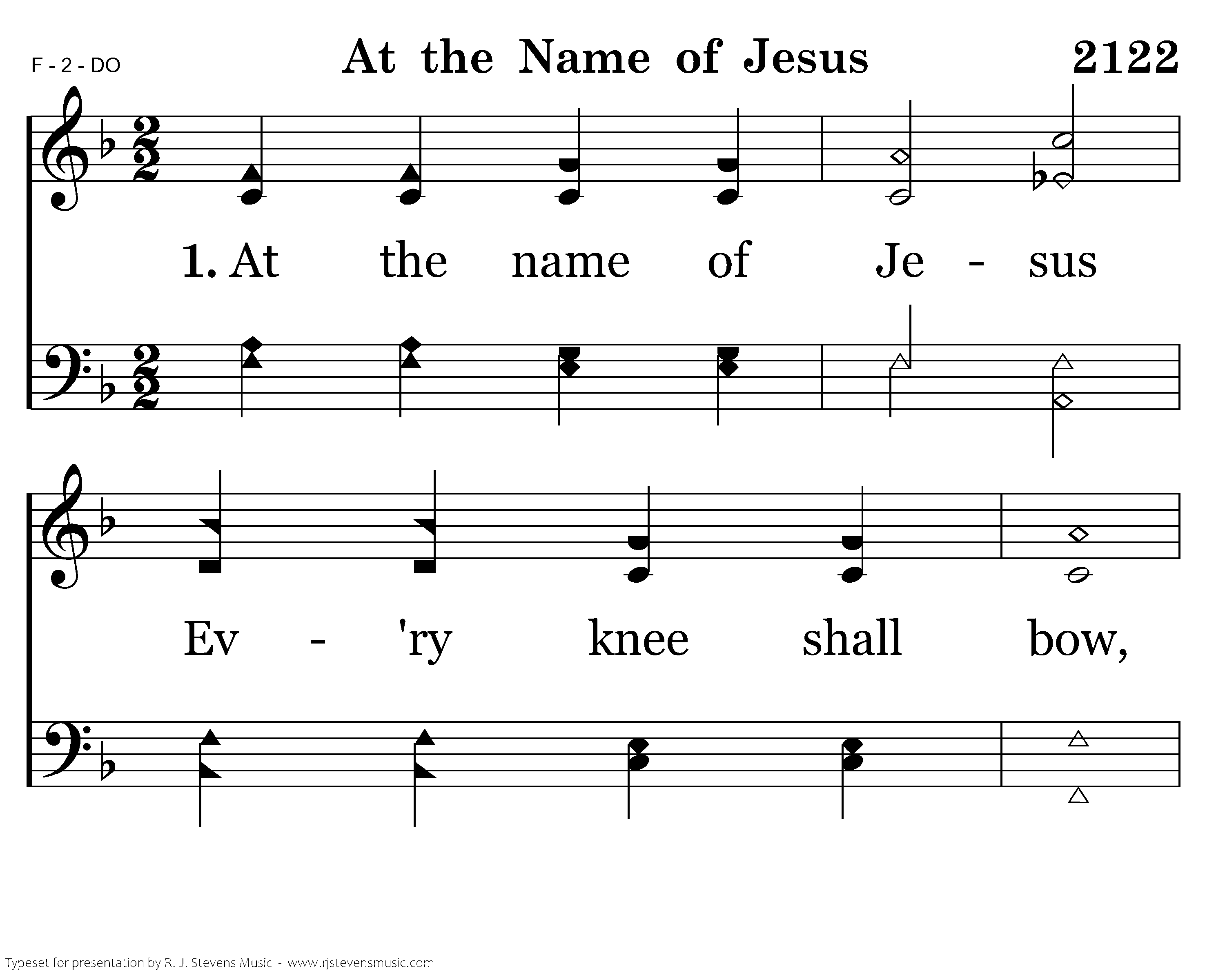At the name of Jesus Ev'ry knee shall bow, Ev'ry tongue confess Him King of glory now; 'Tis the Father's pleasure We should call Him Lord, Who from the beginning Was the mighty Word.