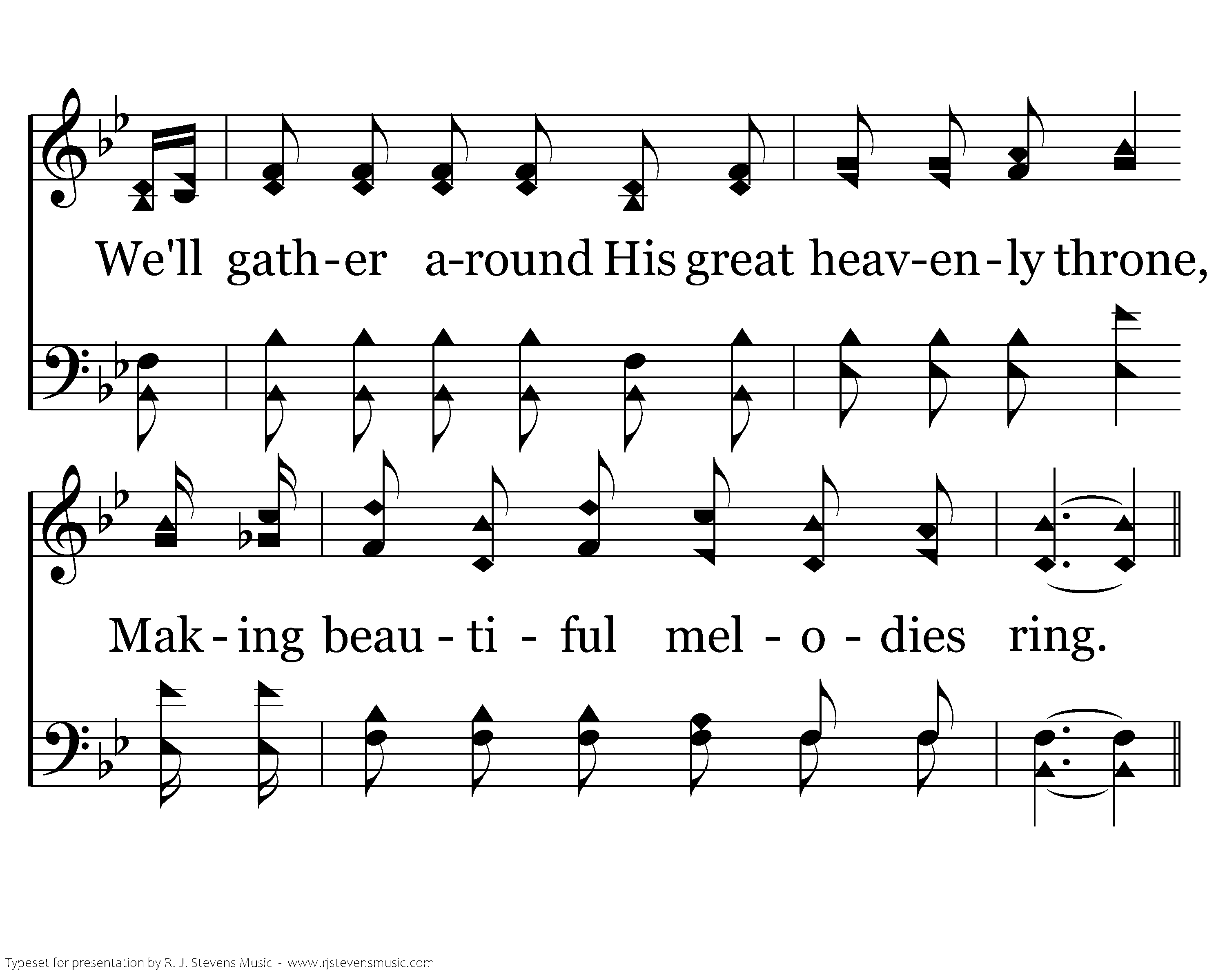 We'll praise and rejoice there forever and aye. The Lord of lords, King of all kings. We'll gather around His great heavenly throne, Making beautiful melodies ring.