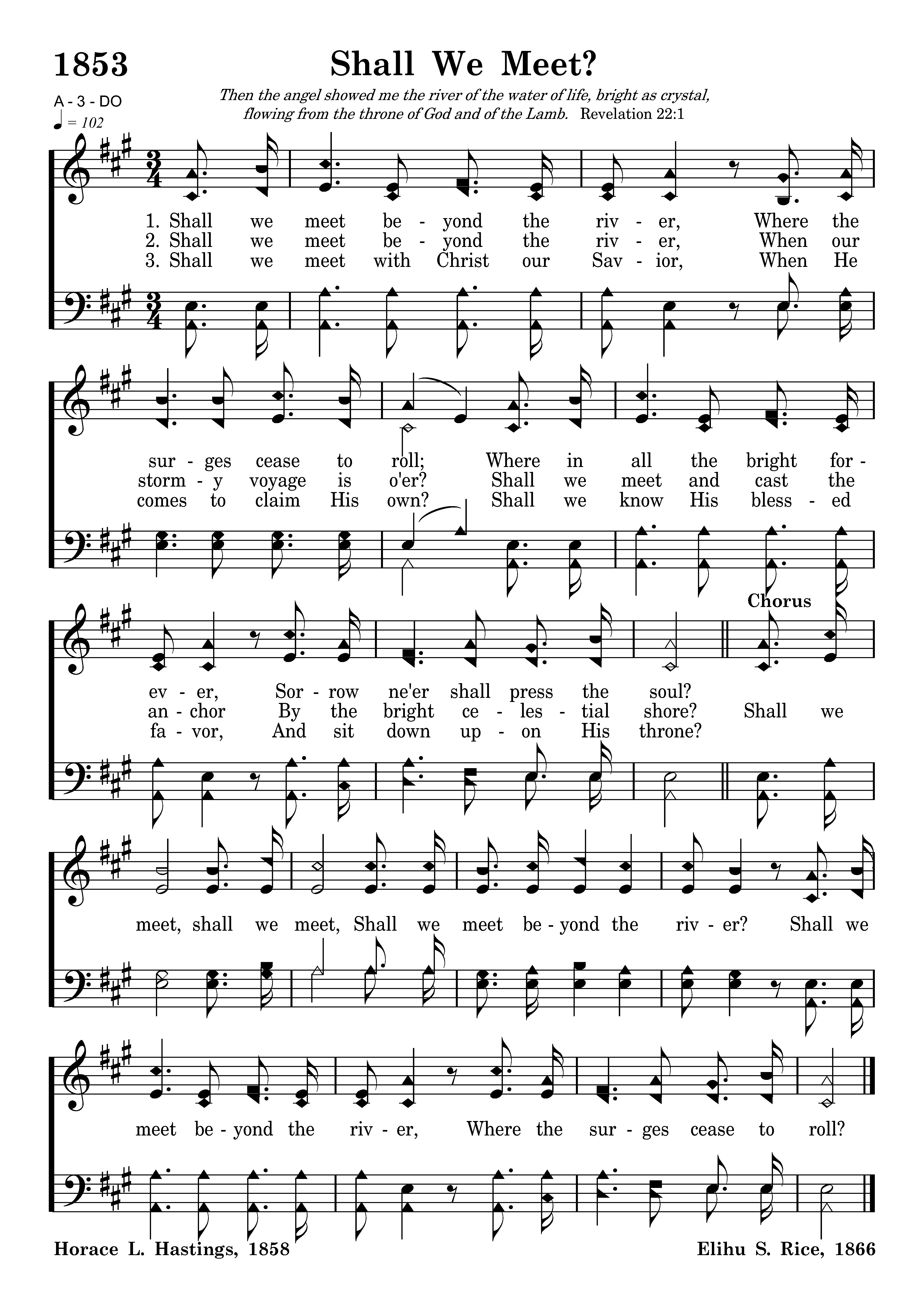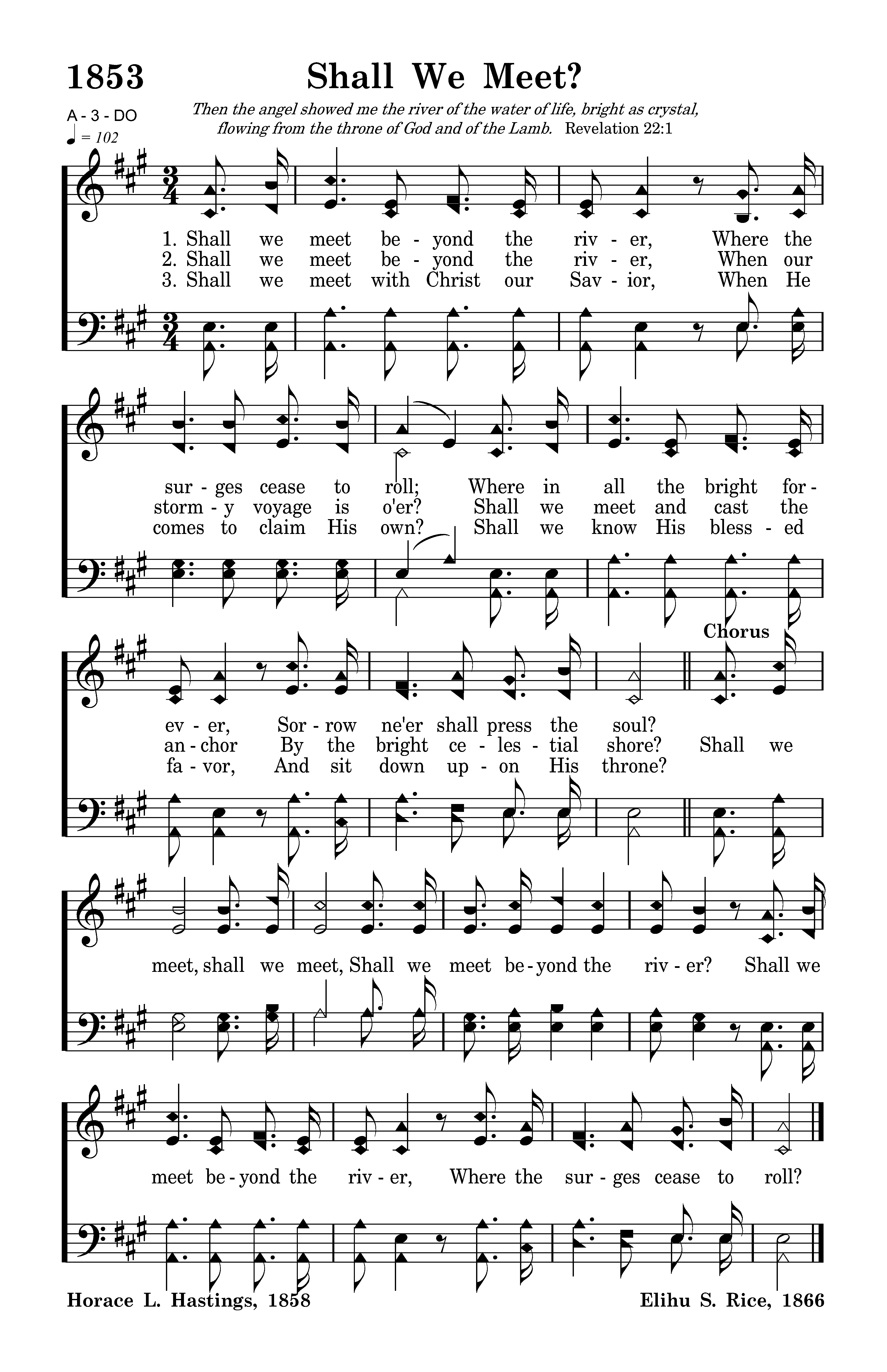 Shall we meet beyond the river, When our stormy voyage is o'er? Shall we meet and cast the anchor By the bright celestial shore?