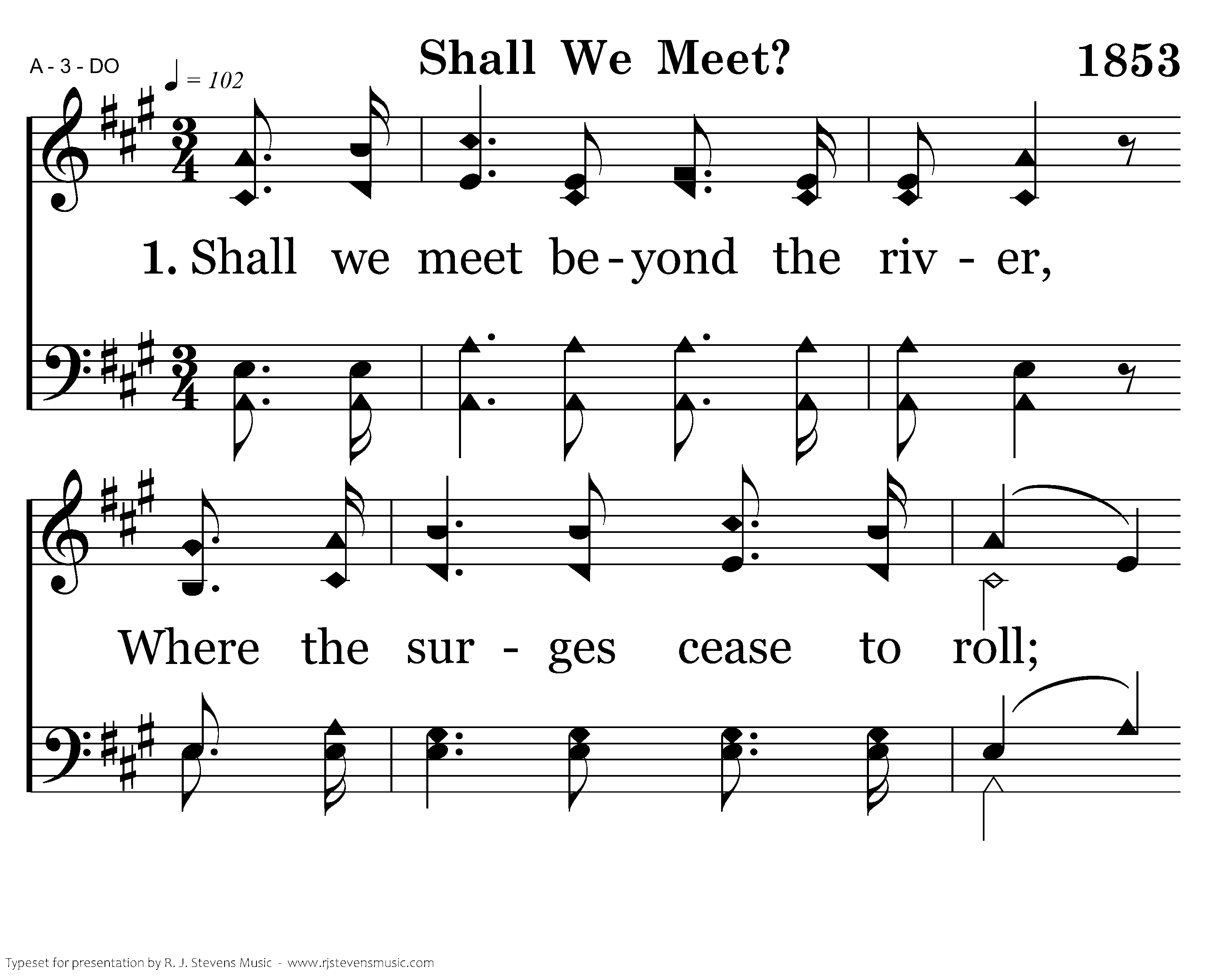 Shall we meet, shall we meet, Shall we meet beyond the river? Shall we meet beyond the river, Where the surges cease to roll?