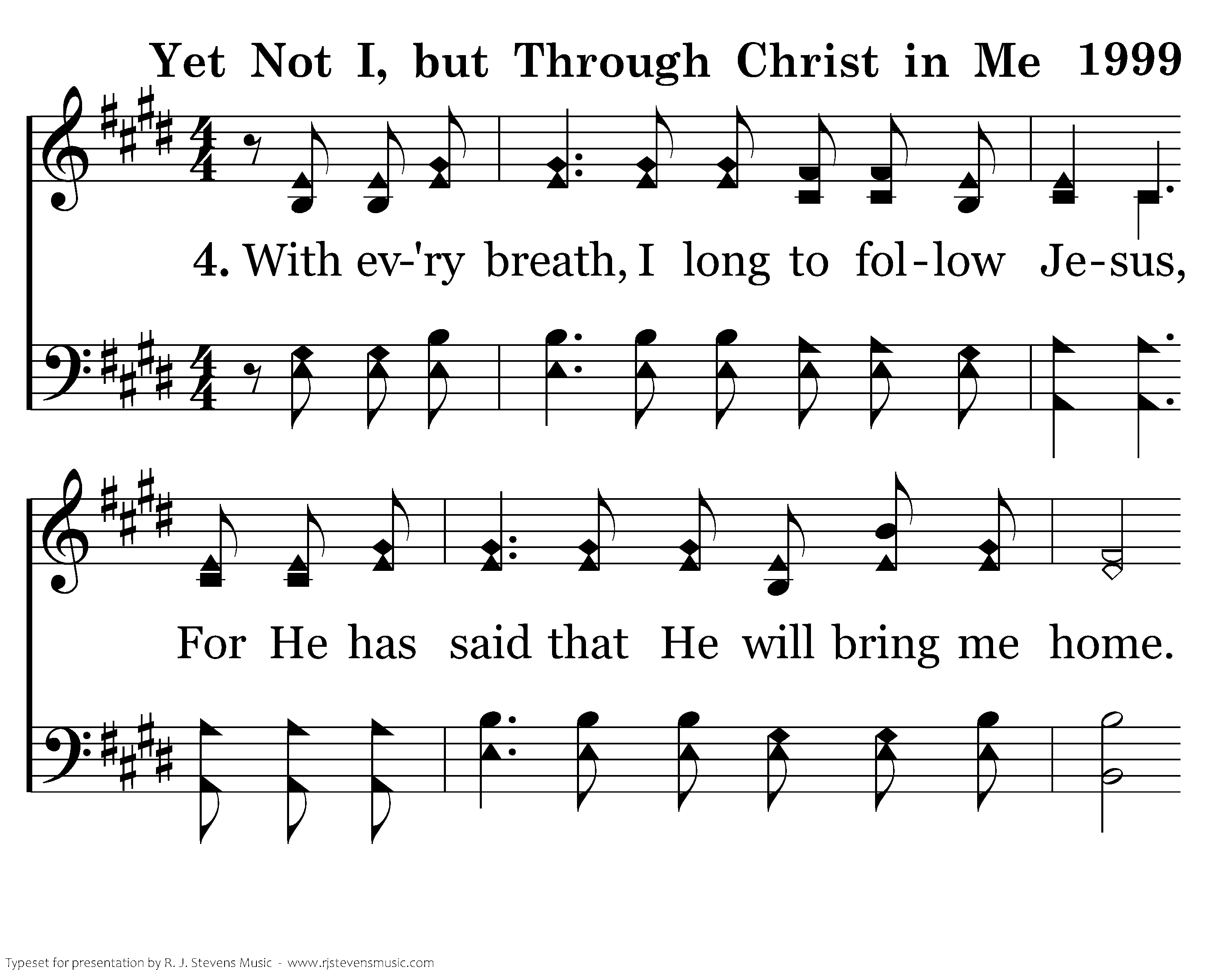With ev'ry breath, I long to follow Jesus, For He has said that He will bring me home. And day by day, I know He will renew me Until I stand with joy before the throne. To this I hold, my hope is only Jesus. All the glory evermore to Him. When the race is complete Still my lips shall repeat, "Yet not I, but through Christ in me."