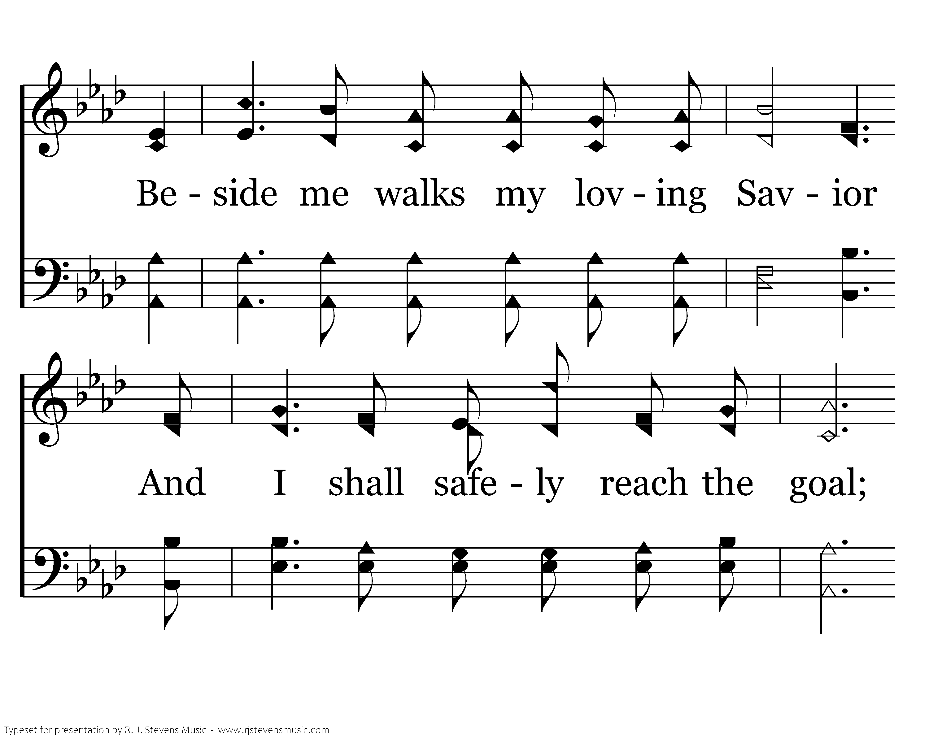 What matter if the way be thorny, Or if dark waves of sorrow roll? Beside me walks my loving Savior And I shall safely reach the goal; For me He bore the thorns and scoffing, It was for me He bled and died; ‘Tis sweet that I may share His sorrow And walk forever at His side.