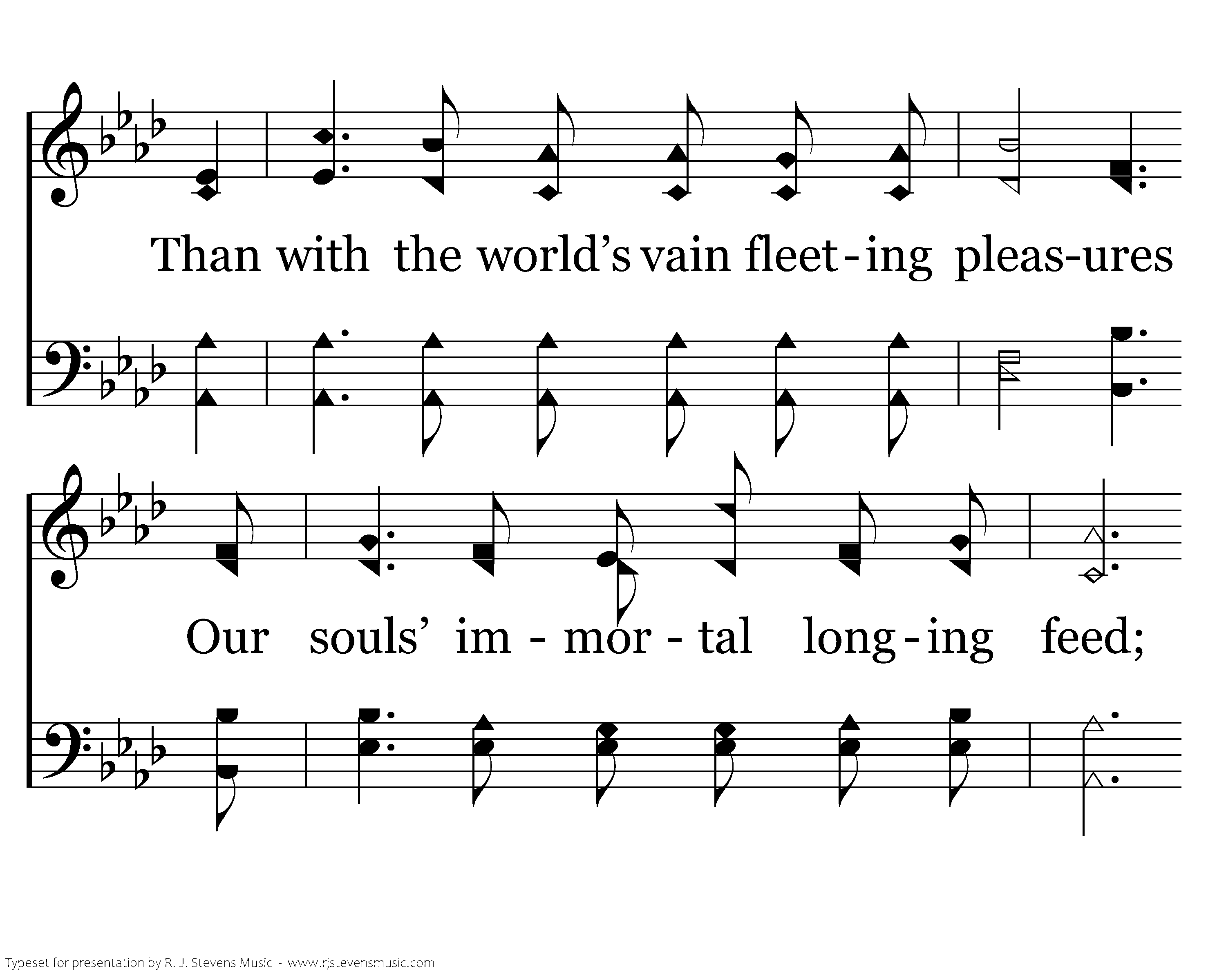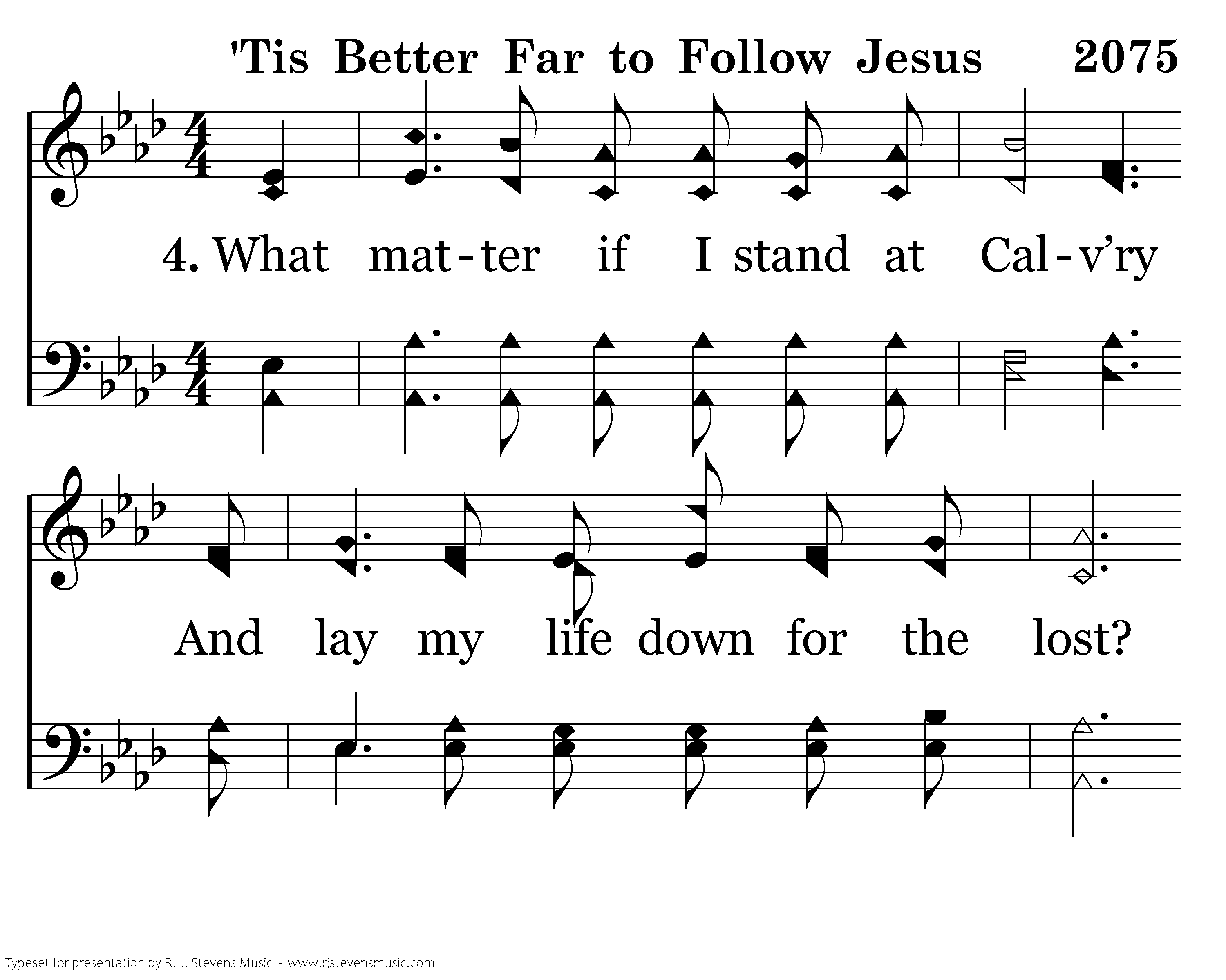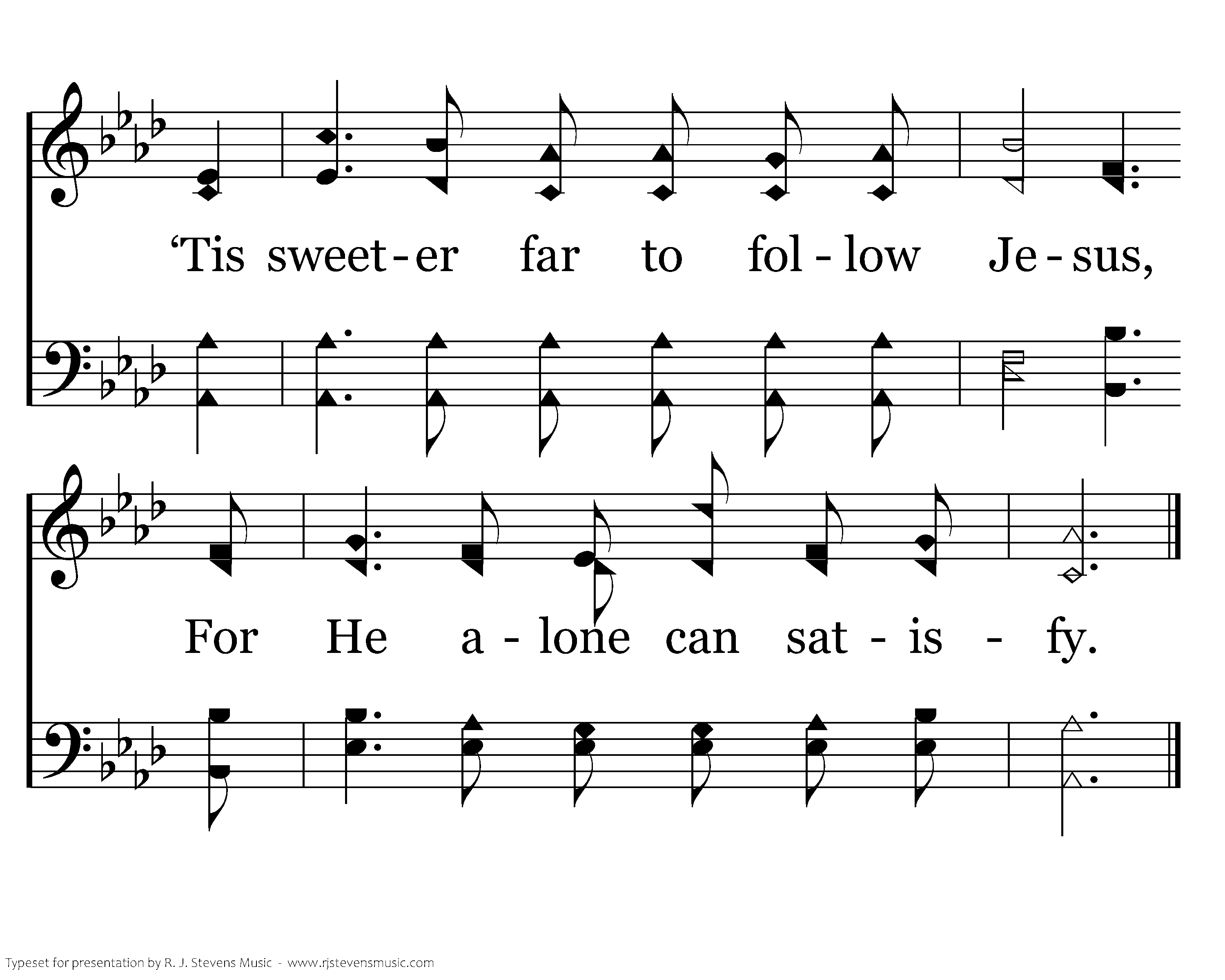‘Tis better far to follow Jesus No matter where His hand may lead; Than with the world’s vain fleeting pleasures Our souls’ immortal longing feed; For He has made us for His glory And His are joys that never die; ‘Tis sweeter far to follow Jesus,