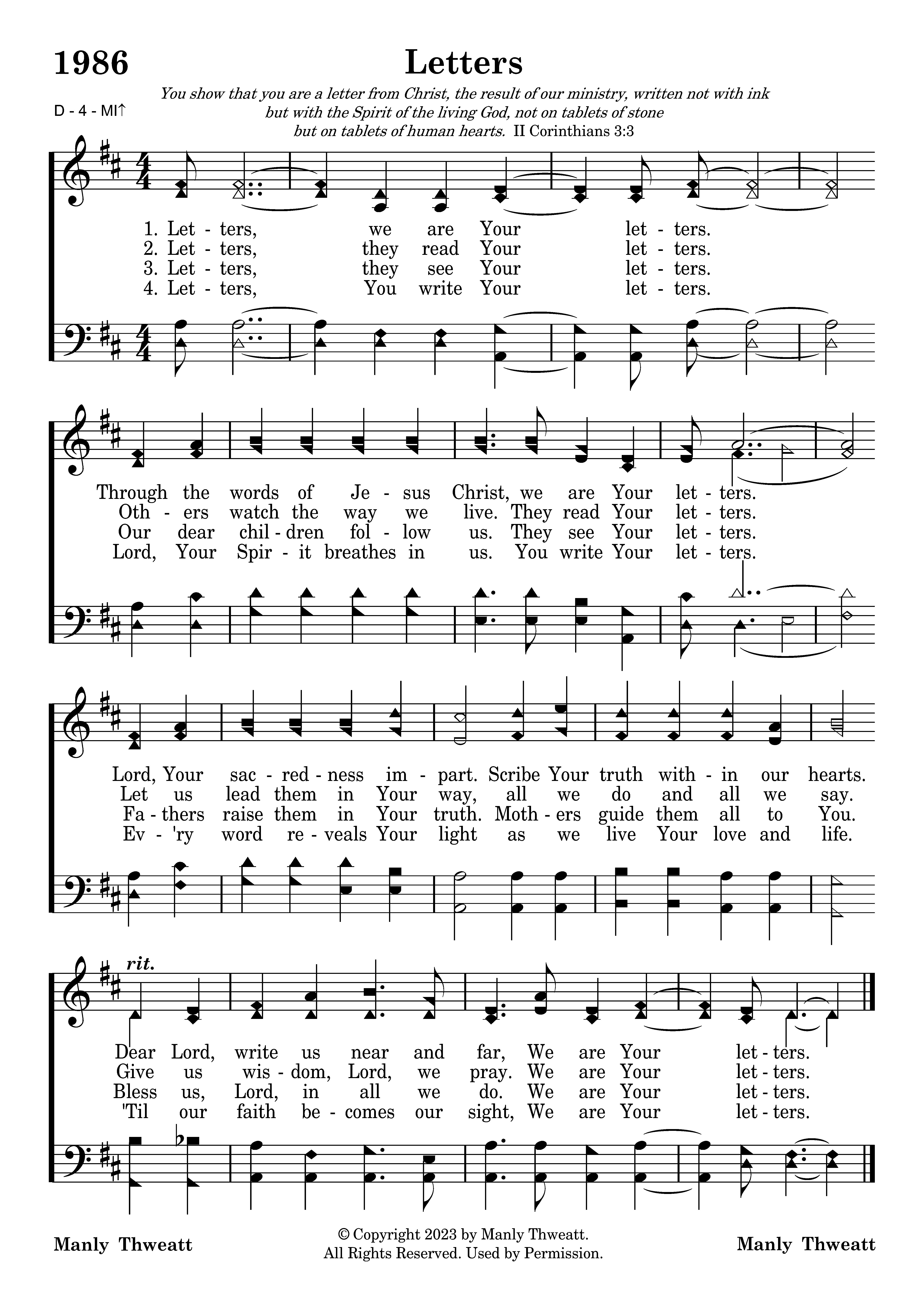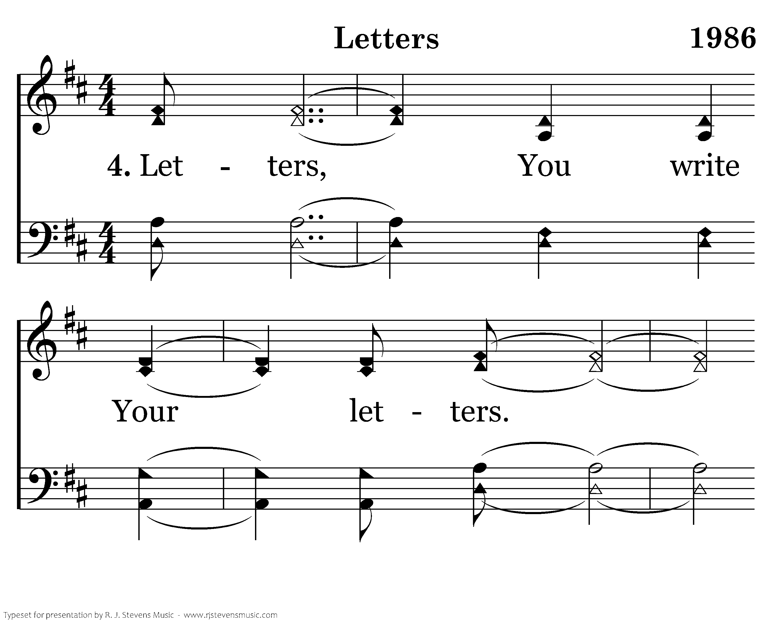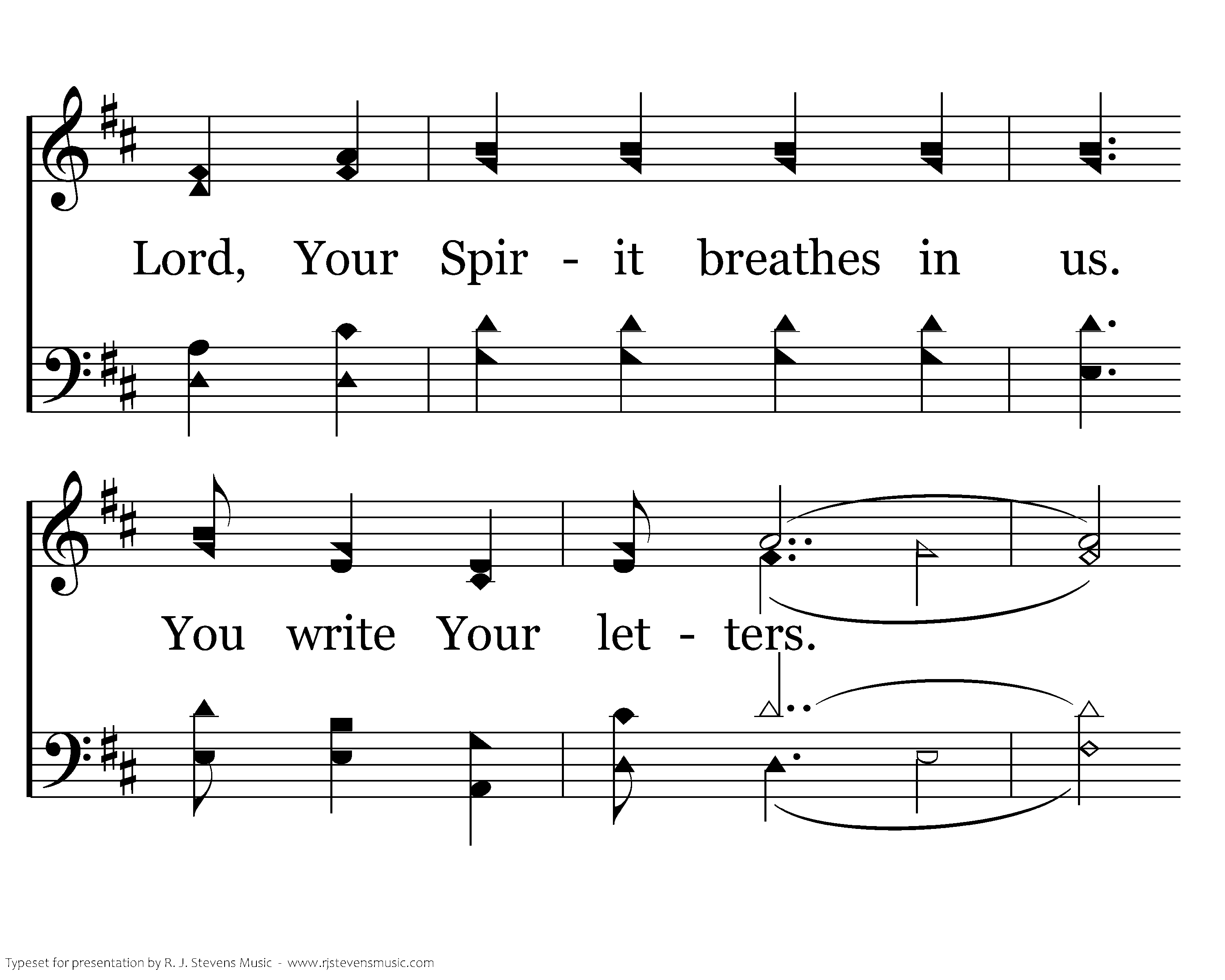 Letters, You write Your letters. Lord, Your Spirit breathes in us. You write Your letters. Ev'ry word reveals Your light as we live Your love and life. 'Til our faith becomes our sight, We are Your letters.
