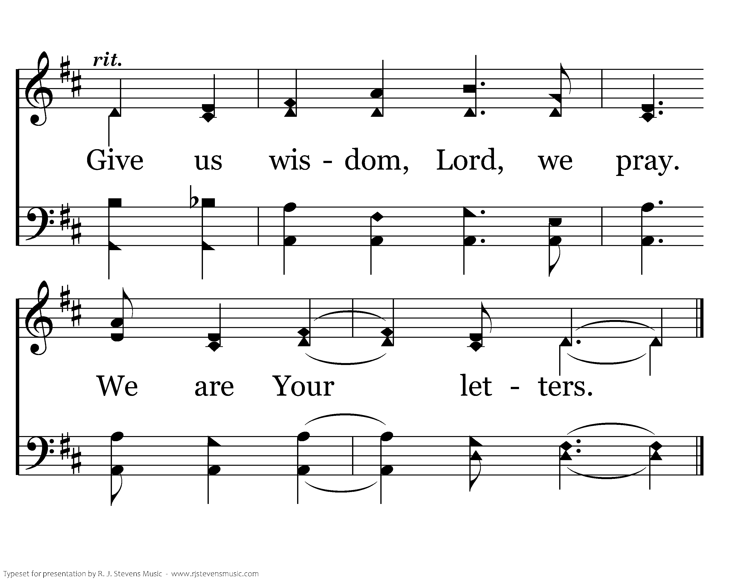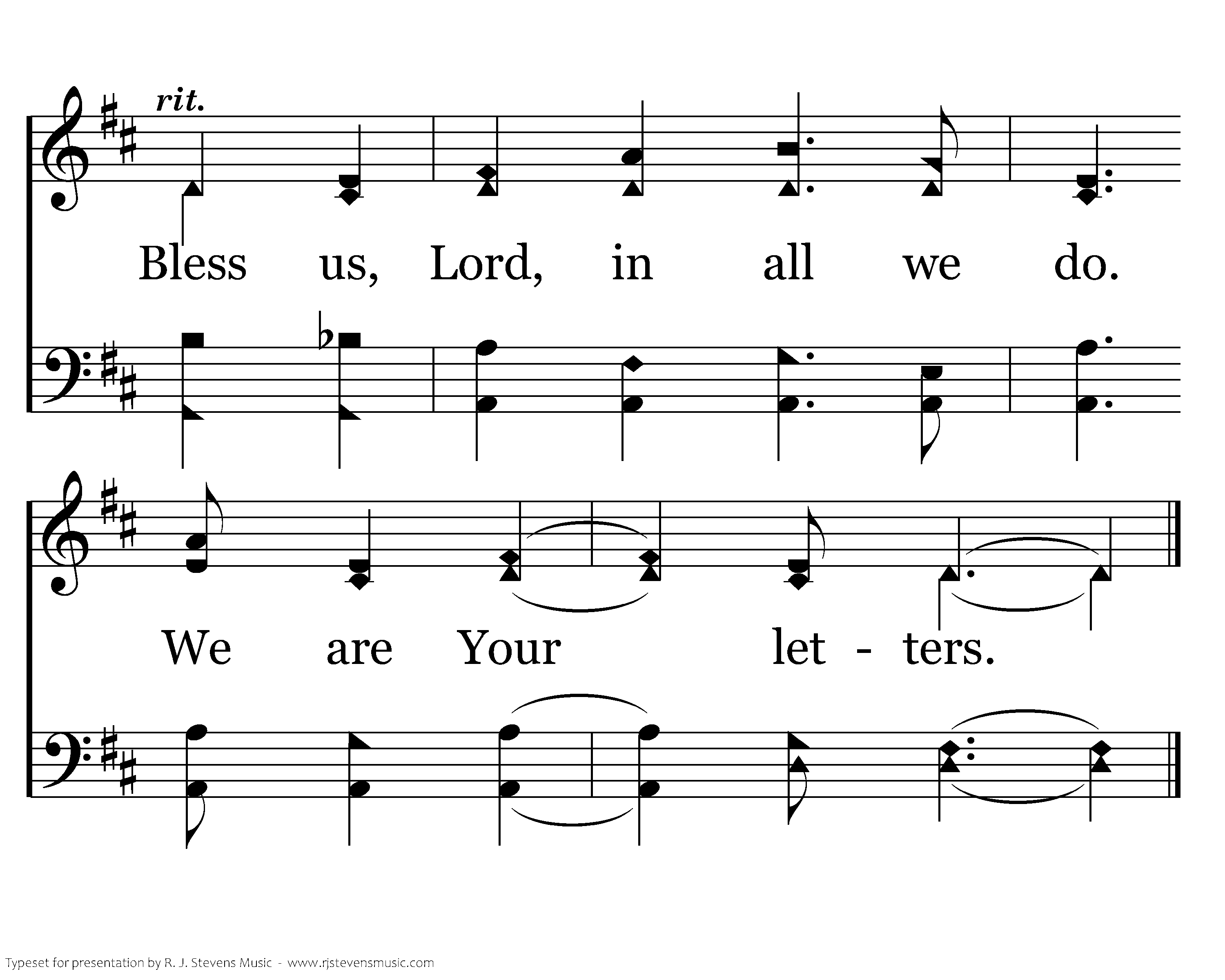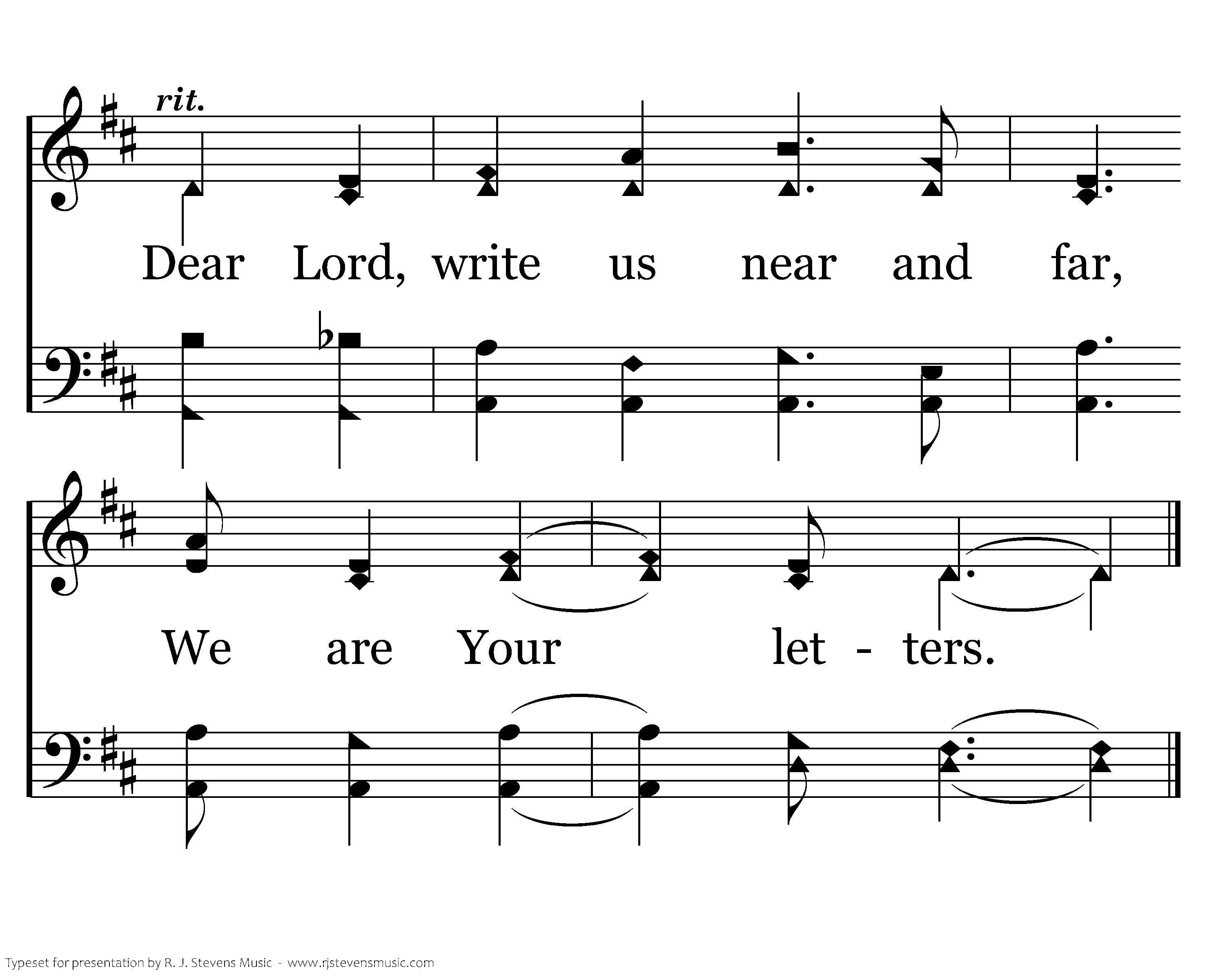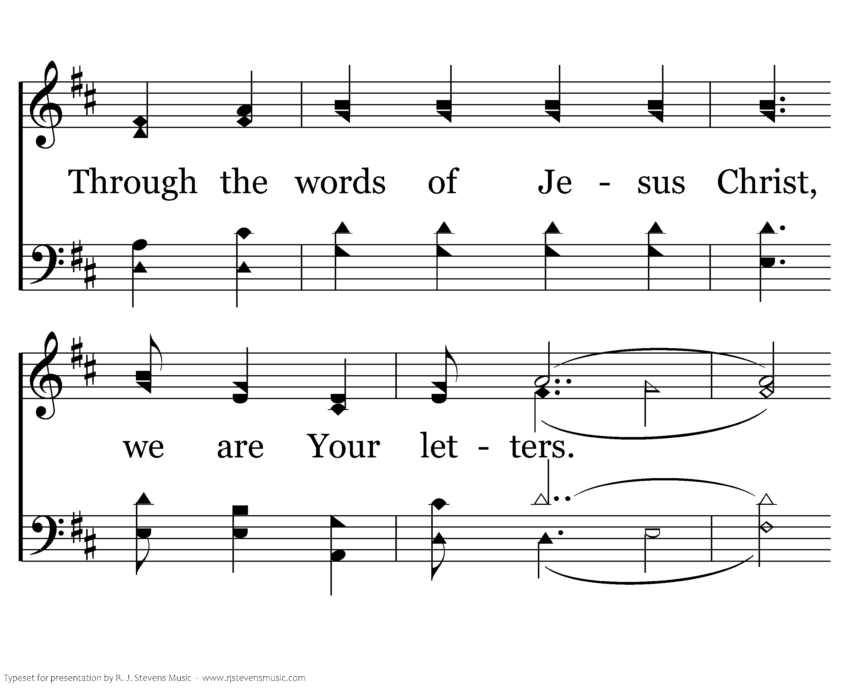 Letters, we are Your letters. Through the words of Jesus Christ, we are Your letters. Lord, Your sacredness impart. Scribe Your truth within our hearts. Dear Lord, write us near and far, We are Your letters.