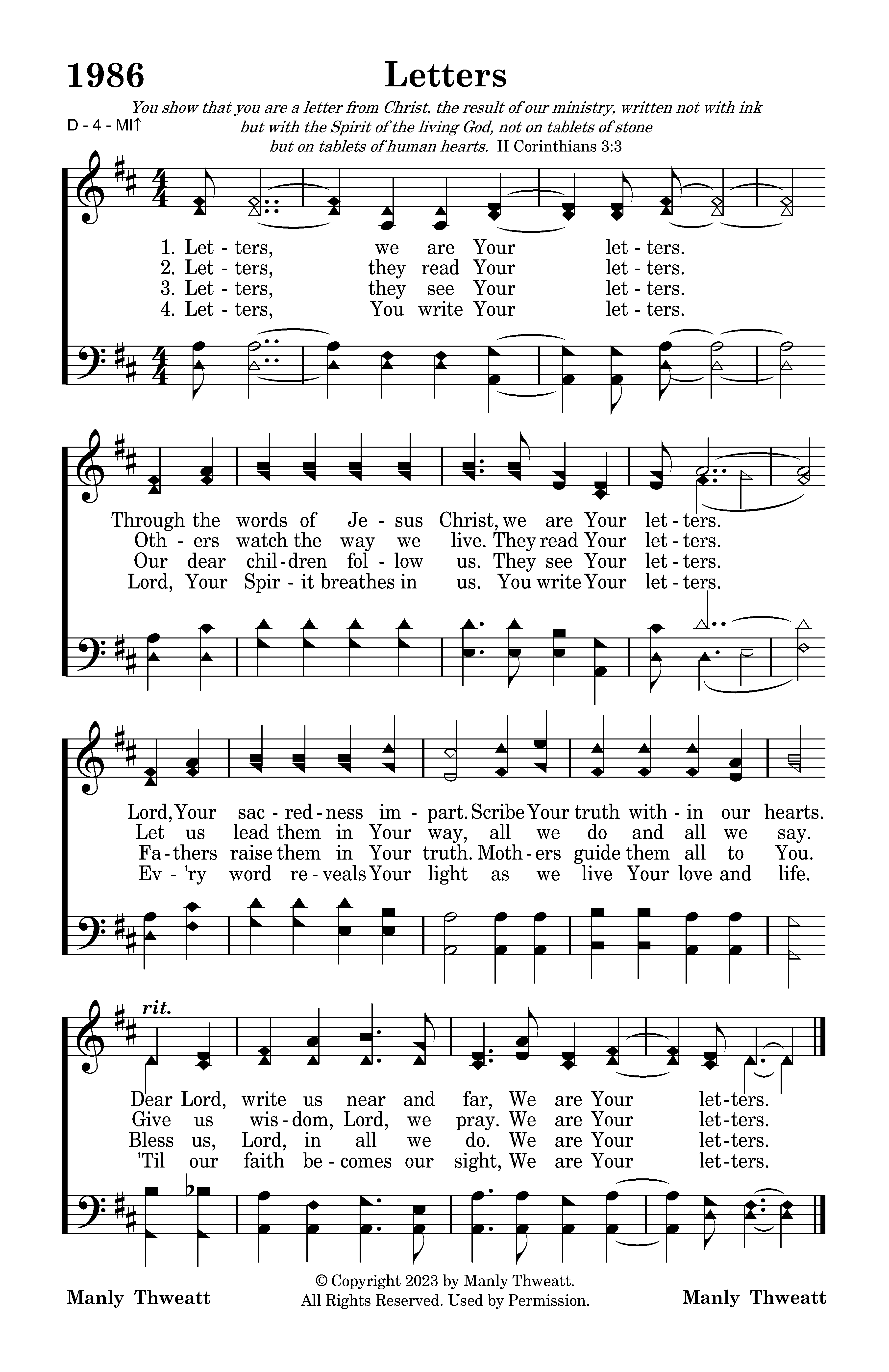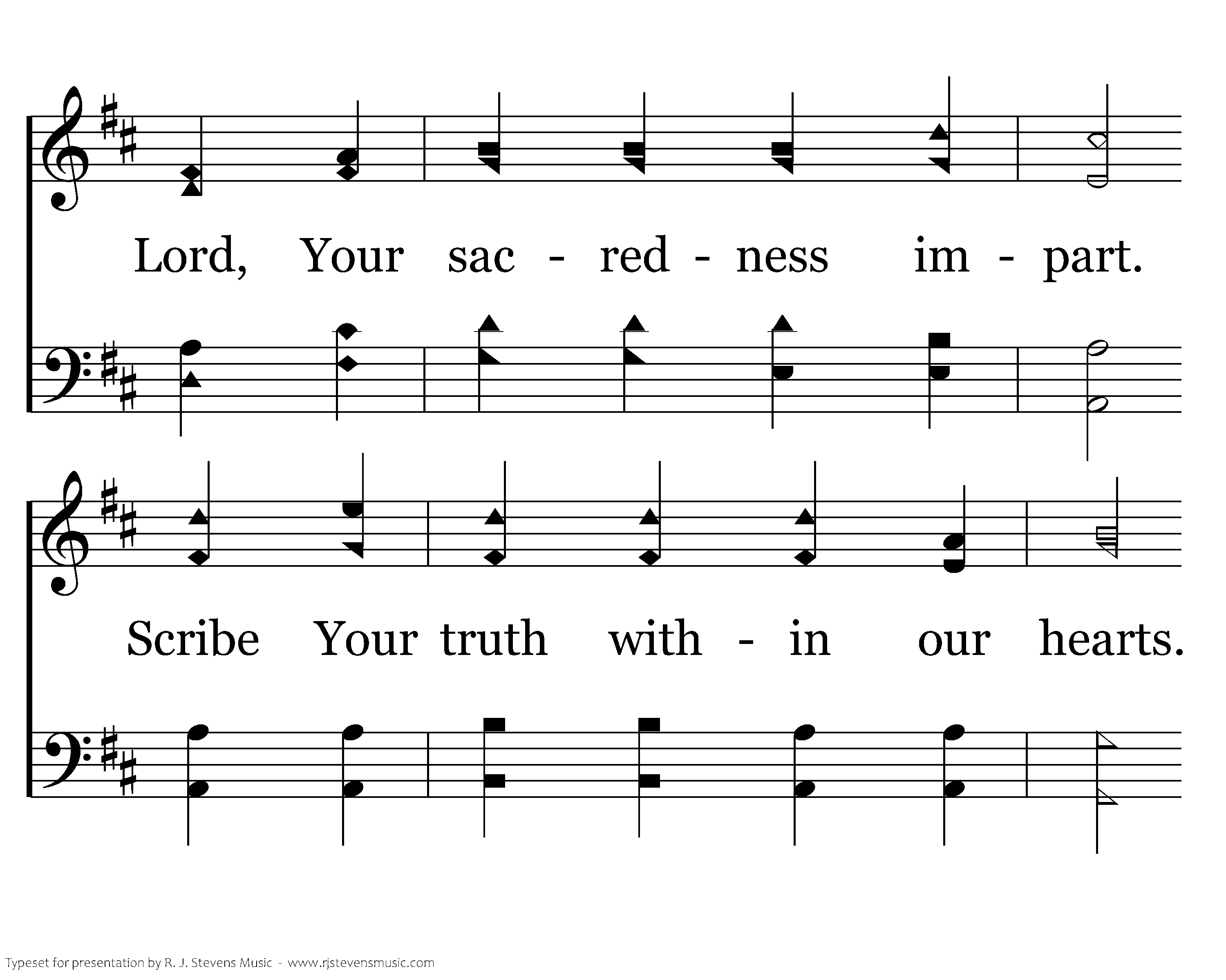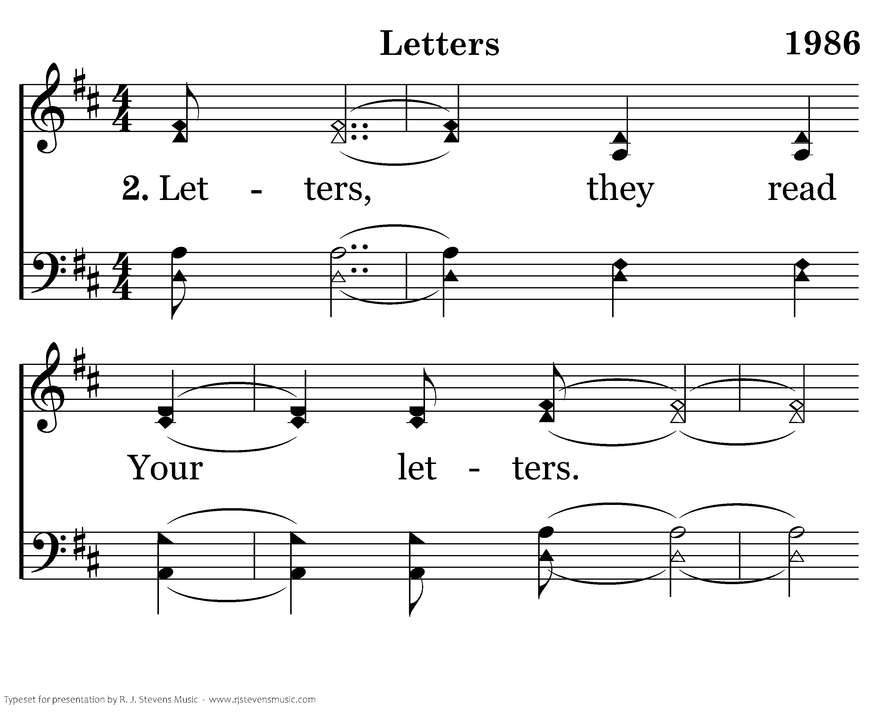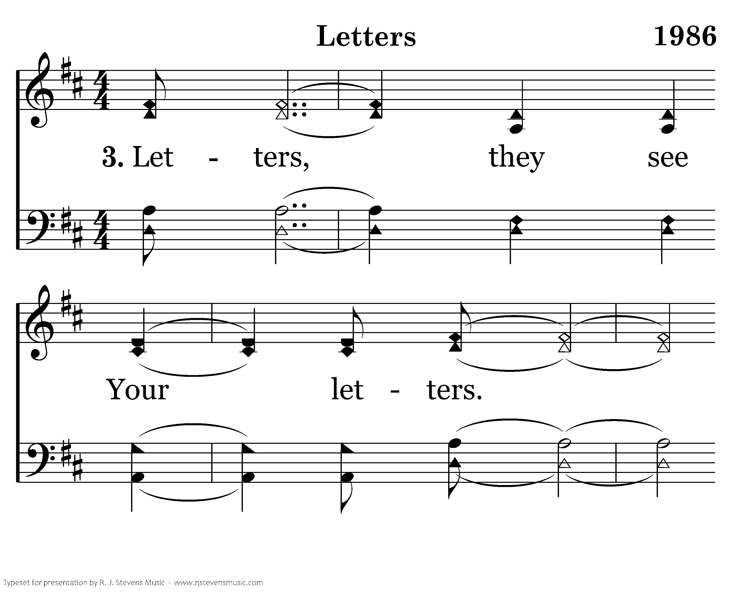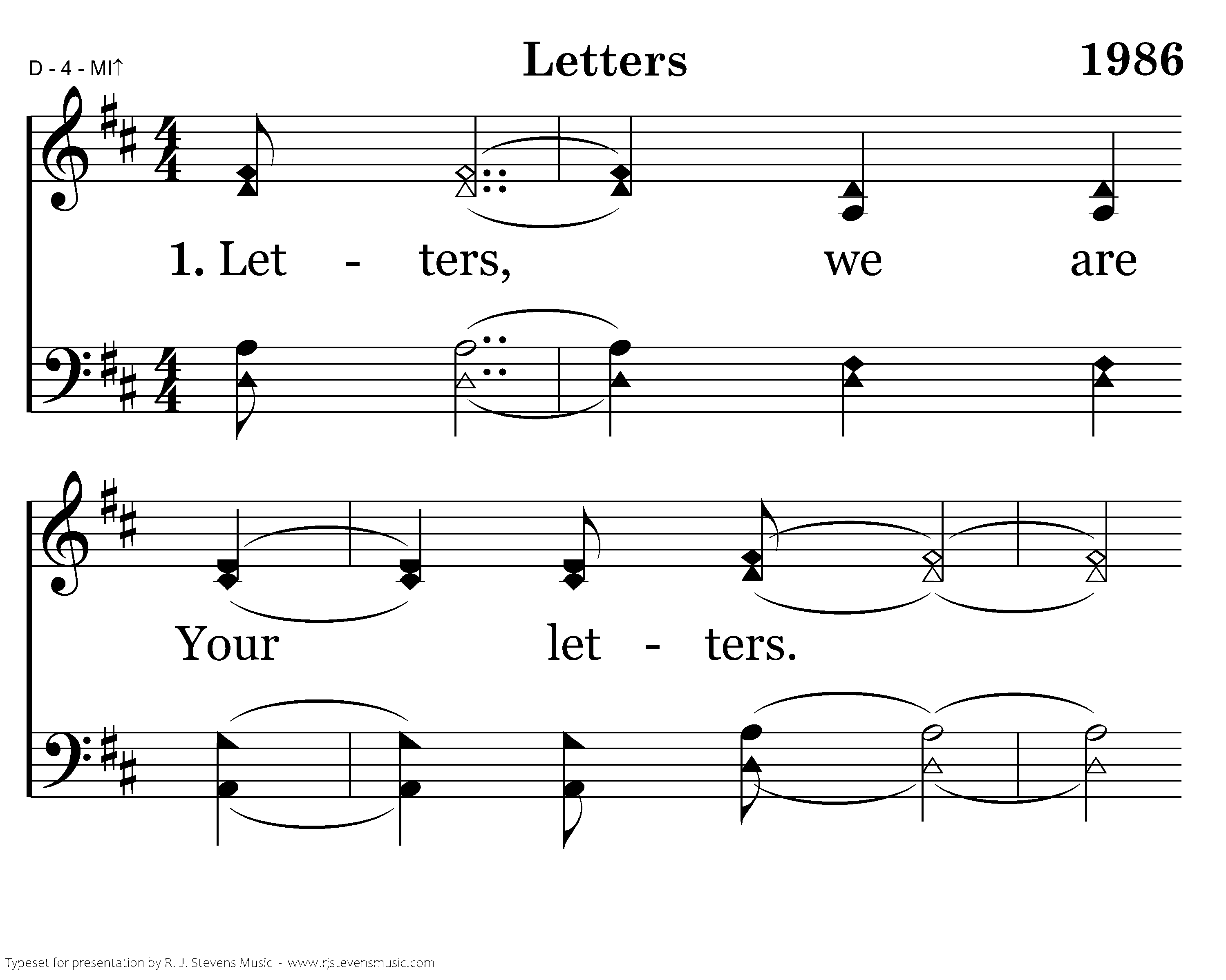 Letters, we are Your letters. Through the words of Jesus Christ, we are Your letters. Lord, Your sacredness impart. Scribe Your truth within our hearts. Dear Lord, write us near and far, We are Your letters.