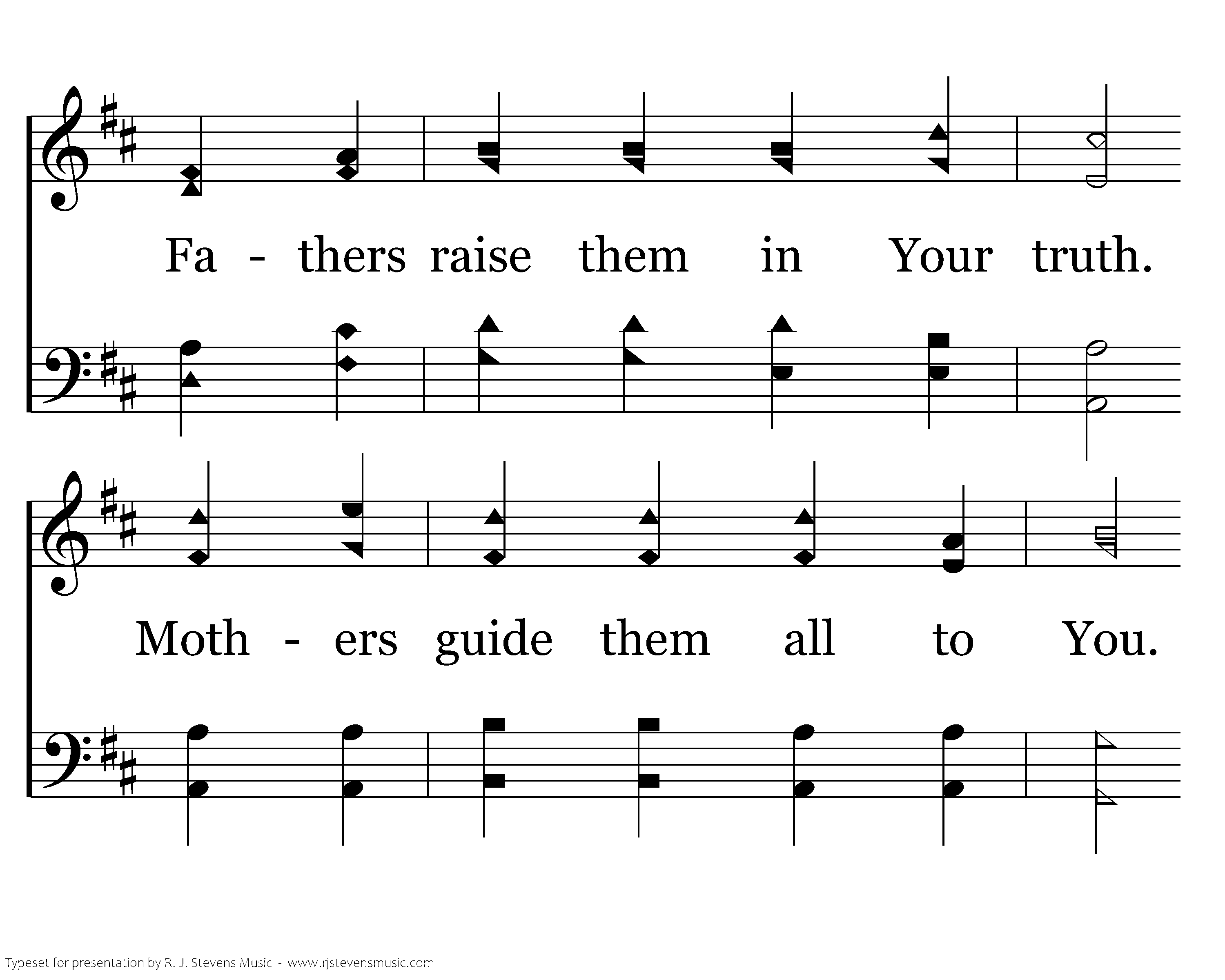 Letters, they see Your letters. Our dear children follow us. They see Your letters. Fathers raise them in Your truth. Mothers guide them all to You. Bless us, Lord, in all we do. We are Your letters.