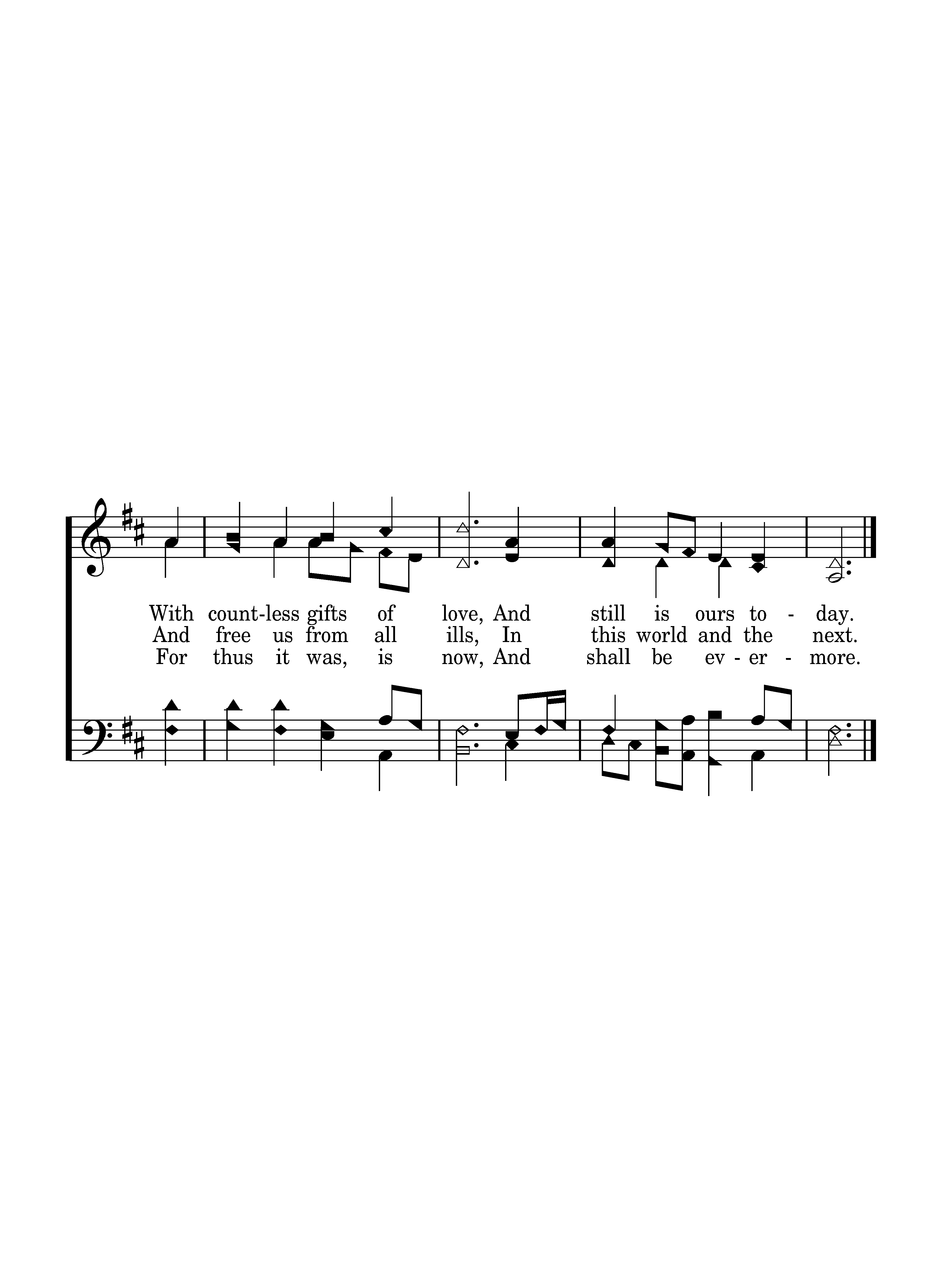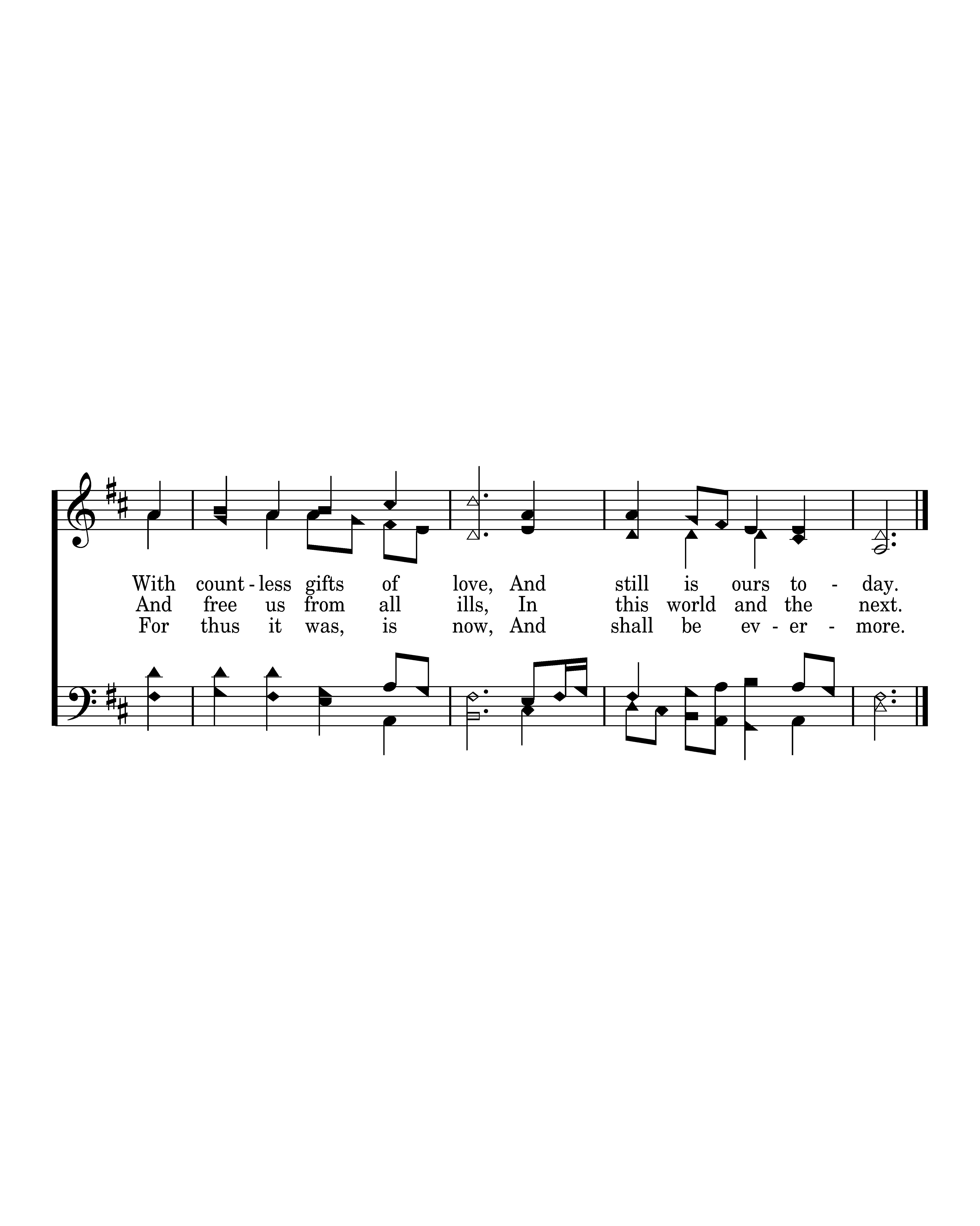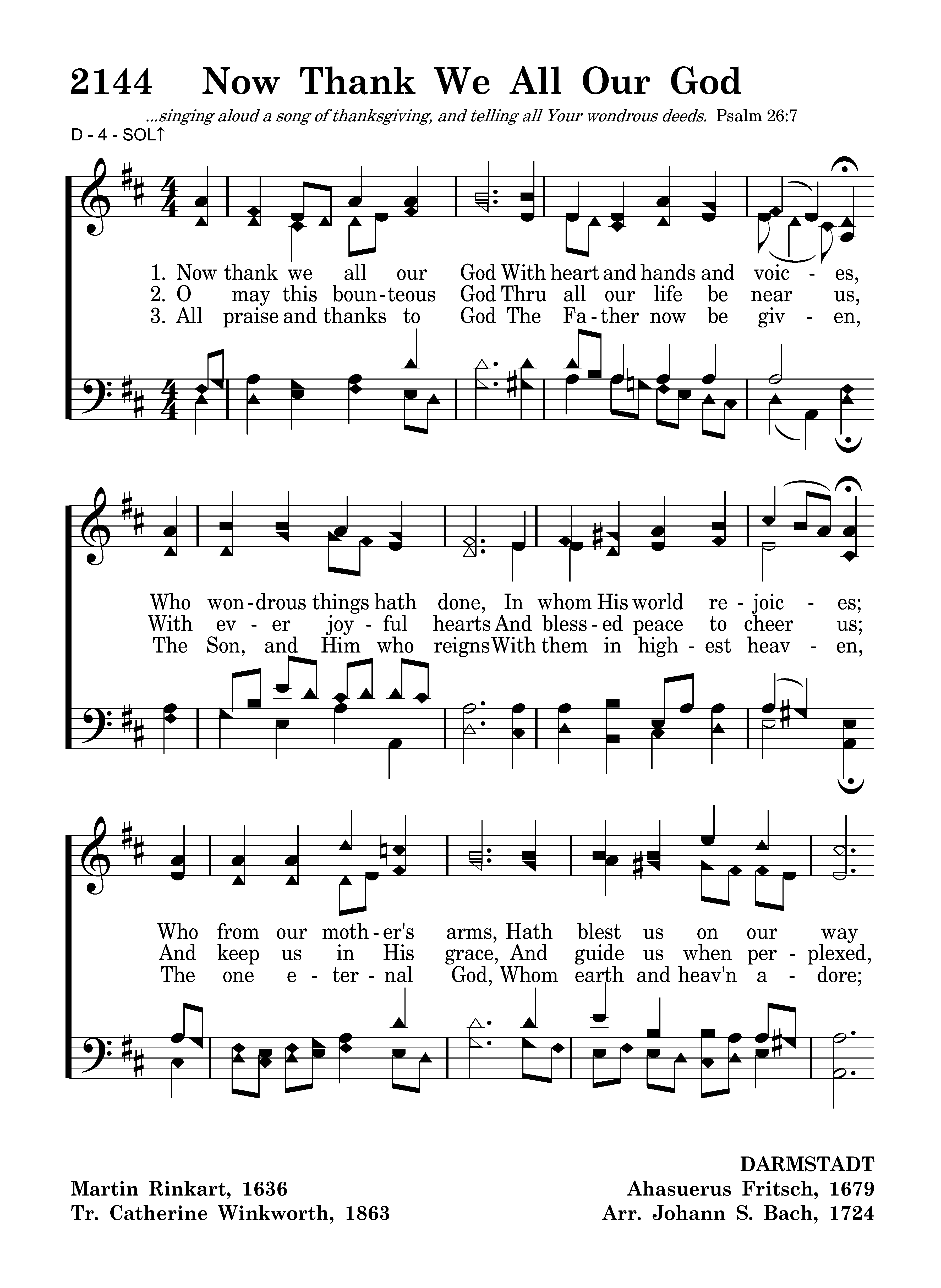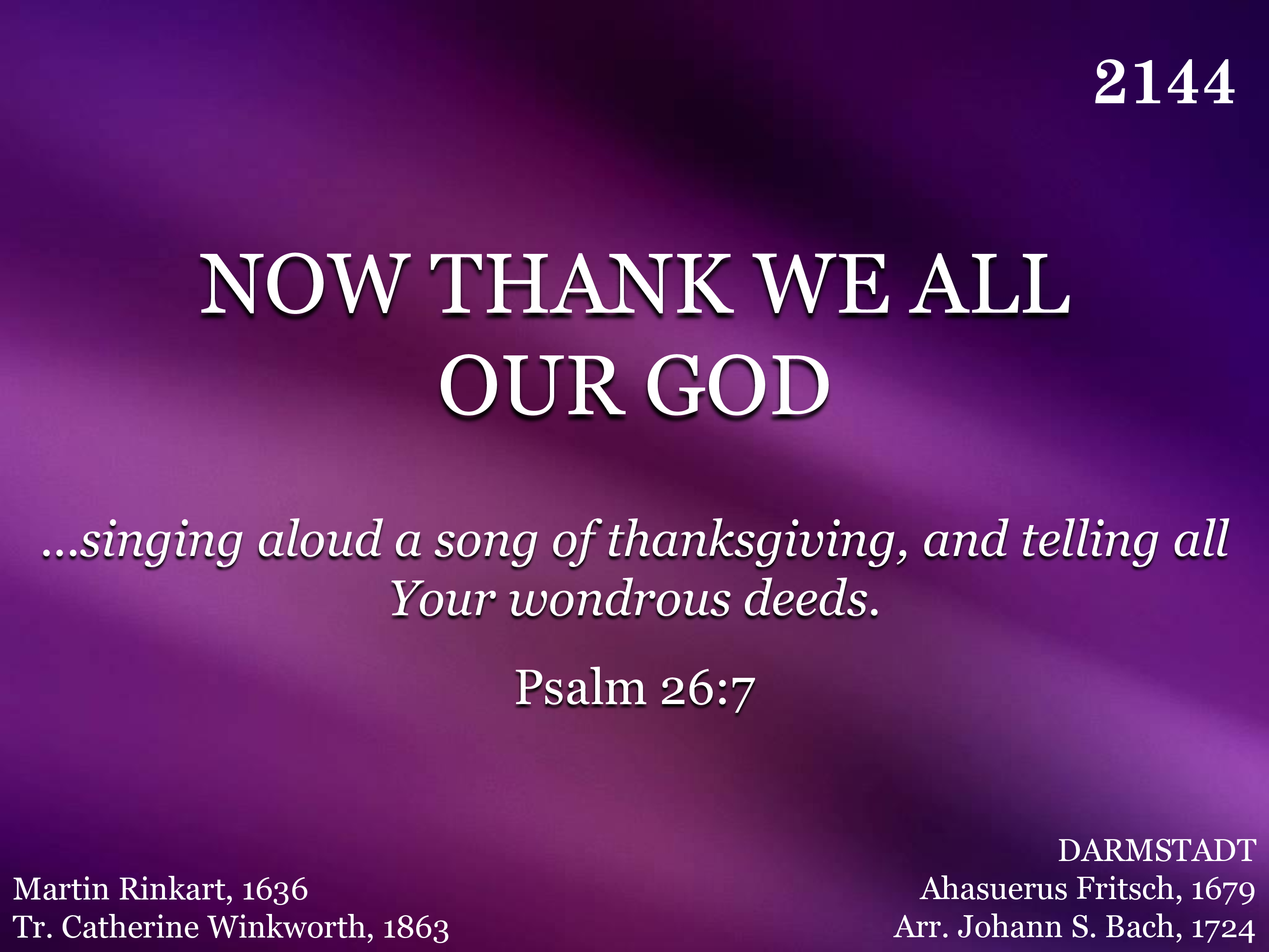 Now thank we all our God With heart and hands and voices, Who wondrous things hath done, In whom His world rejoices; Who from our mother's arms, Hath blest us on our way With countless gifts of love, And still is ours today.
