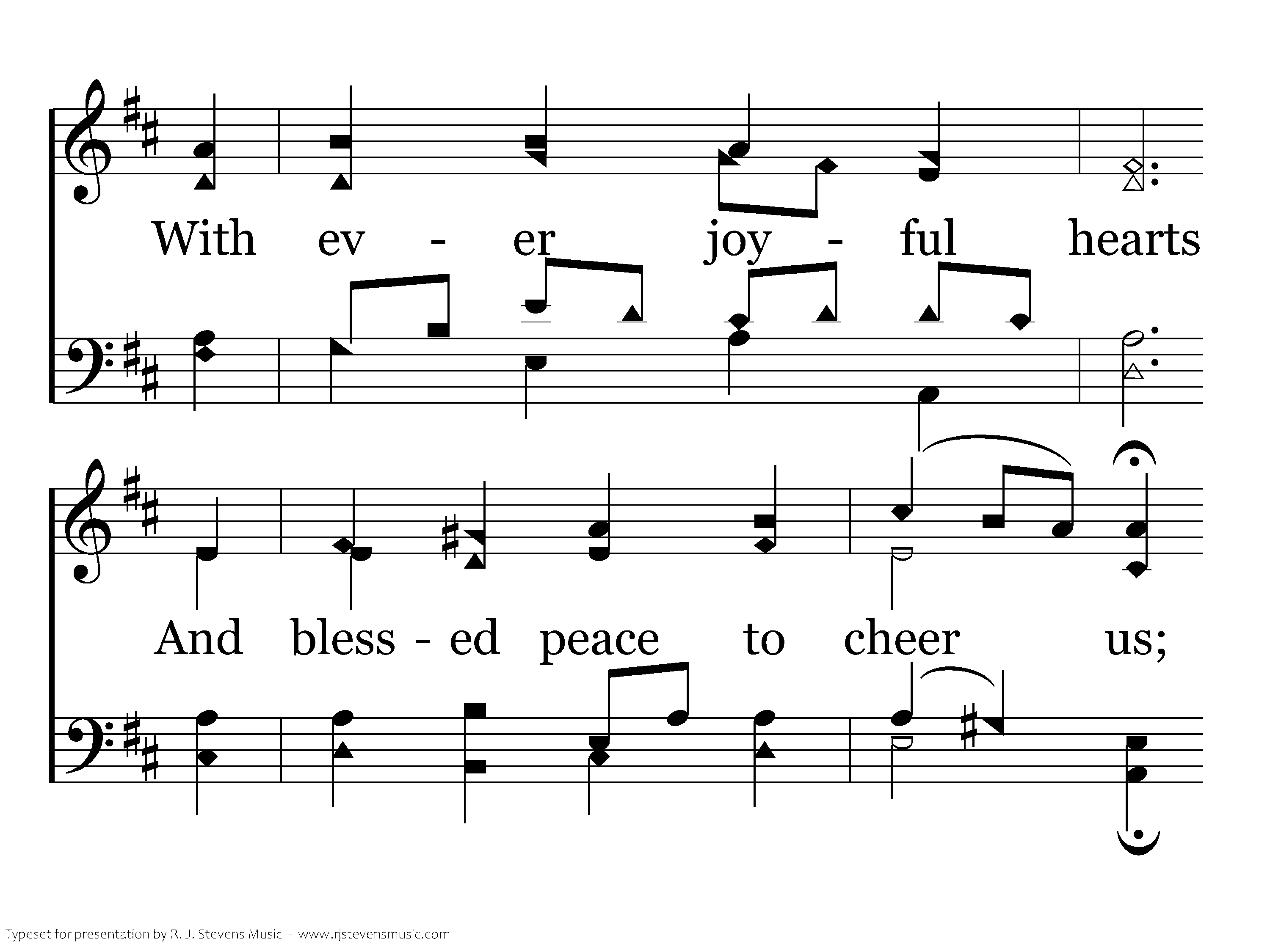 O may this bounteous God Thru all our life be near us, With ever joyful hearts And blessed peace to cheer us; And keep us in His grace, And guide us when perplexed, And free us from all ills, In this world and the next.