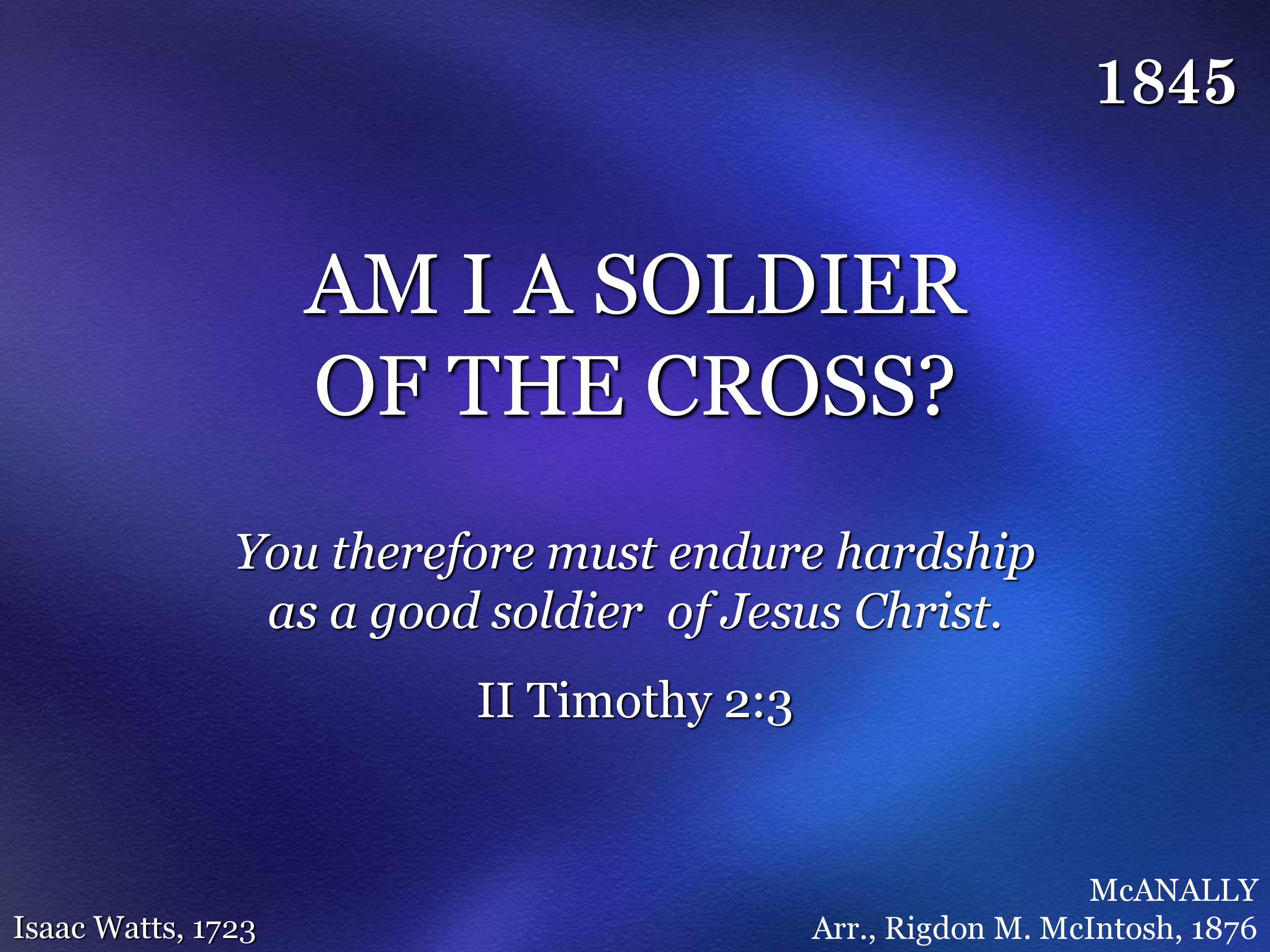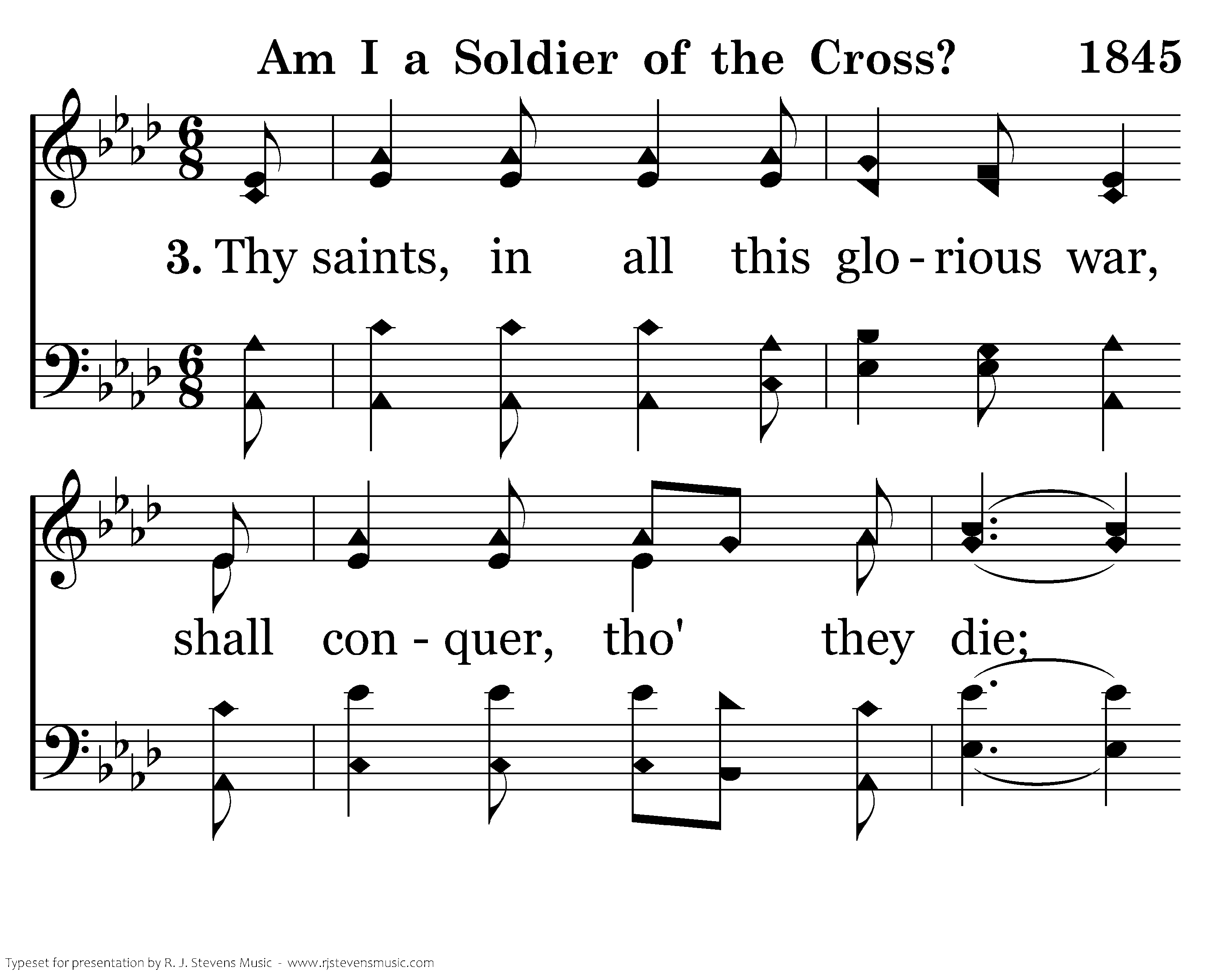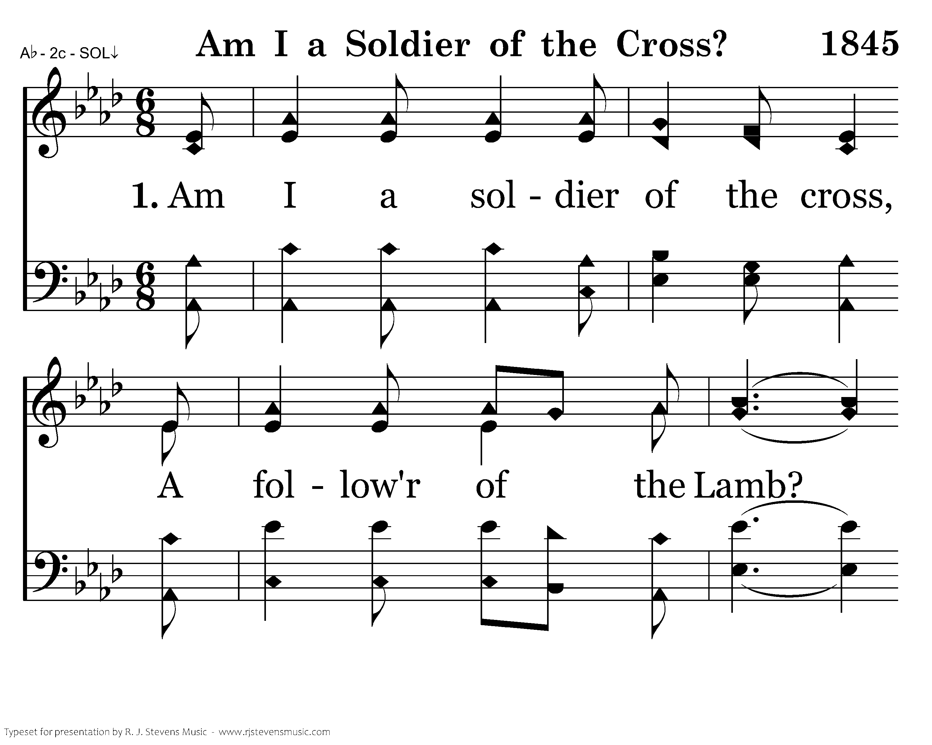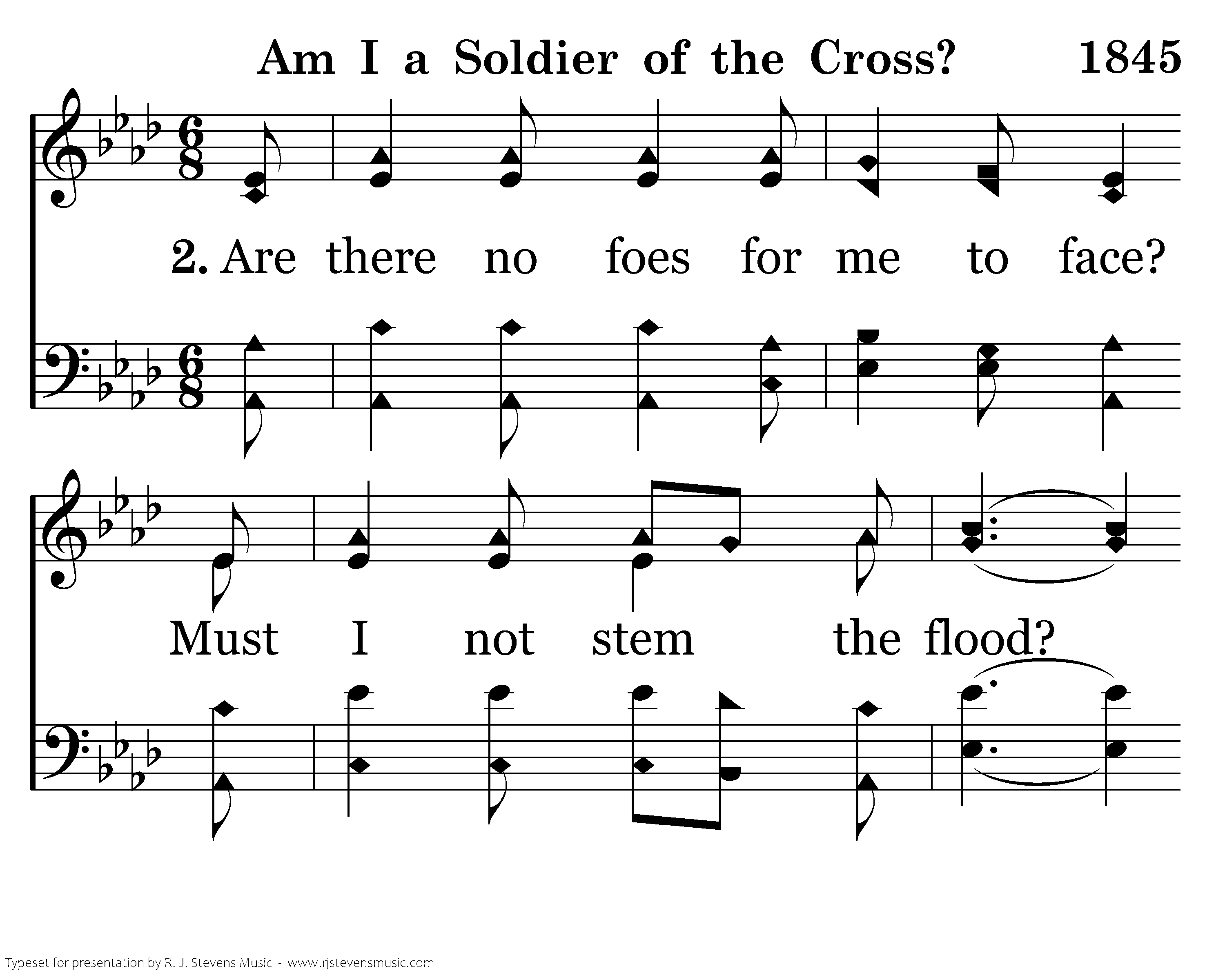 Am I a soldier of the cross, A follow'r of the Lamb? And shall I fear to own His cause, Or blush to speak His name? Must I be carried to the skies On flow'ry beds of ease, While others fought to win the prize, And sailed thru bloody seas?