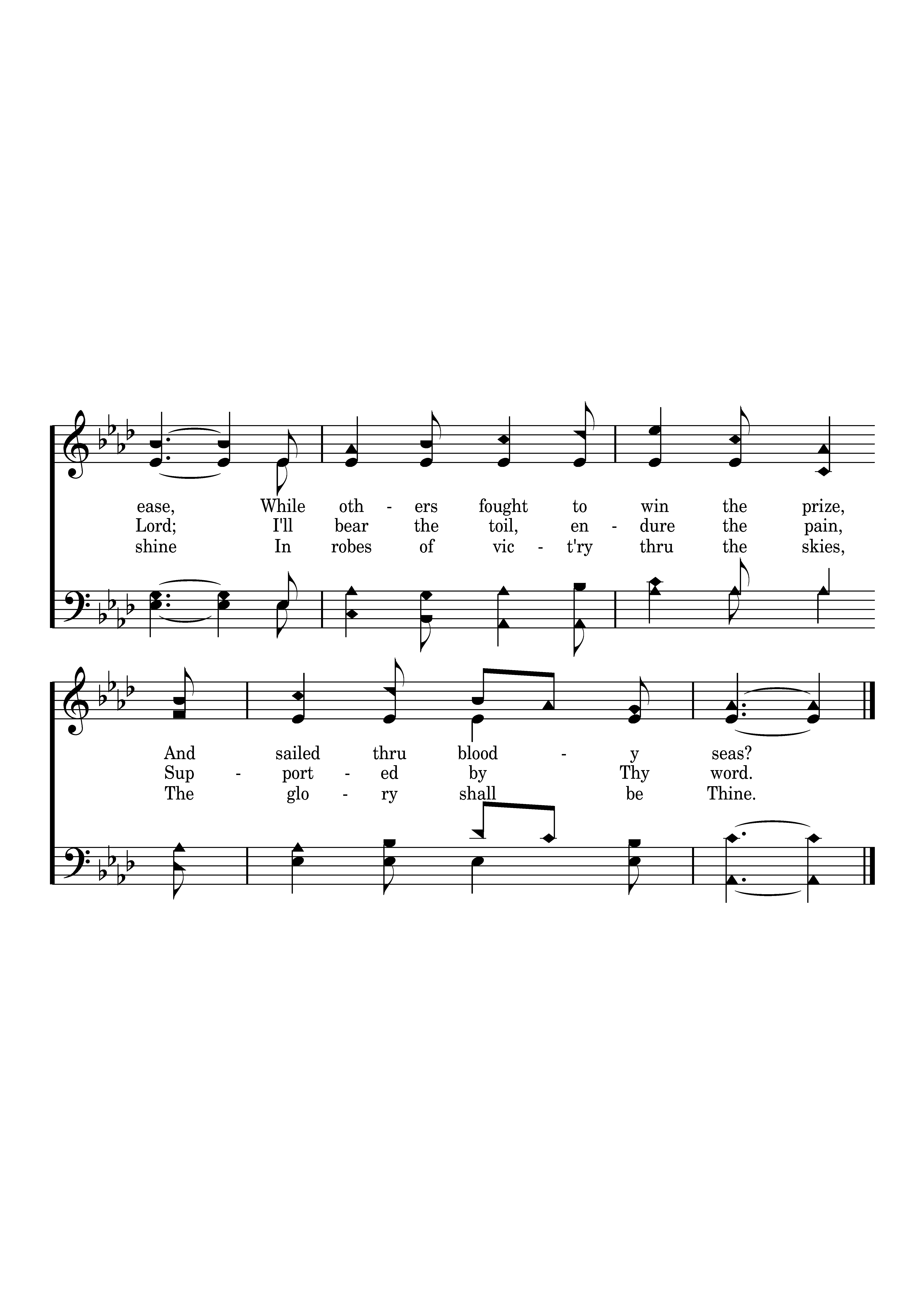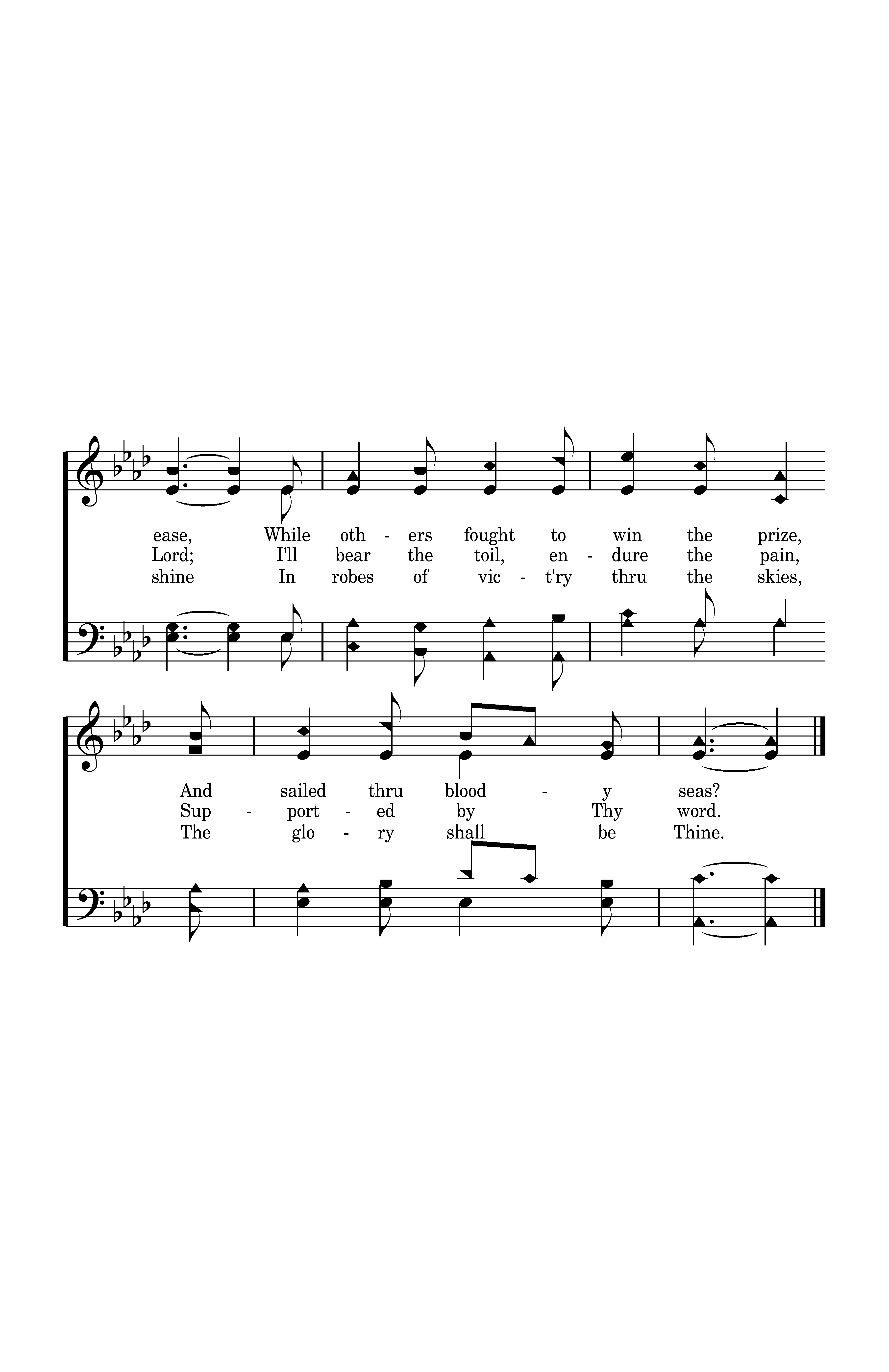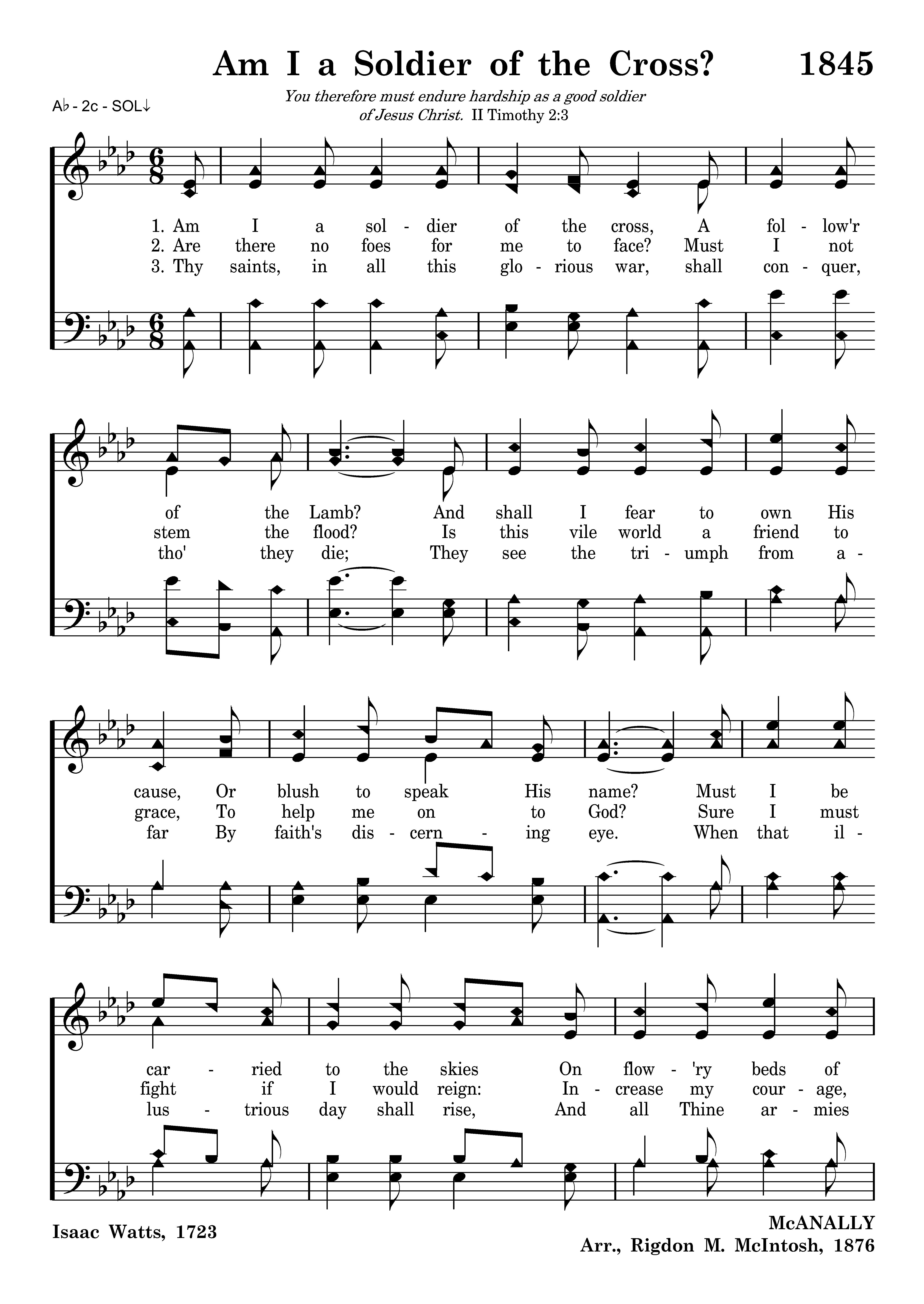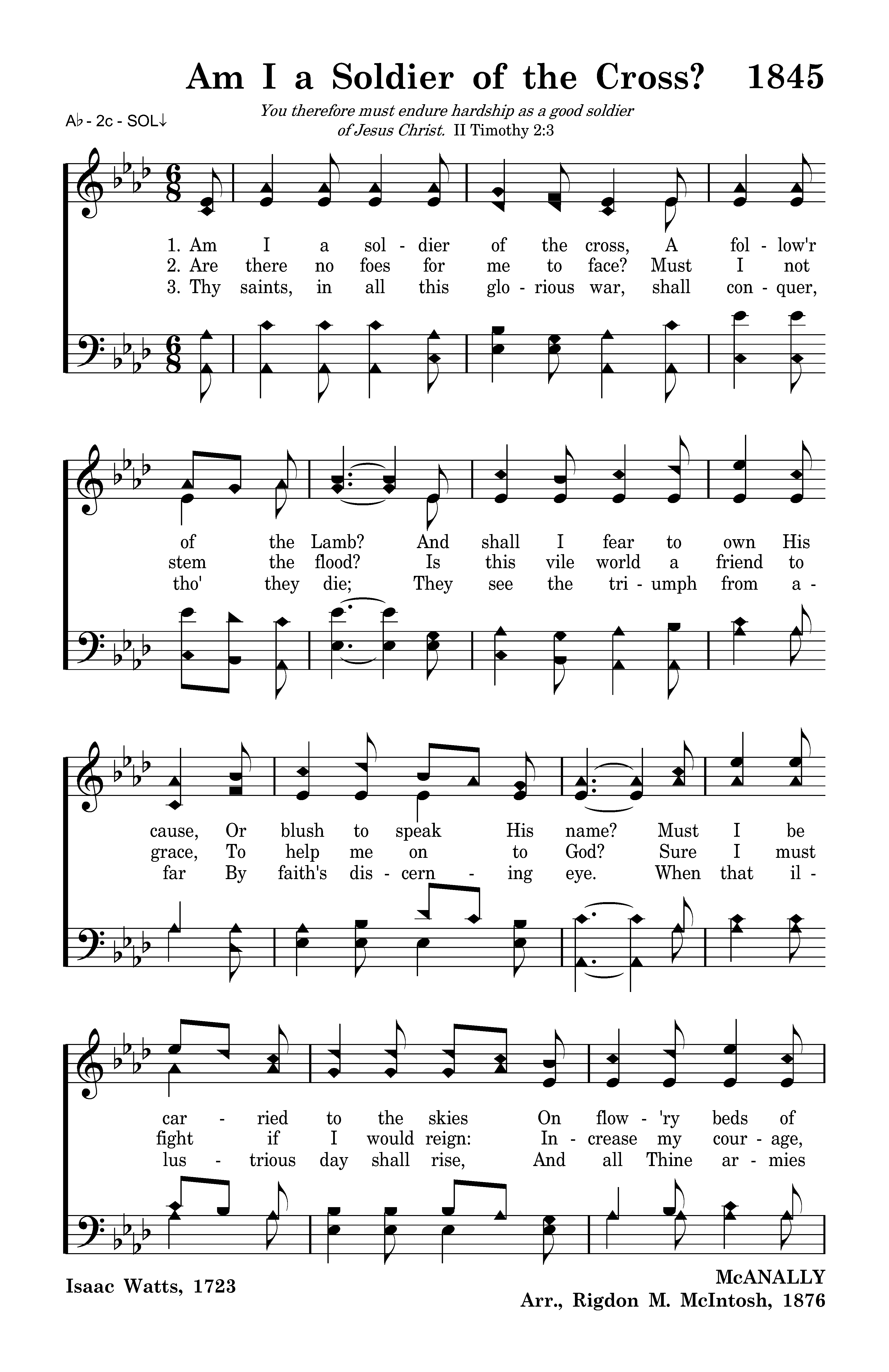 Am I a soldier of the cross, A follow'r of the Lamb? And shall I fear to own His cause, Or blush to speak His name? Must I be carried to the skies On flow'ry beds of ease, While others fought to win the prize, And sailed thru bloody seas?