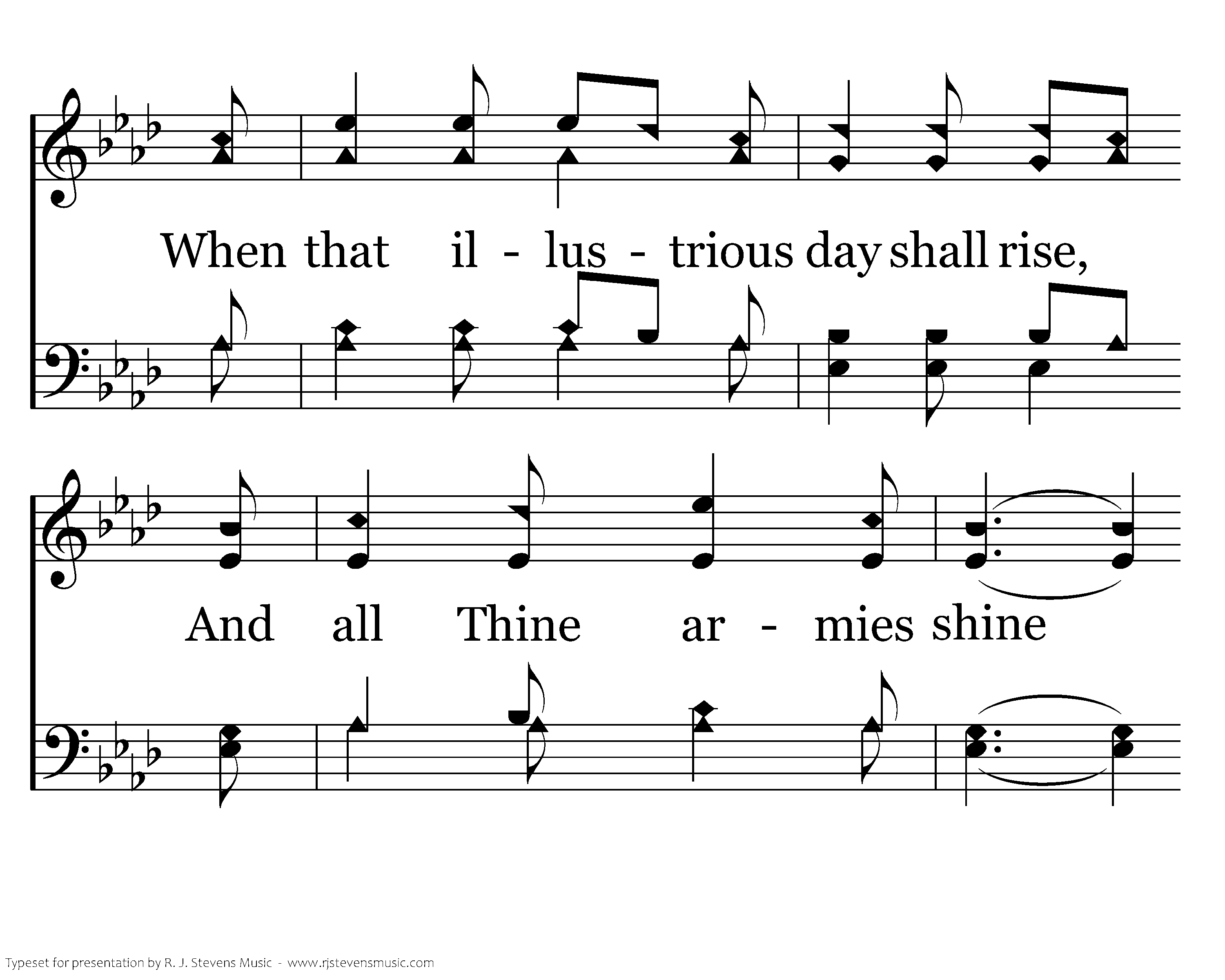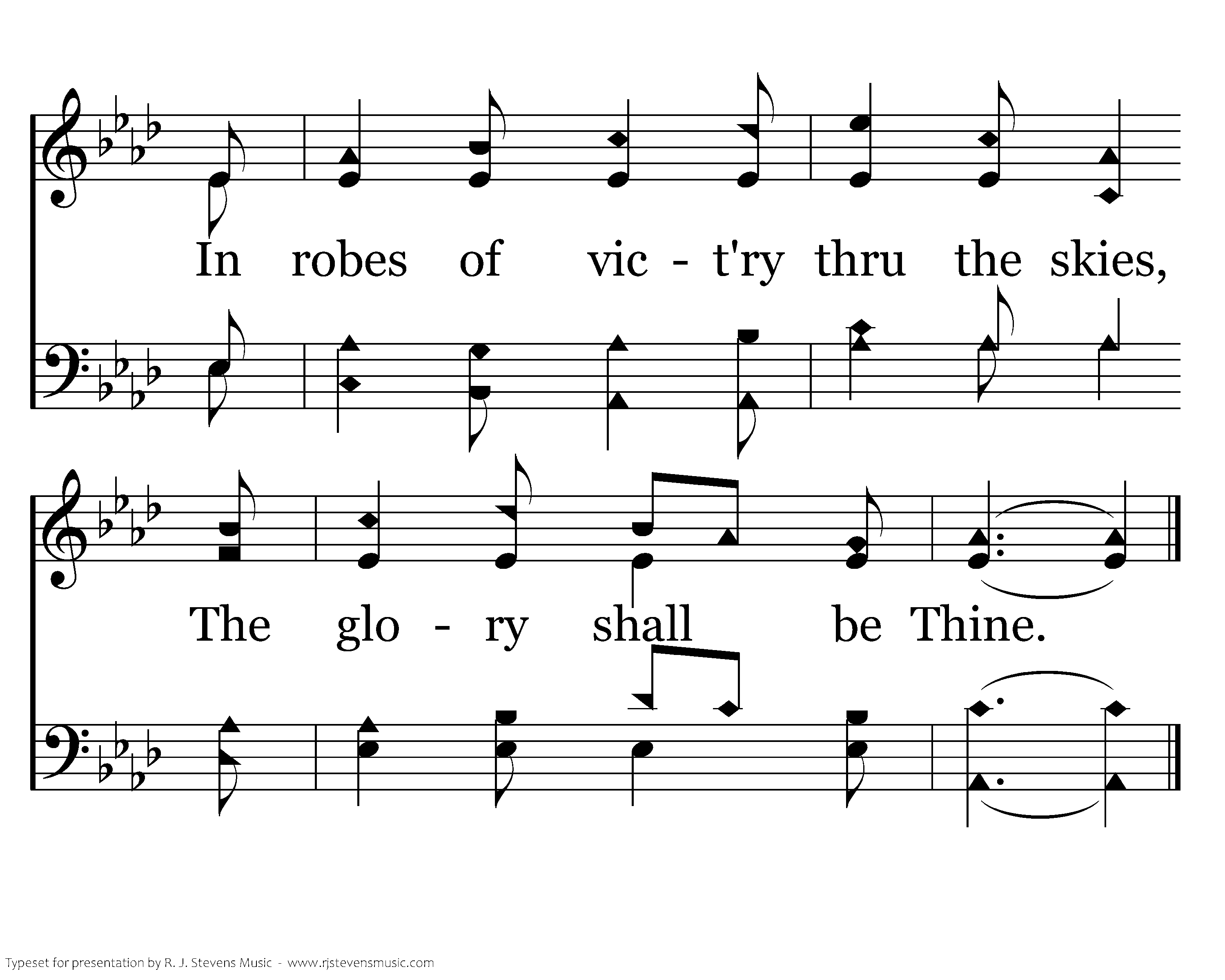 Thy saints, in all this glorious war, shall conquer, tho' they die; They see the triumph from afar By faith's discerning eye. When that illustrious day shall rise, And all Thine armies shine In robes of vict'ry thru the skies, The glory shall be Thine.