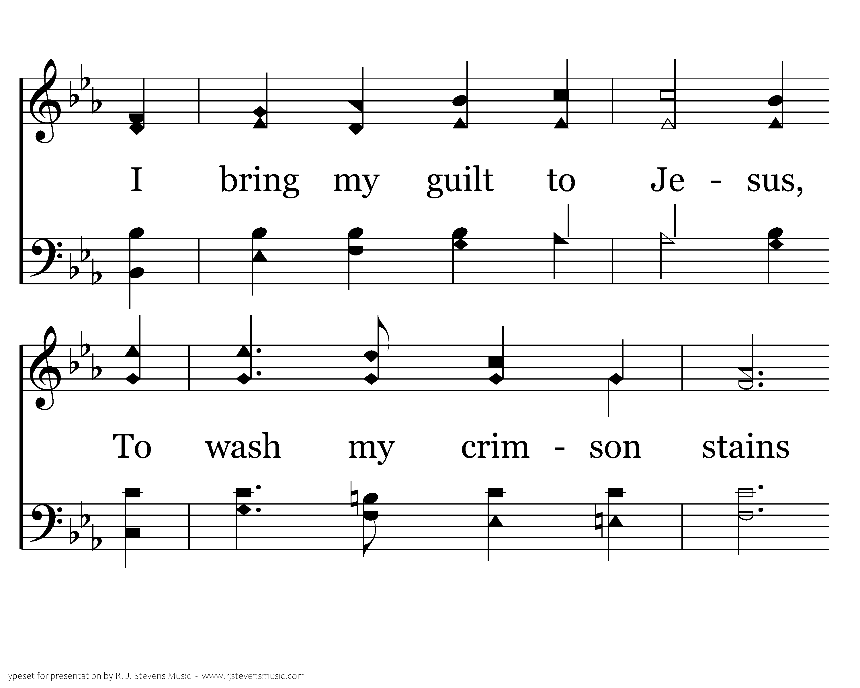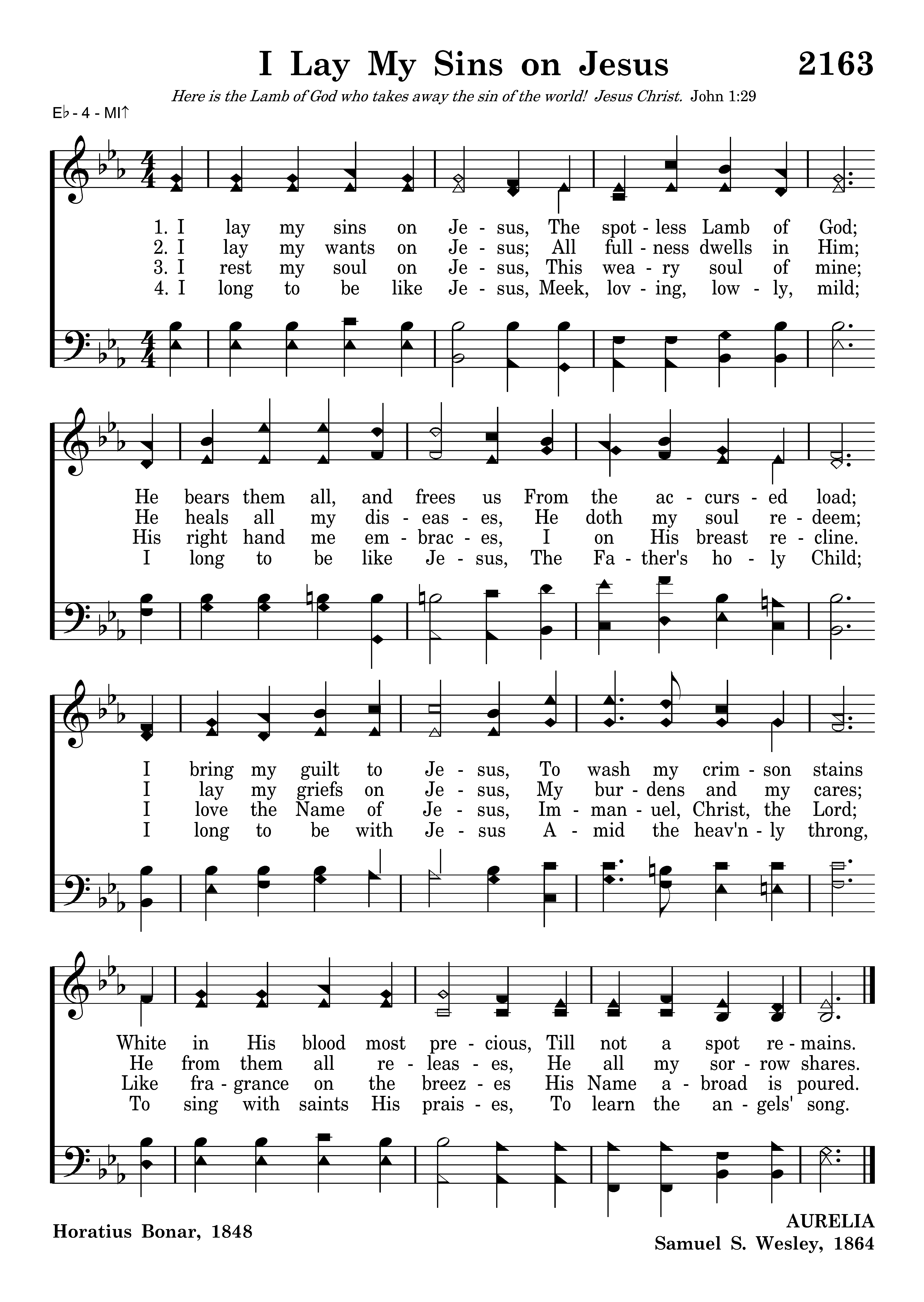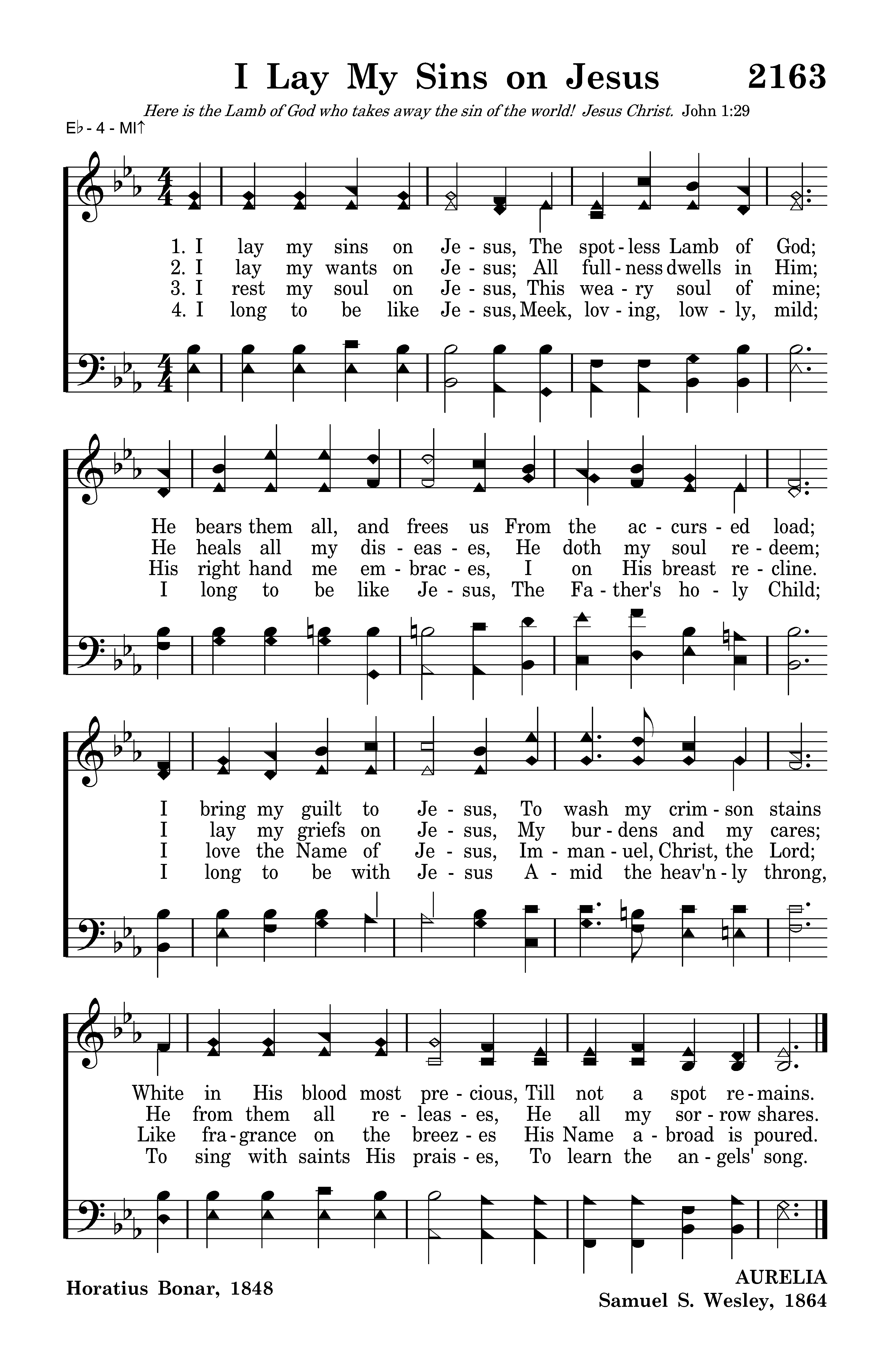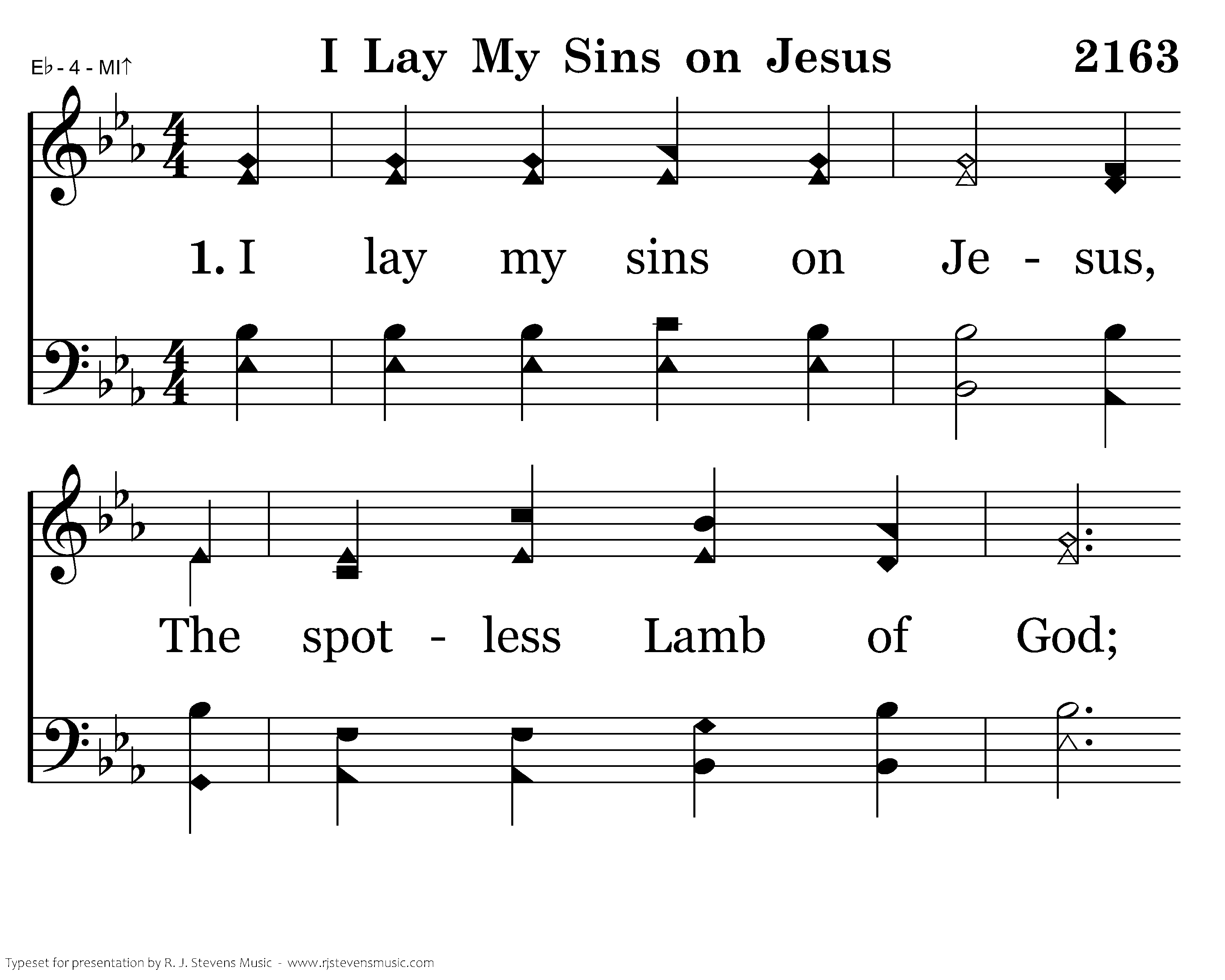 I lay my sins on Jesus, The spotless Lamb of God; He bears them all, and frees us From the accursed load; I bring my guilt to Jesus, To wash my crimson stains White in His blood most precious, Till not a spot remains.