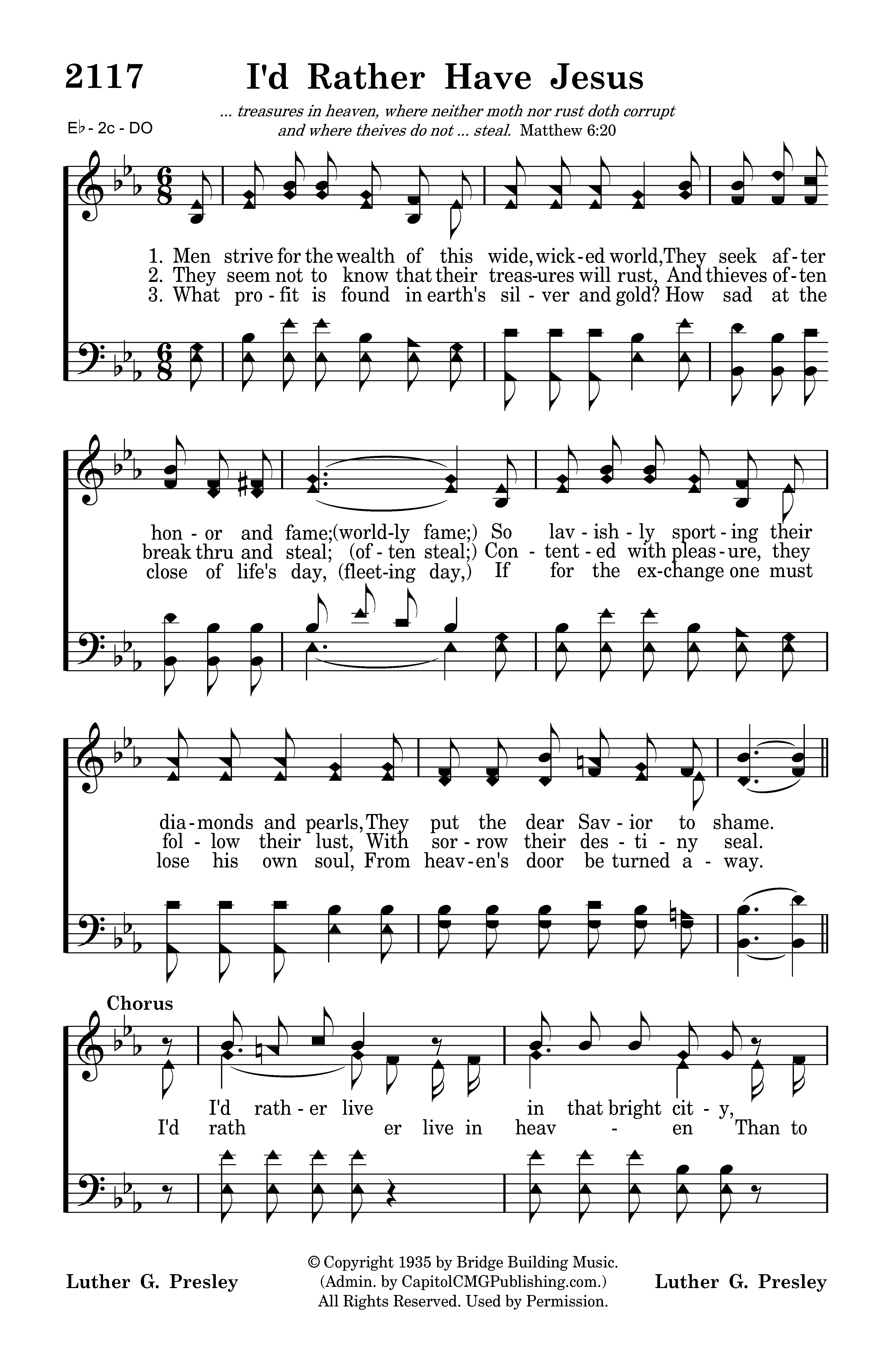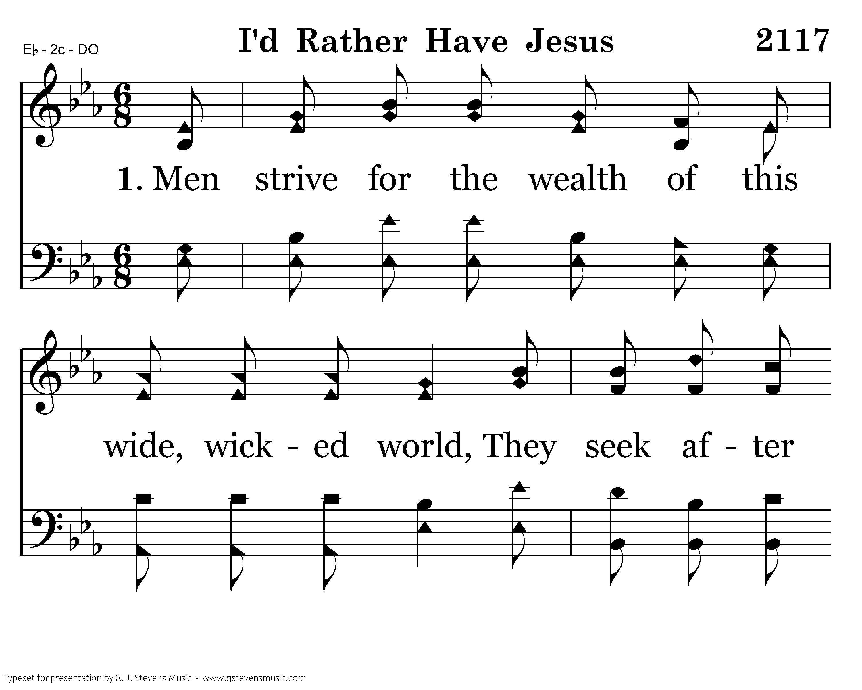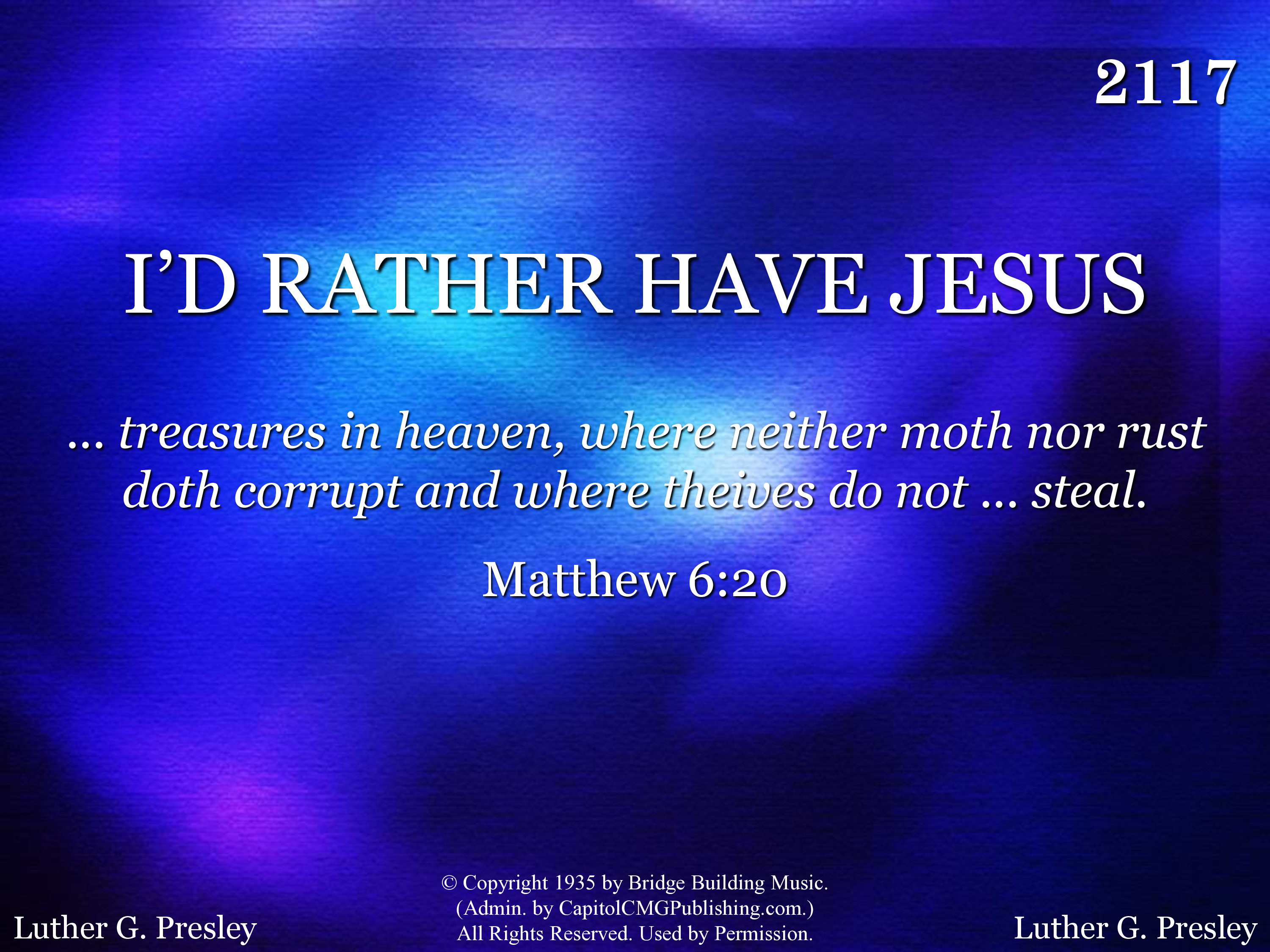 I'd rather live in heaven Than to own all earth's silver and gold, I'd rather have Jesus Than the diamonds of a palace to hold; I'd rather be a beggar, Live in a little shack by the road, Than to own all earth's treasures to a future abode.