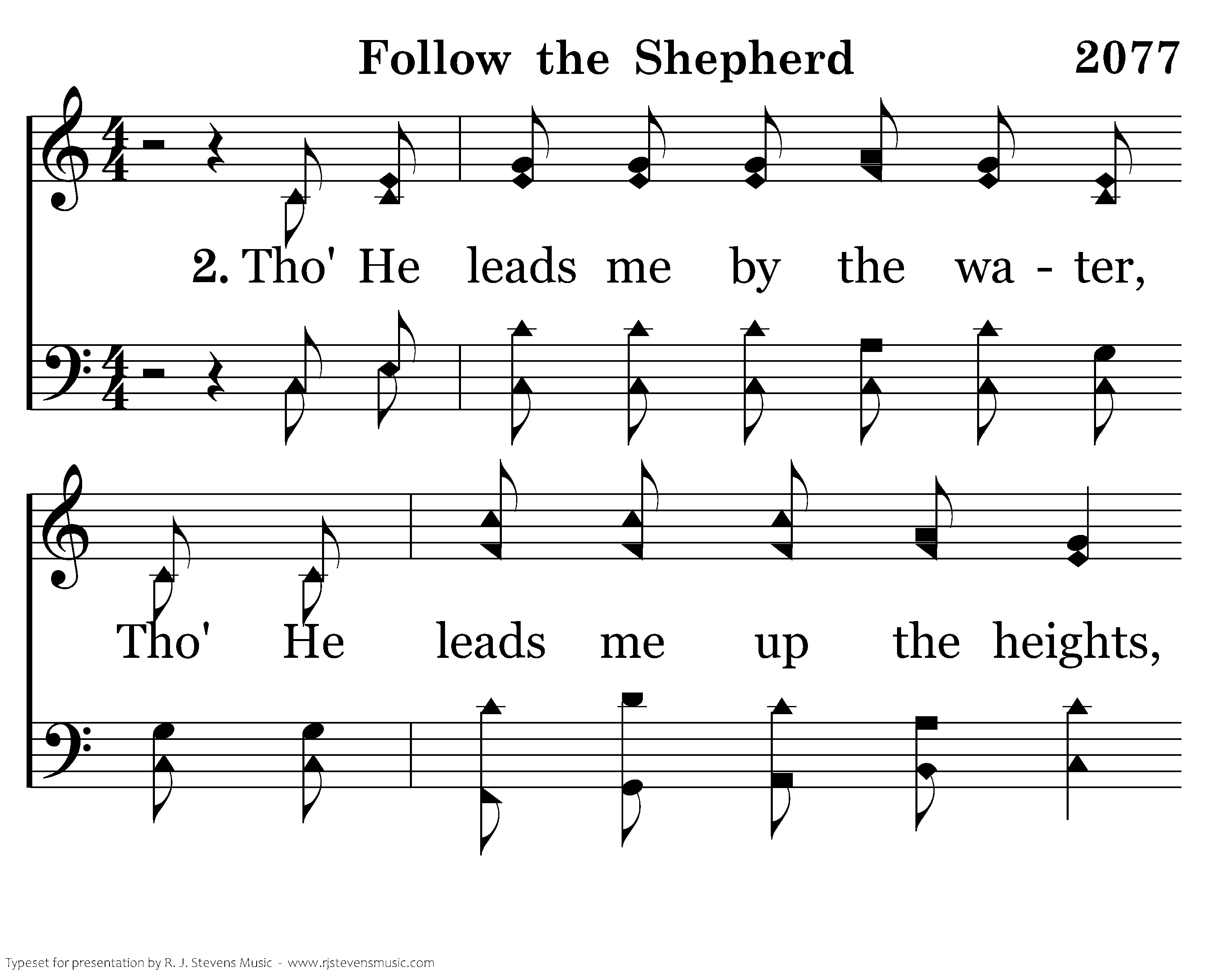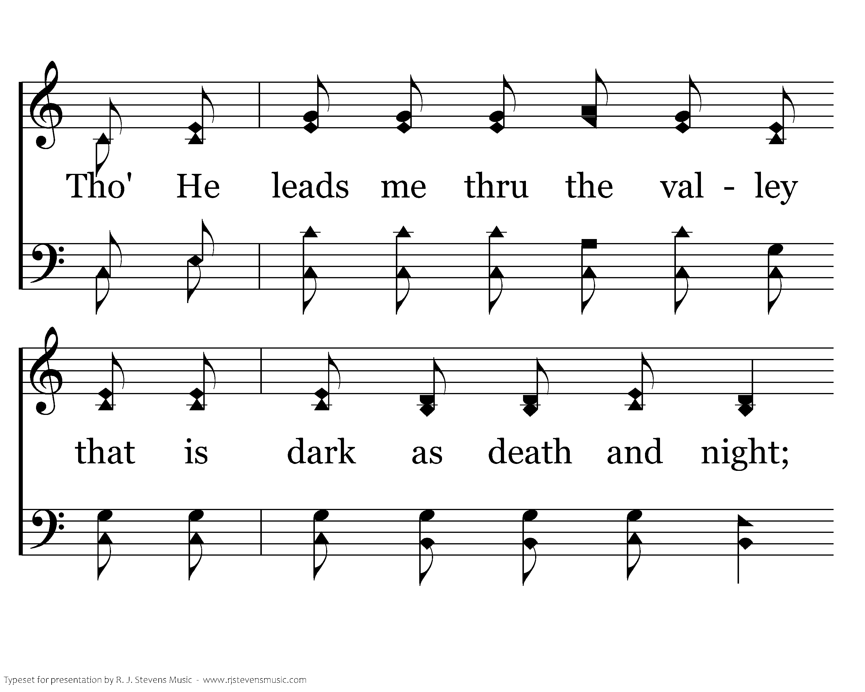Tho' He leads me by the water, Tho' He leads me up the heights, Tho' He leads me thru the valley that is dark as death and night; I will fear no earthly evil for my Shepherd is the Lord; I will trust in the Shepherd, my soul He restores.