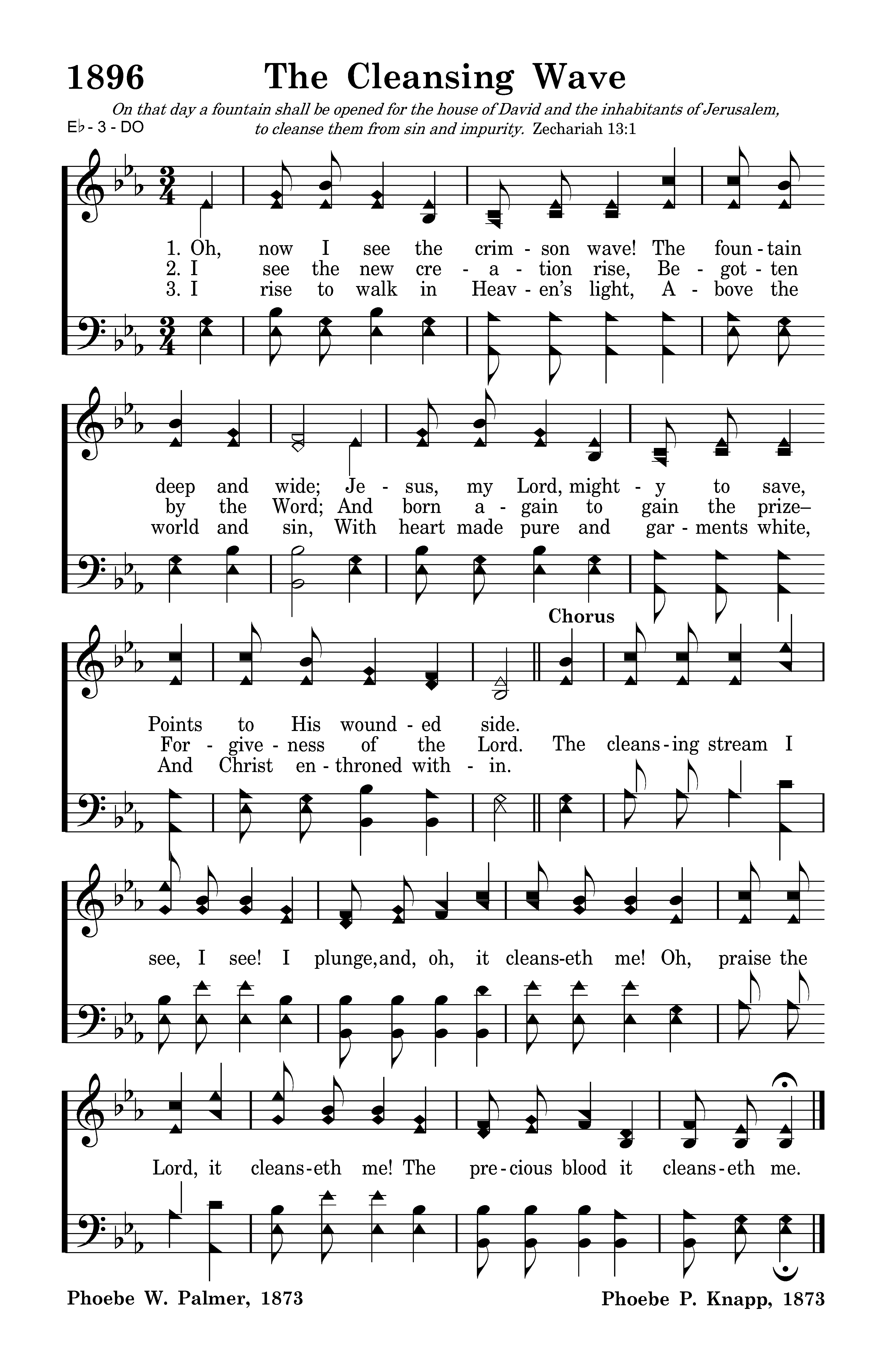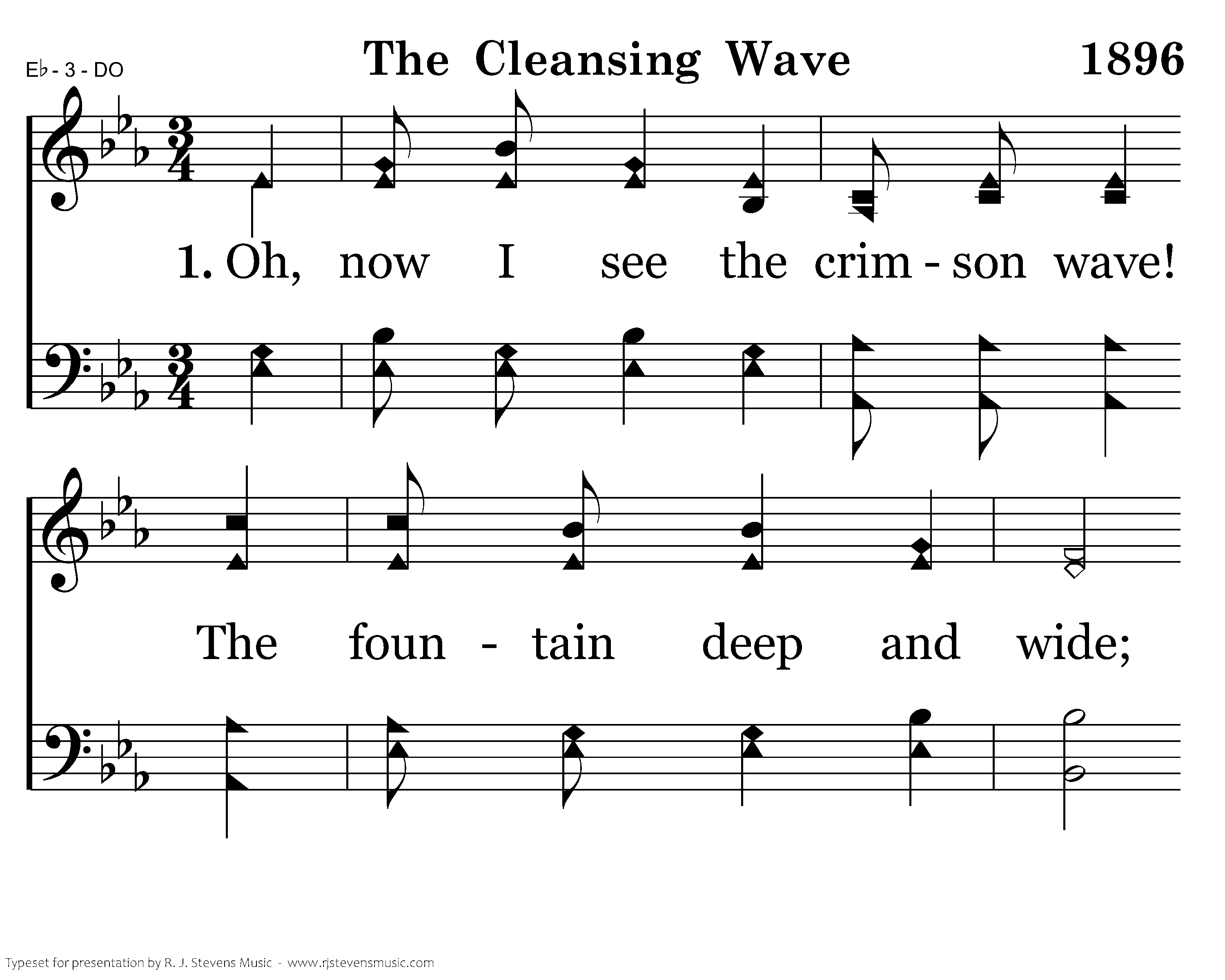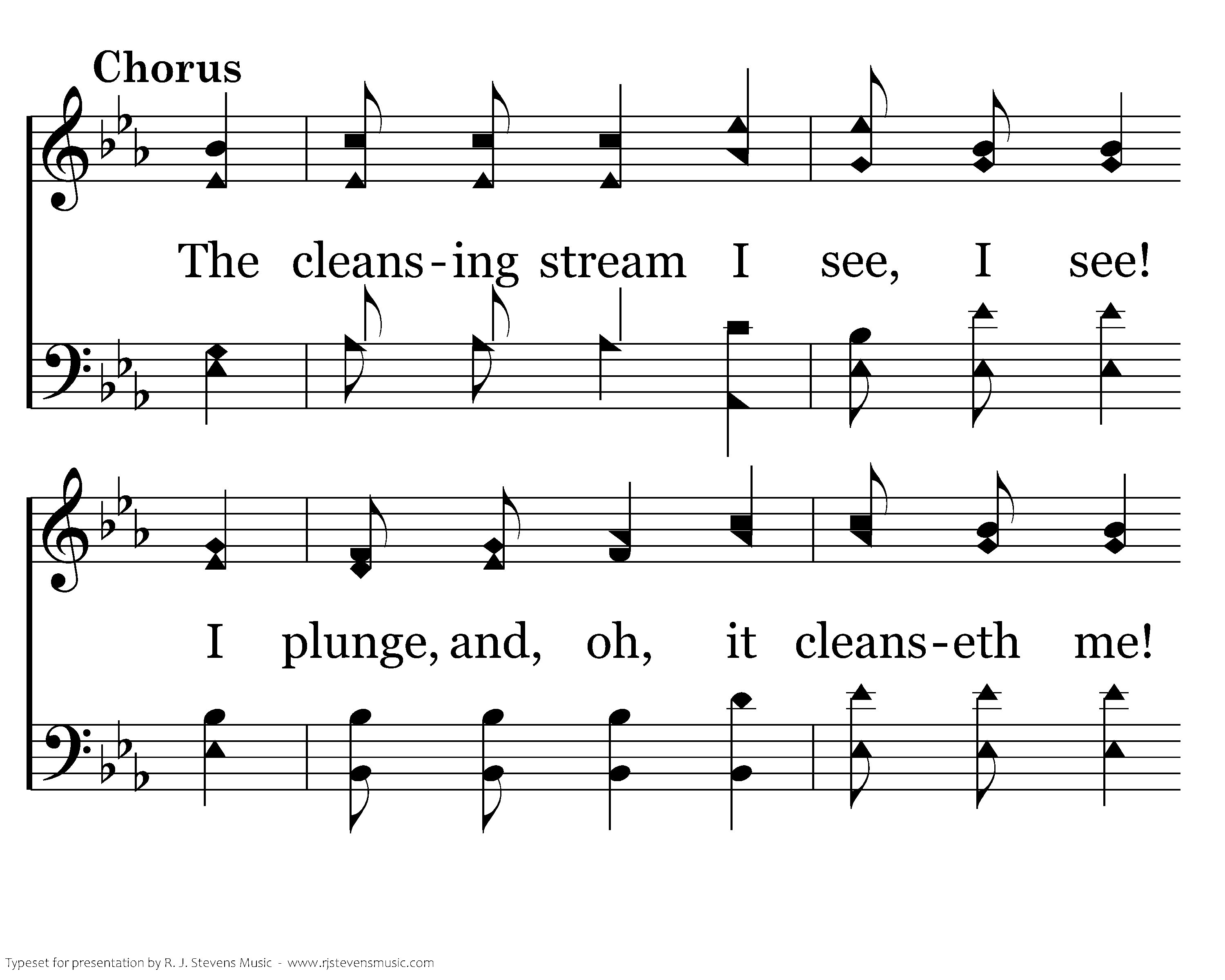 The cleansing stream I see, I see! I plunge, and, oh, it cleanseth me! Oh, praise the Lord, it cleanseth me! The precious blood it cleanseth me.