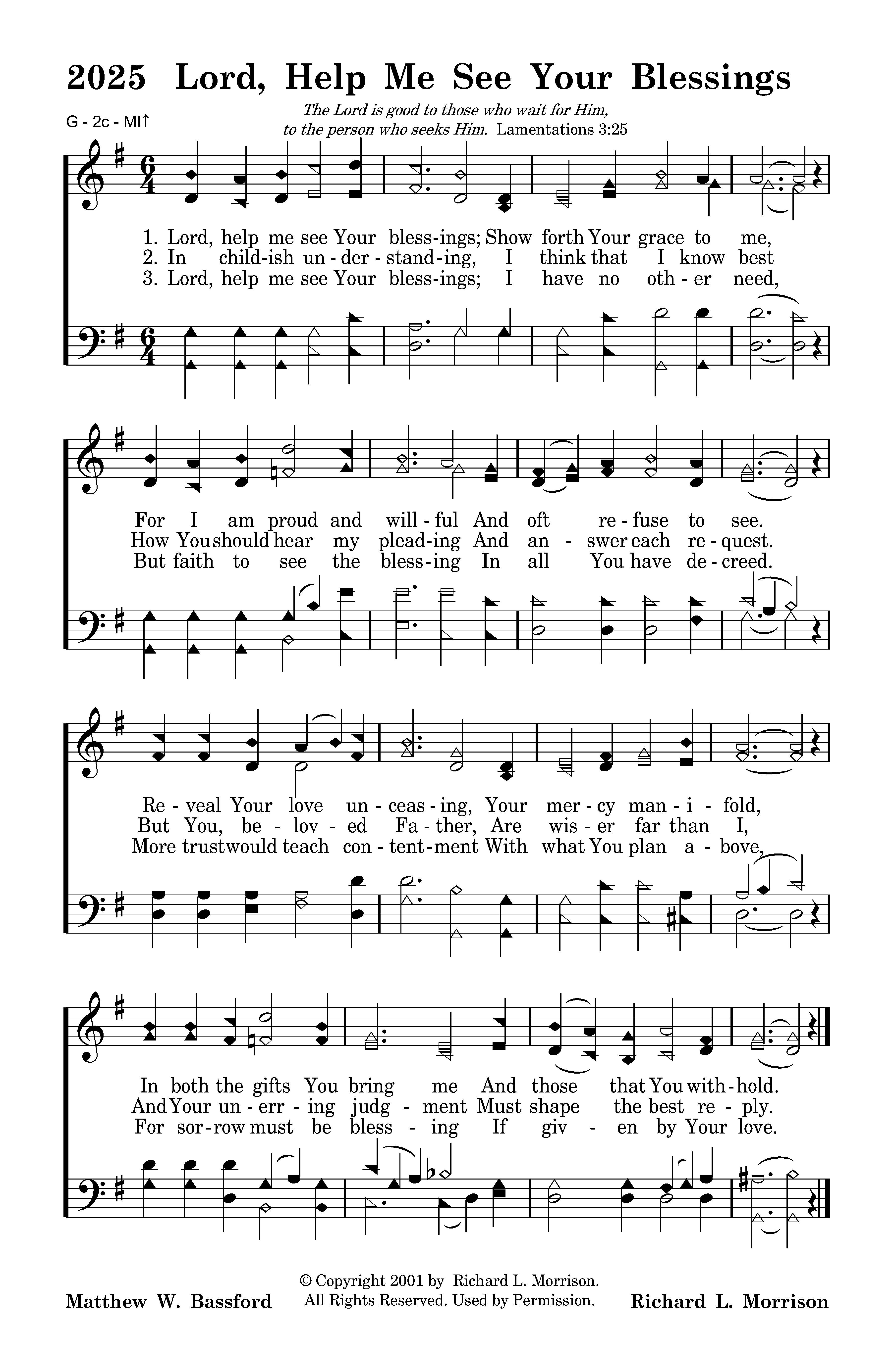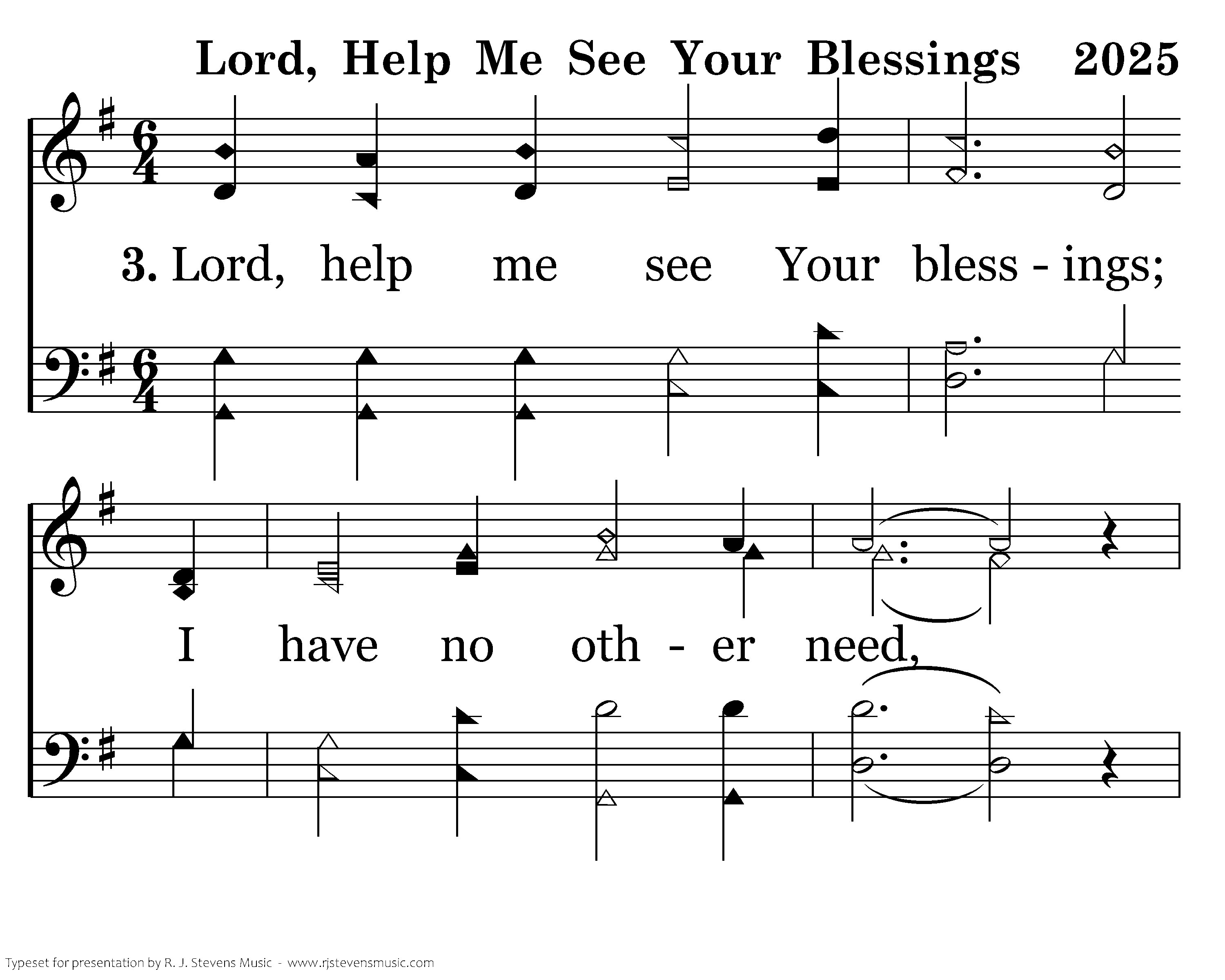Lord, help me see Your blessings; Show forth Your grace to me, For I am proud and willful And oft refuse to see. Reveal Your love unceasing, Your mercy manifold, In both the gifts You bring me And those that You withhold.