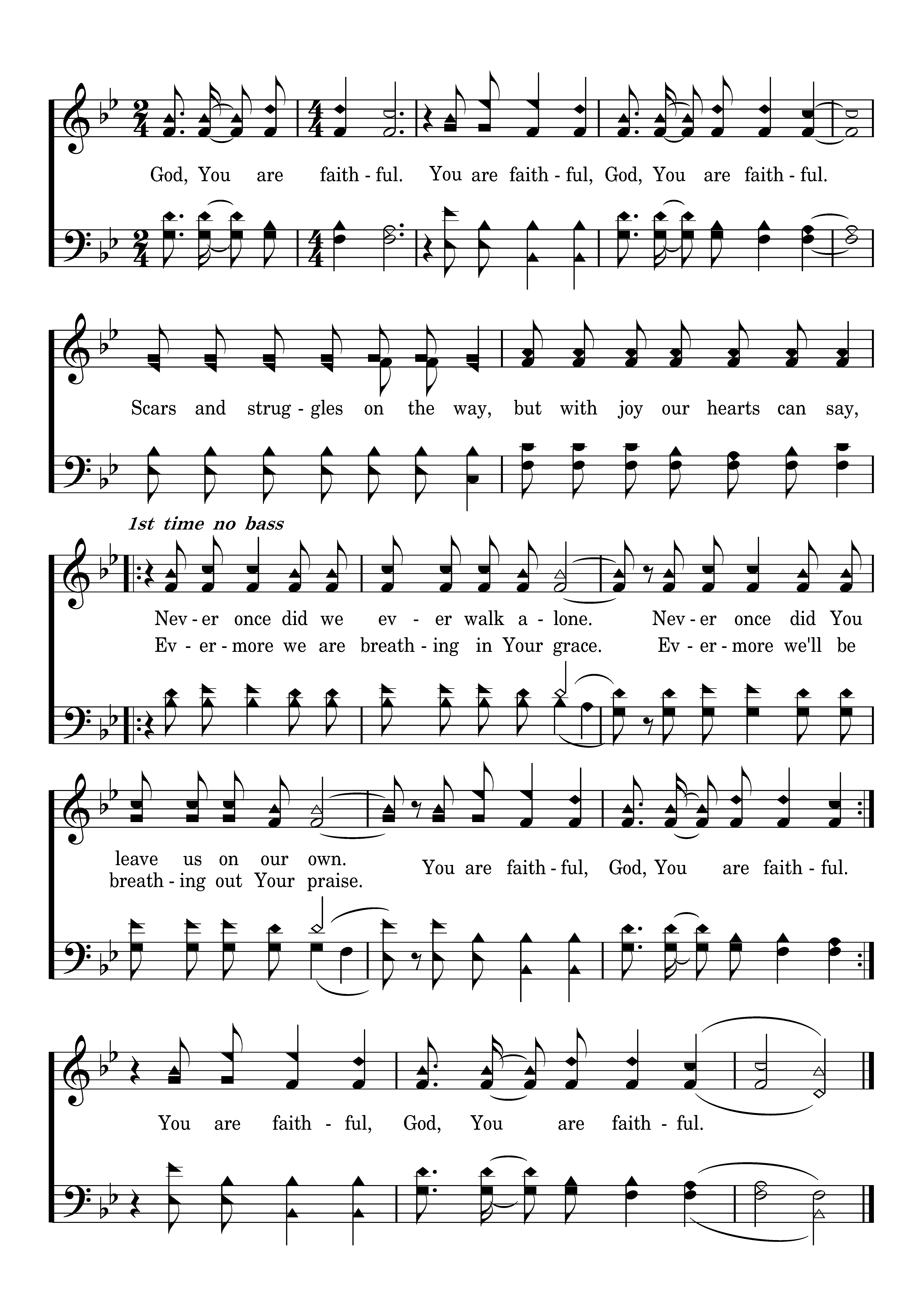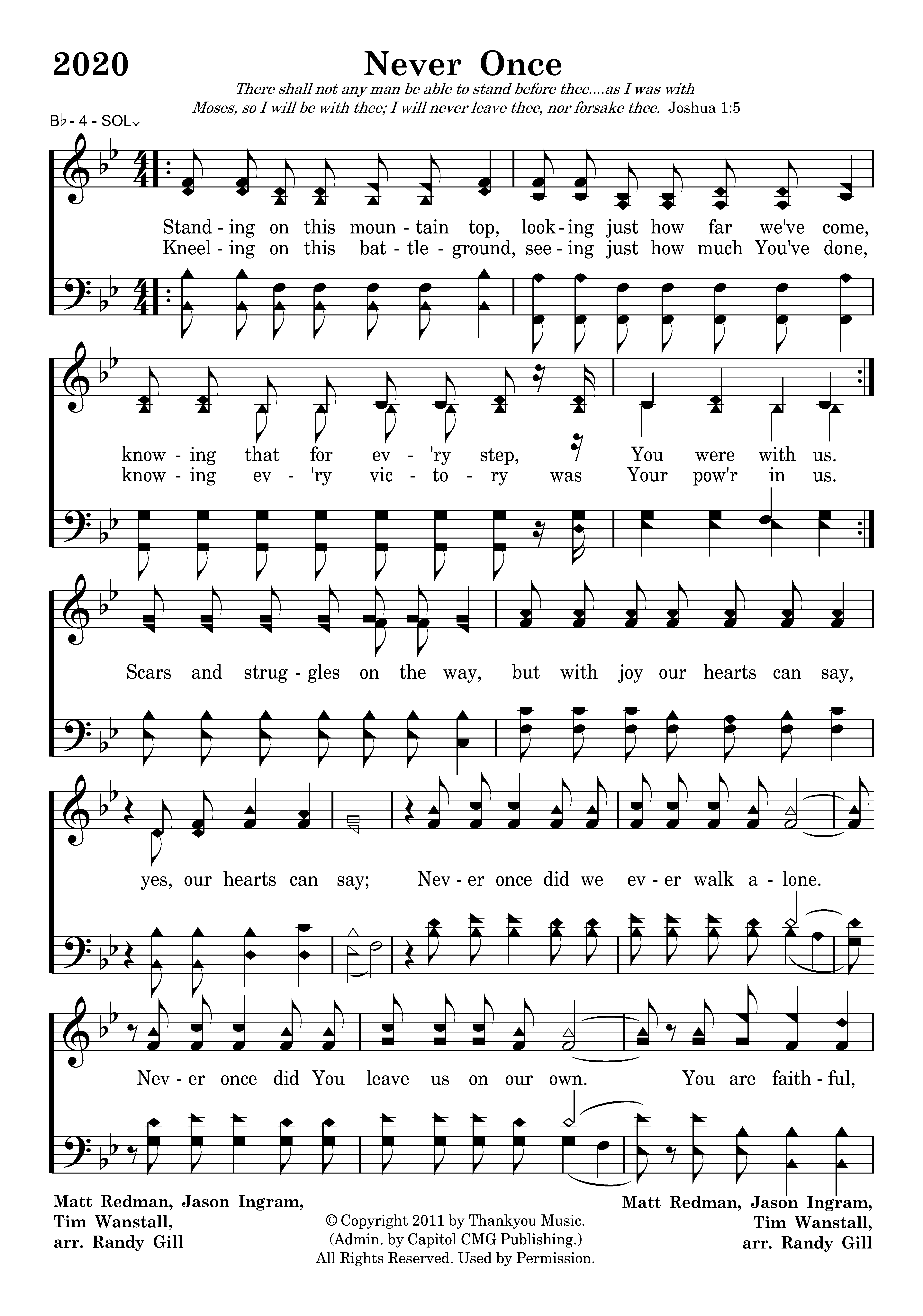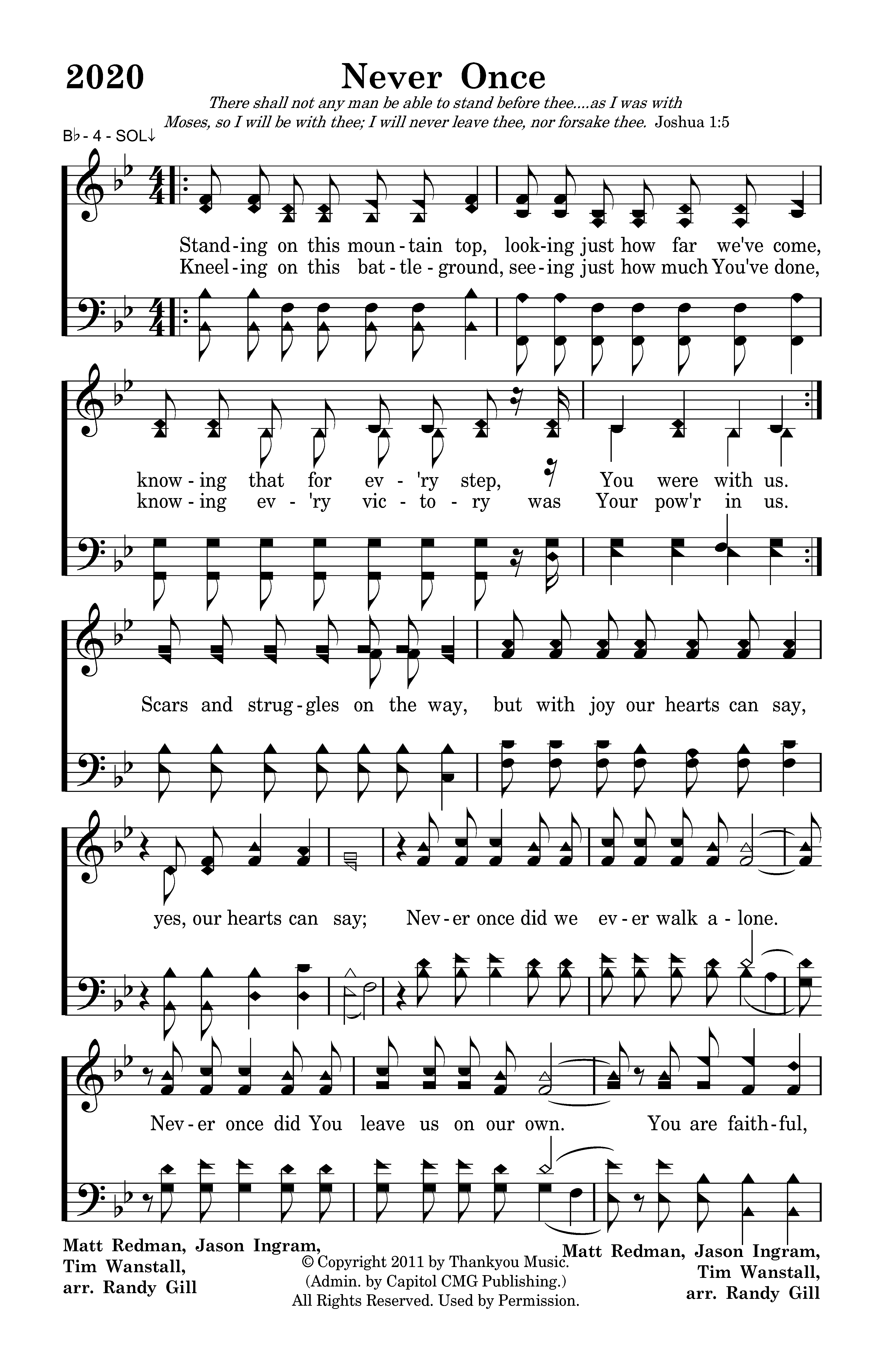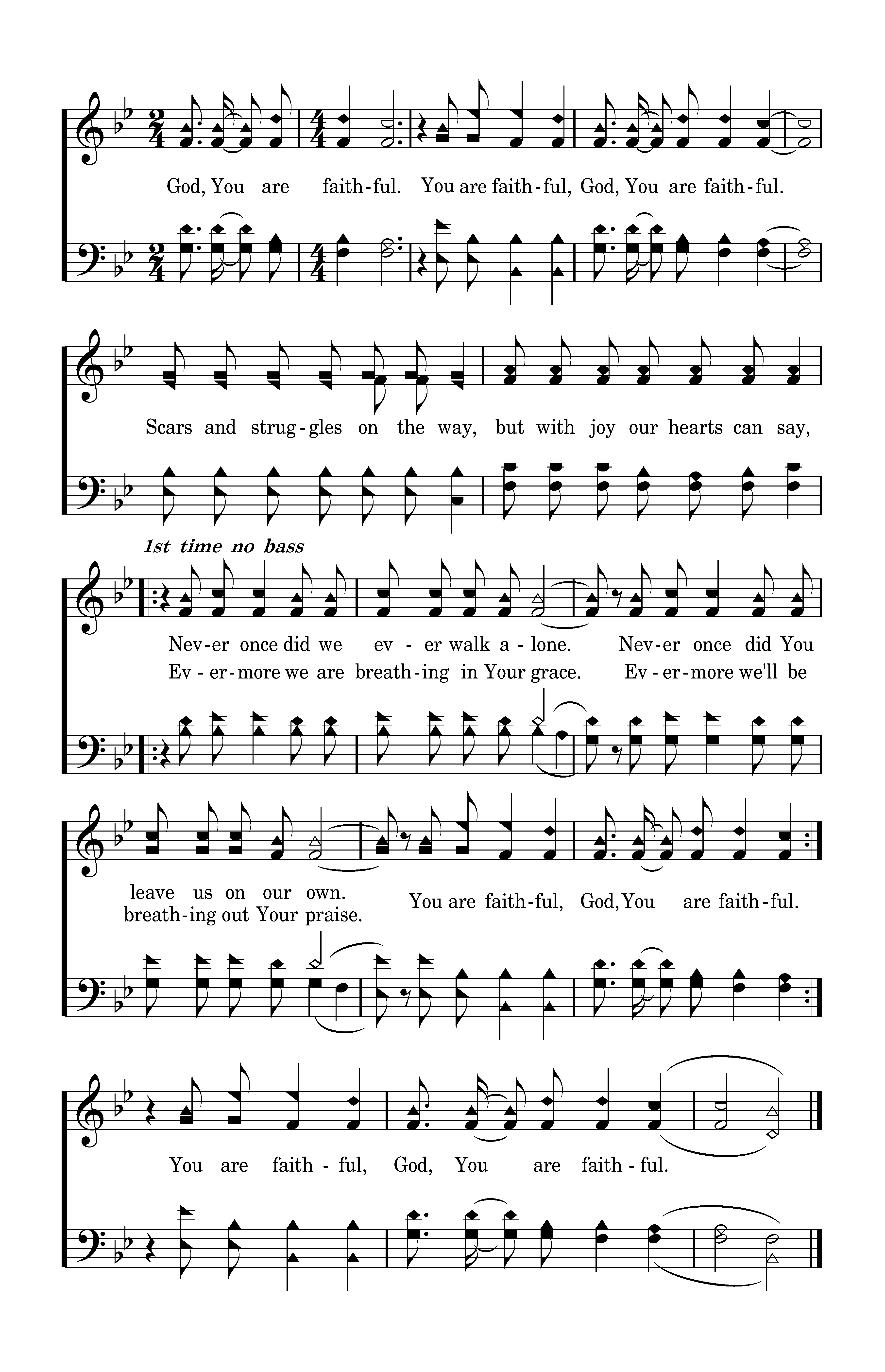 Standing on this mountain top, looking just how far we've come, knowing that for ev'ry step, You were with us.Kneeling on this battleground, seeing just how much You've done, knowing ev'ry victory was Your pow'r in us. Scars and struggles on the way, but with joy our hearts can say, yes, our hearts can say; Never once did we ever walk alone. Never once did You leave us on our own. You are faithful, God, You are faithful. God, Evermore we are breathing in Your grace. Evermore we'll be breathing out Your praise. You are faithful. You are faithful, God, You are faithful. Scars and struggles on the way, but with joy our hearts can say, Never once did we ever walk alone. Never once did You leave us on our own. You are faithful, God, You are faithful. You are faithful, God, You are faithful.