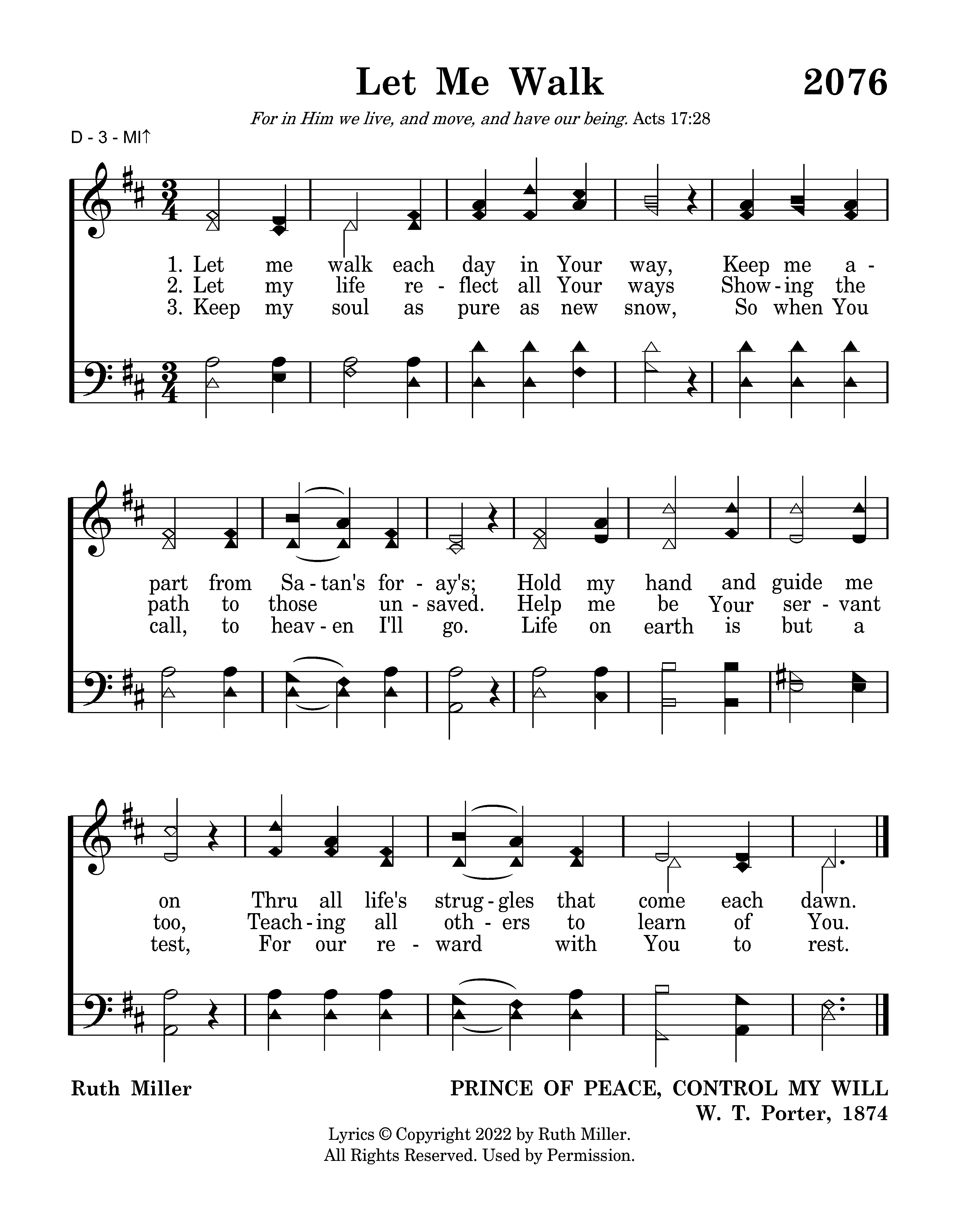 Let me walk each day in Your way, Keep me apart from Satan's foray's; Hold my hand and guide me on Thru all life's struggles that come each dawn.
