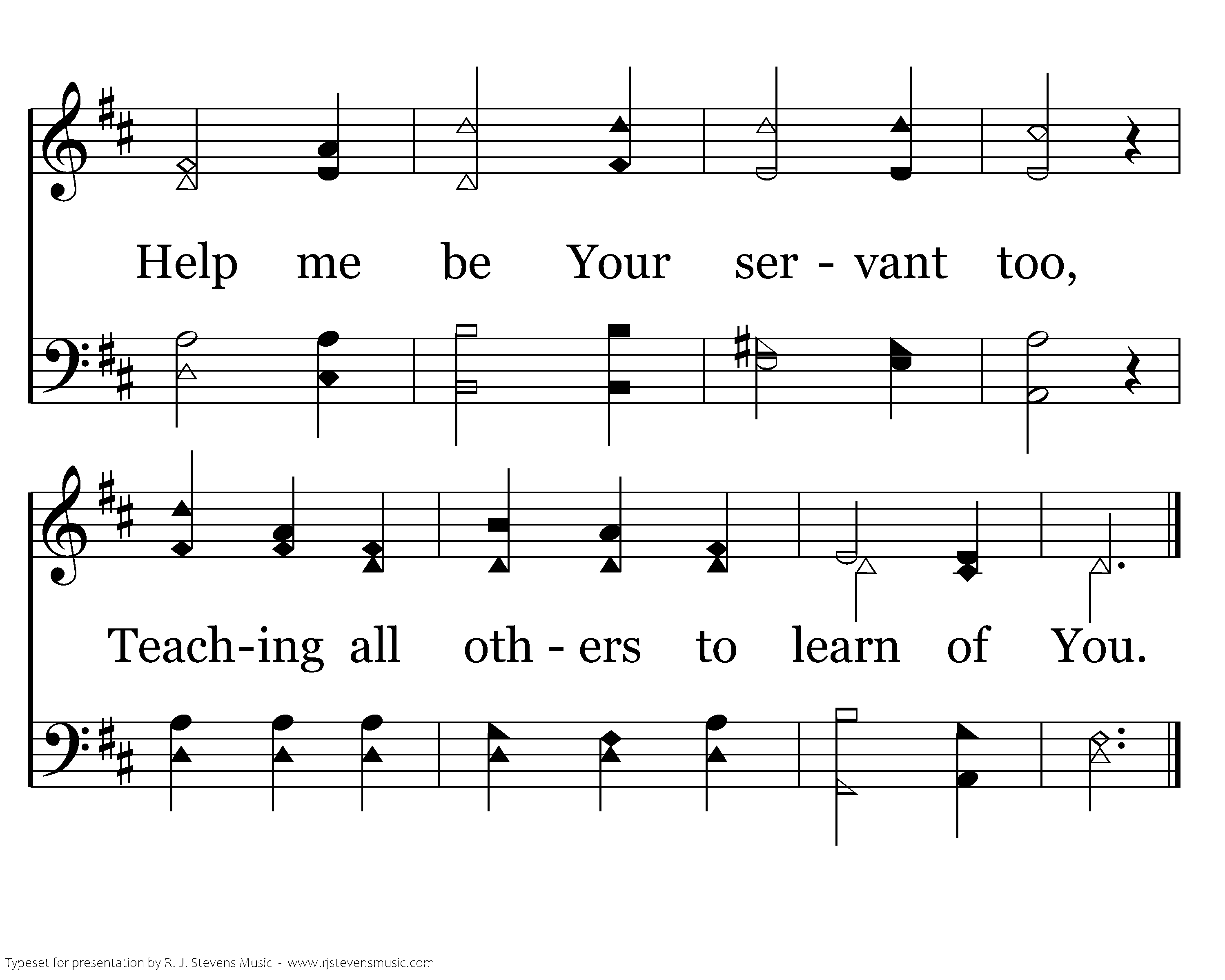 Let my life reflect all Your ways Showing the path to those unsaved. Help me be Your servant too, Teaching all others to learn of You.