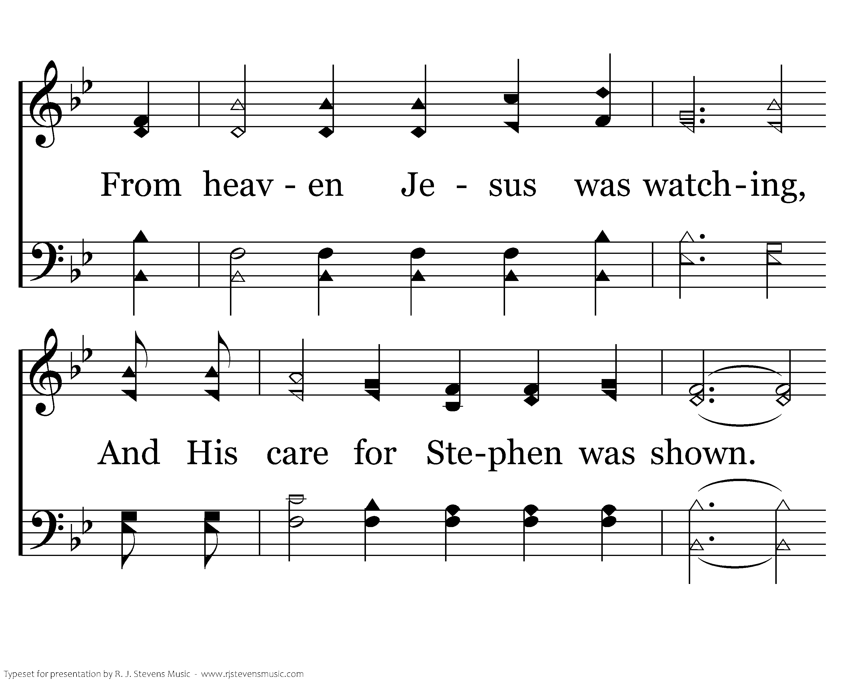 They were so angry with Stephen, To kill him they all took up stones. From heaven Jesus was watching, And His care for Stephen was shown. With great concern Jesus stood up from the throne.