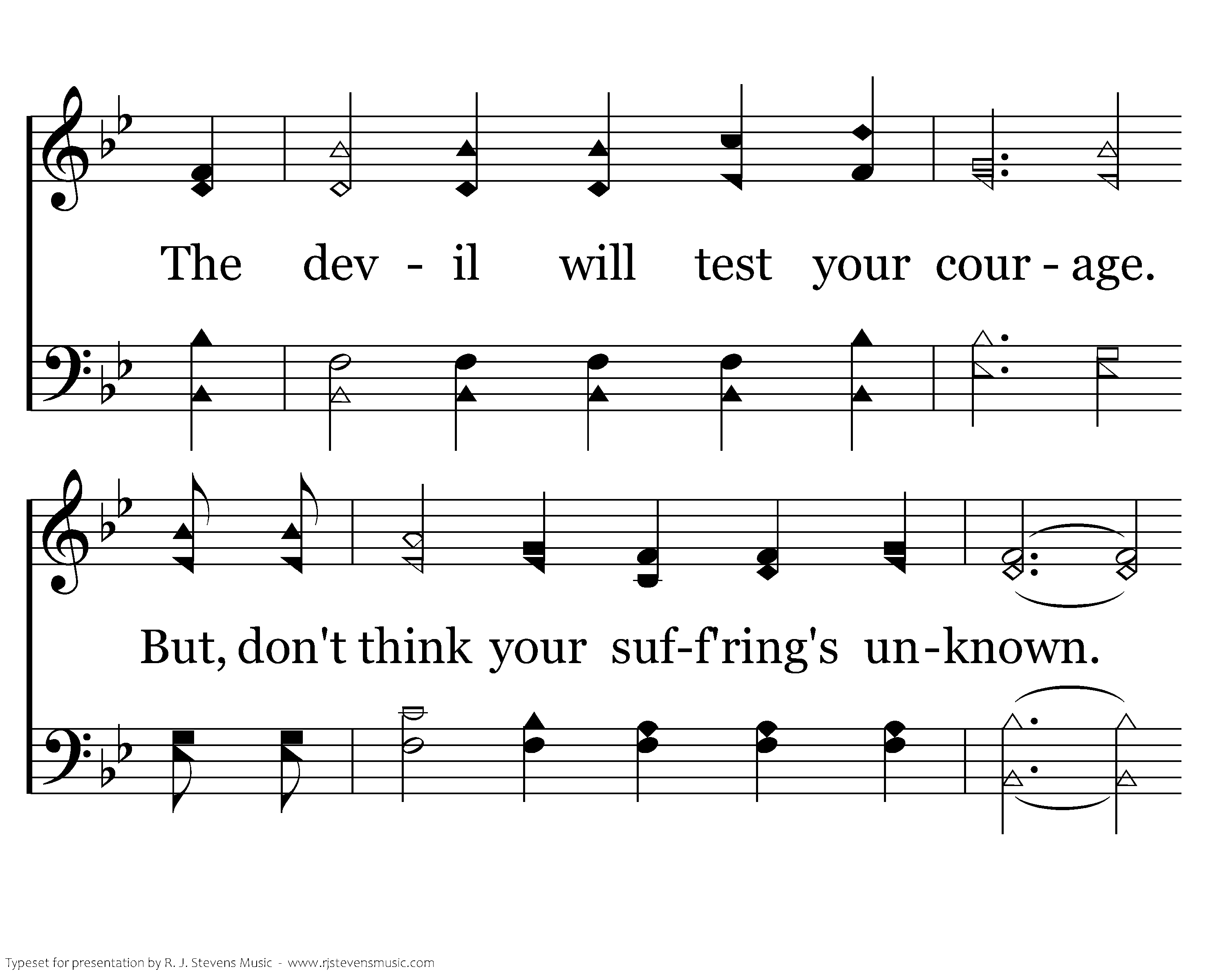 Now, if you're Jesus' disciple, You'll see your share of hurtful stones. The devil will test your courage. But, don't think your suff'ring's unknown. Take courage from Jesus, Standing at the throne.