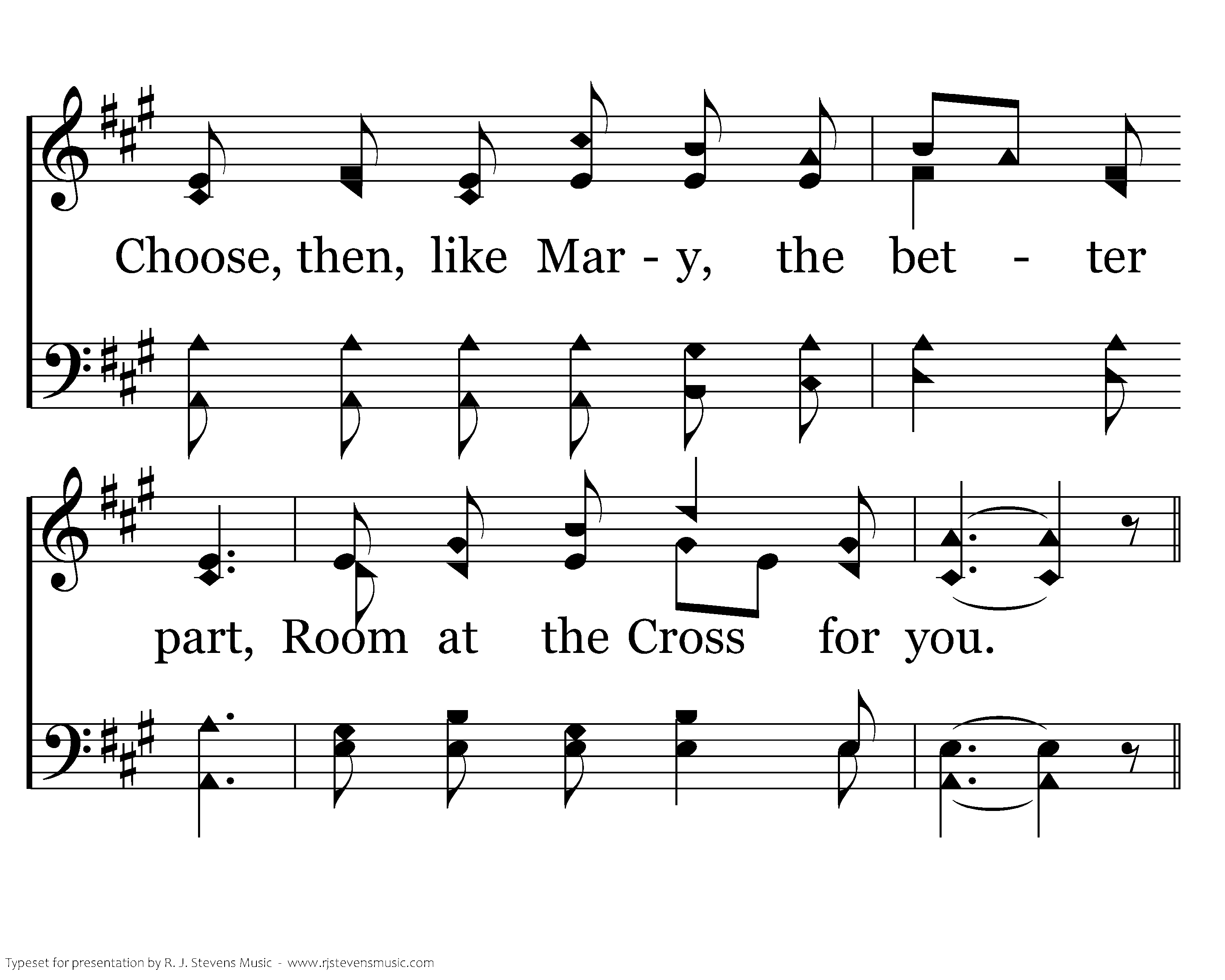 Room at the Cross for a breaking heart, Room at the Cross for you; Choose, then, like Mary, the better part, Room at the Cross for you.