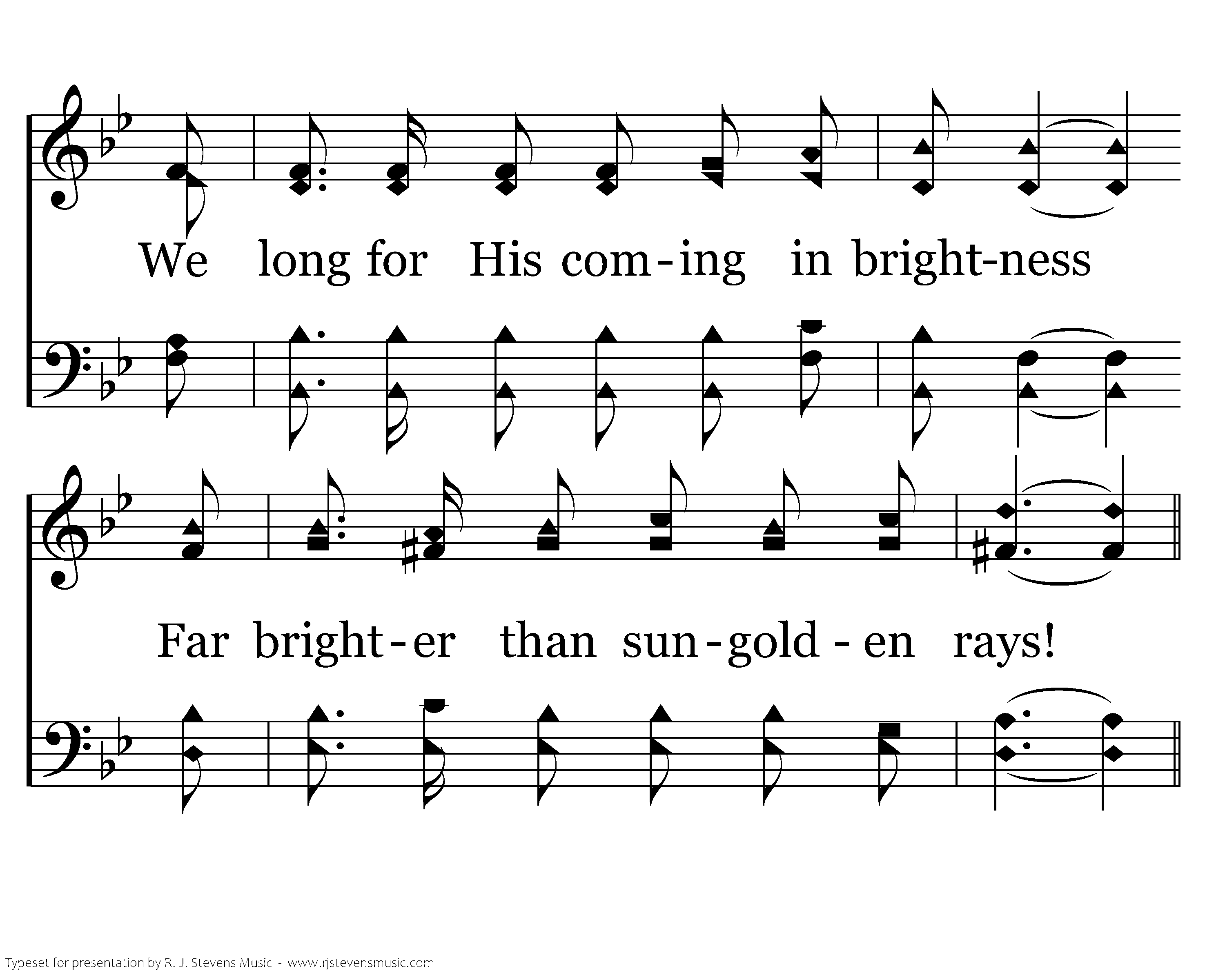 Your Son is the answer we've needed; His presence, His strength and His care. He helps us to walk on high places Above our doubt and despair. We long for His coming in brightness Far brighter than sungolden rays!
