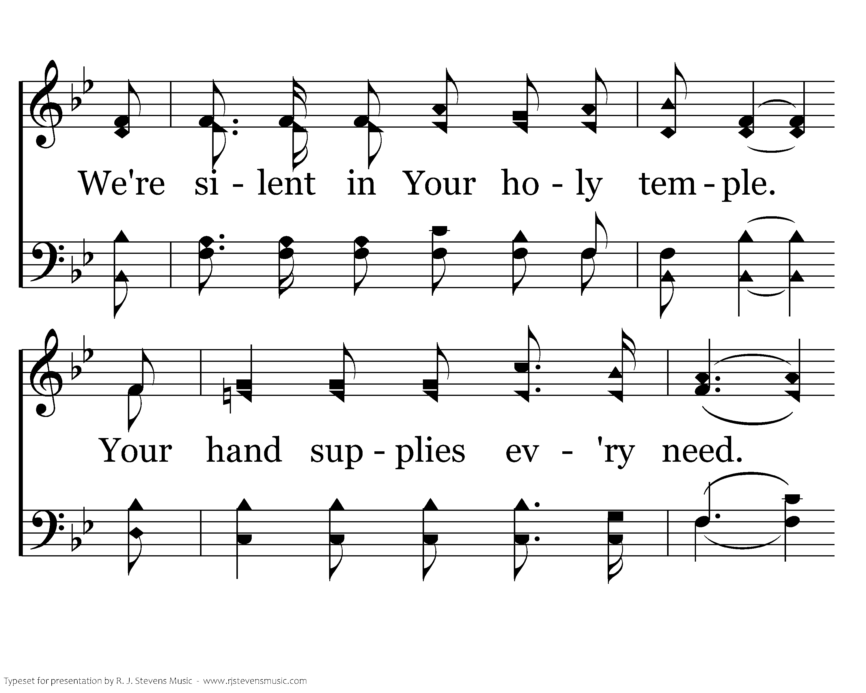 The noise of the proud is heard daily. The wicked drink deeply of greed. We're silent in Your holy temple. Your hand supplies ev'ry need. No power on earth can destroy us, By faith we will walk in Your ways.