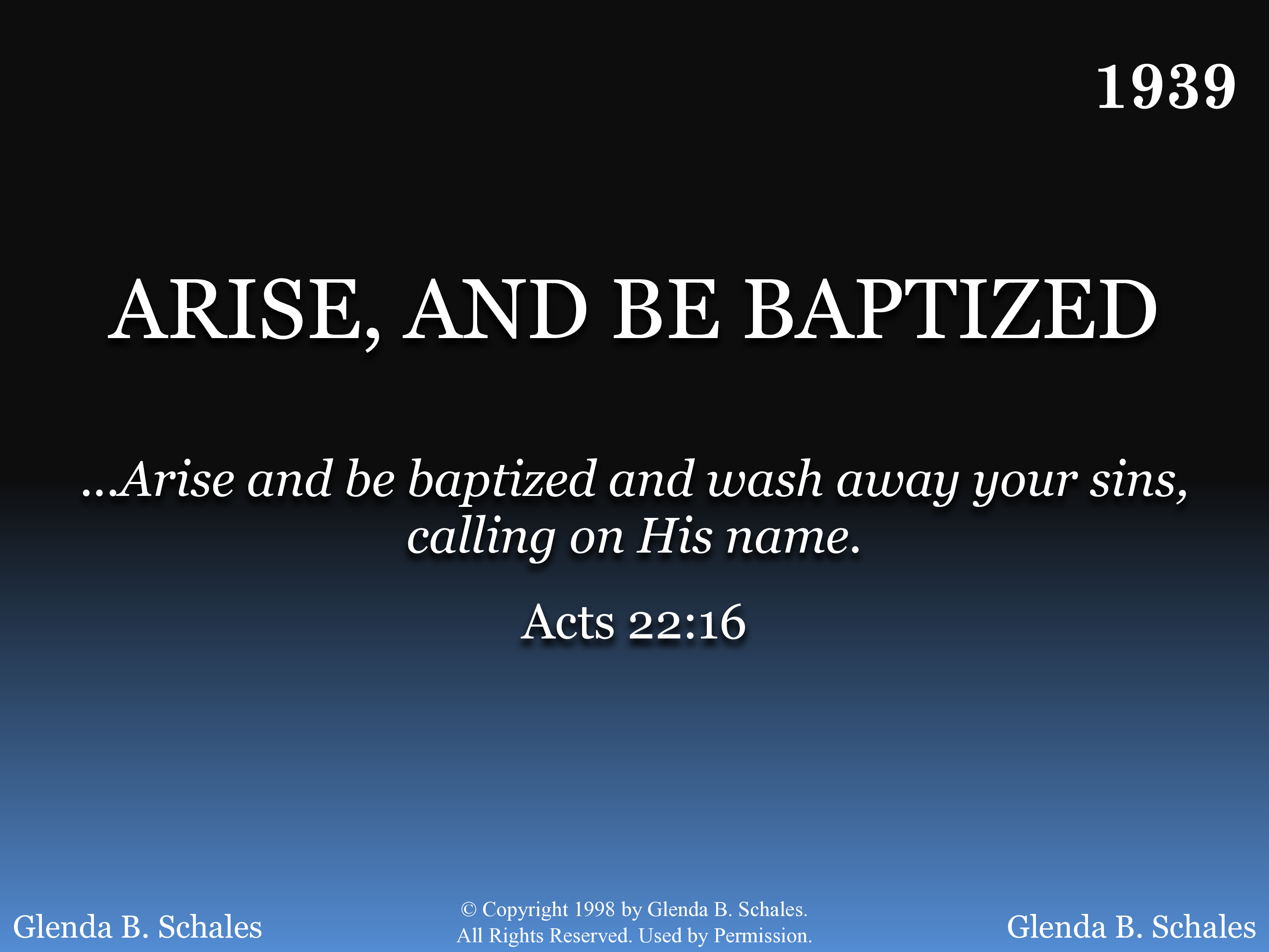 | Key | Value | | Title | ARISE, AND BE BAPTIZED |