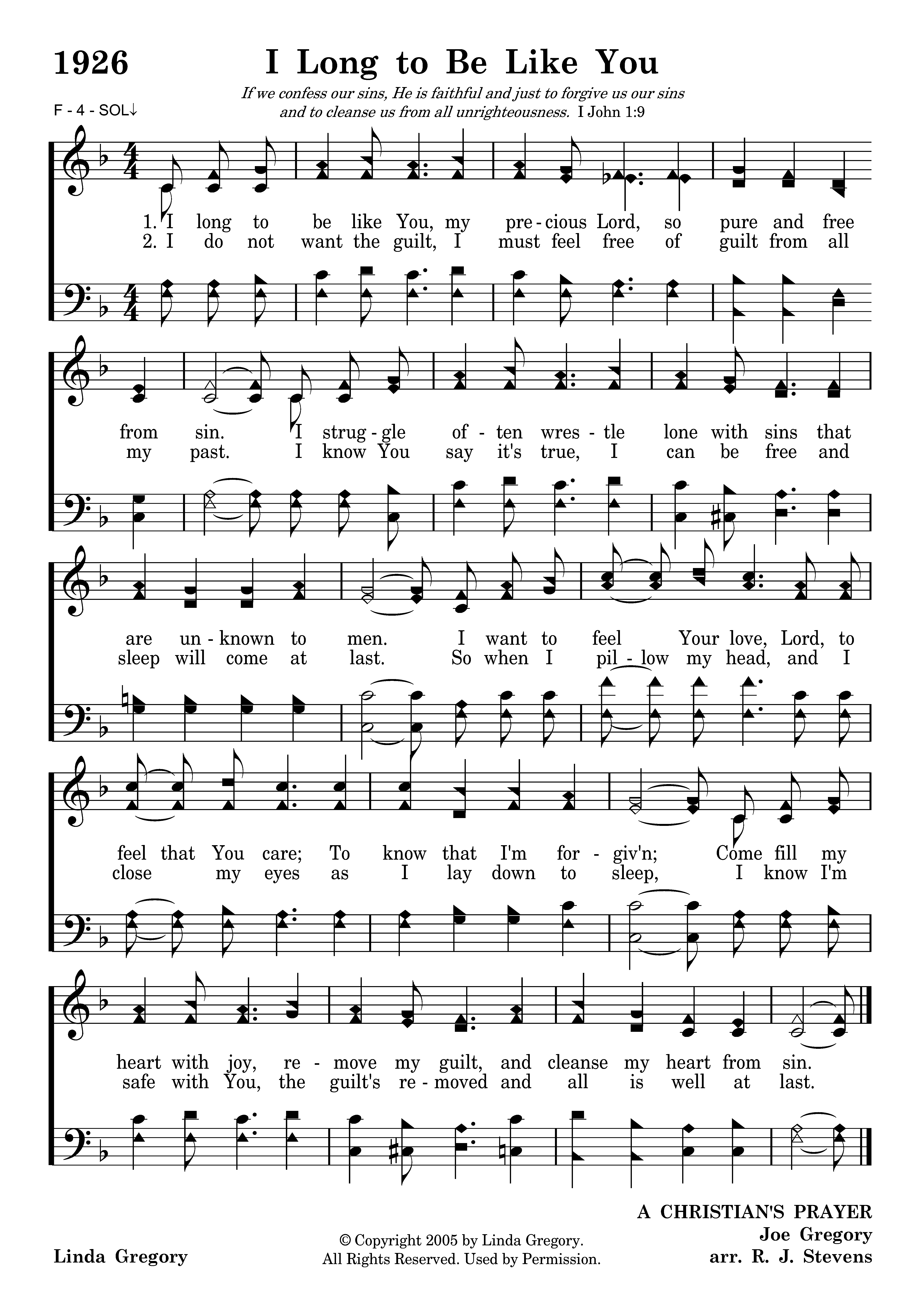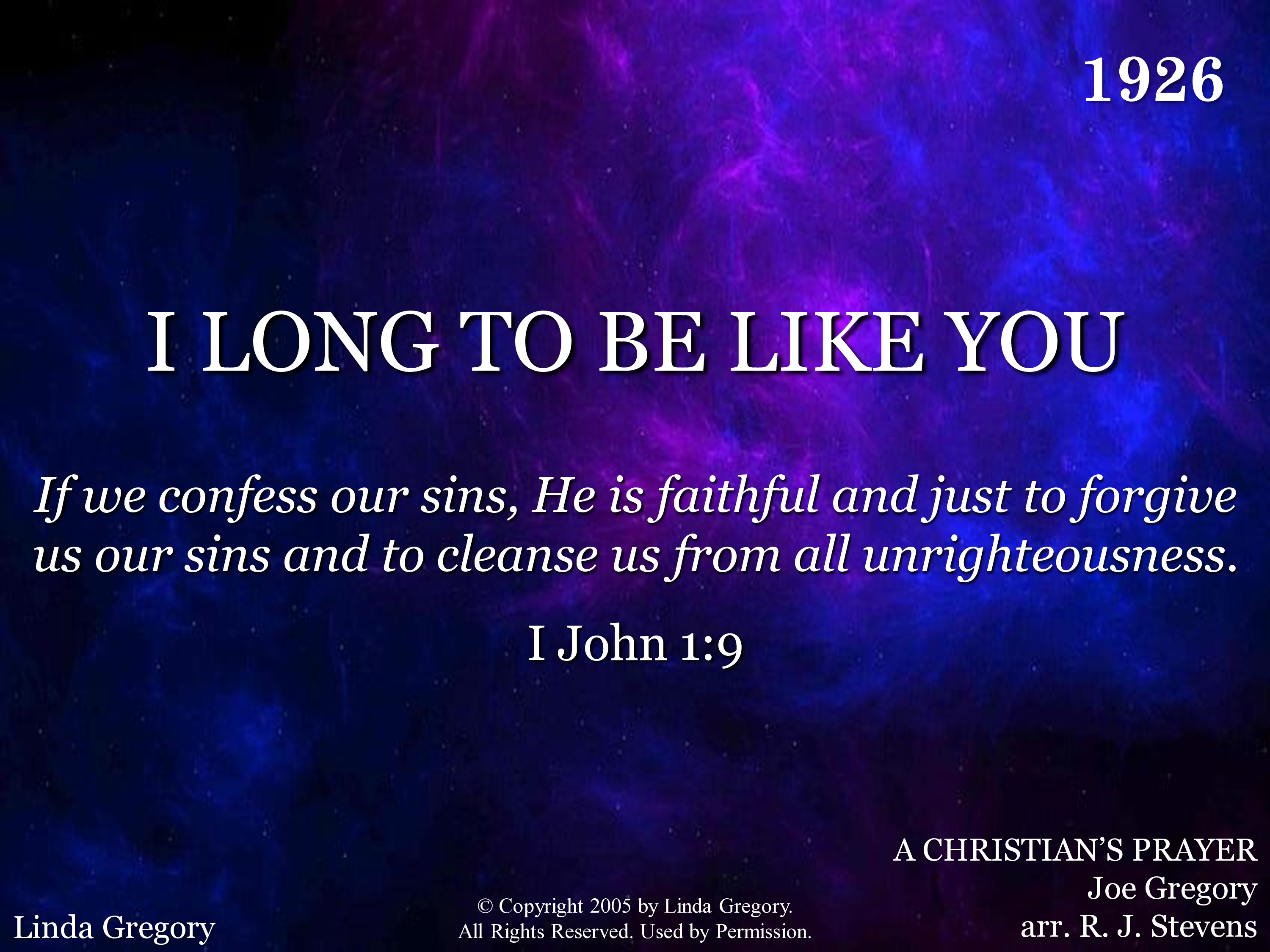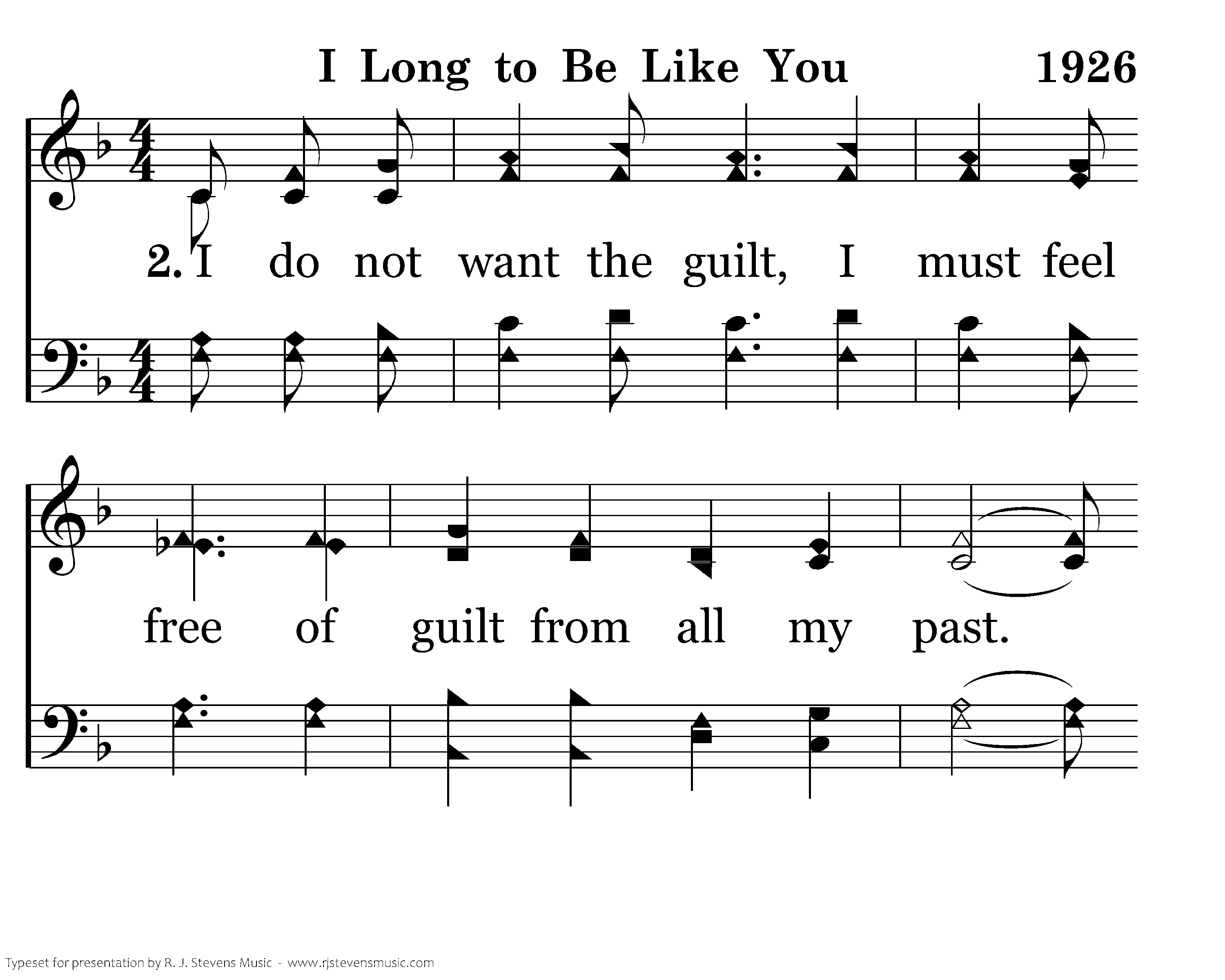 I long to be like You, my precious Lord, so pure and free from sin. I struggle often wrestle lone with sins that are unknown to men. I want to feel Your love, Lord, to feel that You care; To know that I'm forgiv'n; Come fill my heart with joy, remove my guilt, and cleanse my heart from sin.