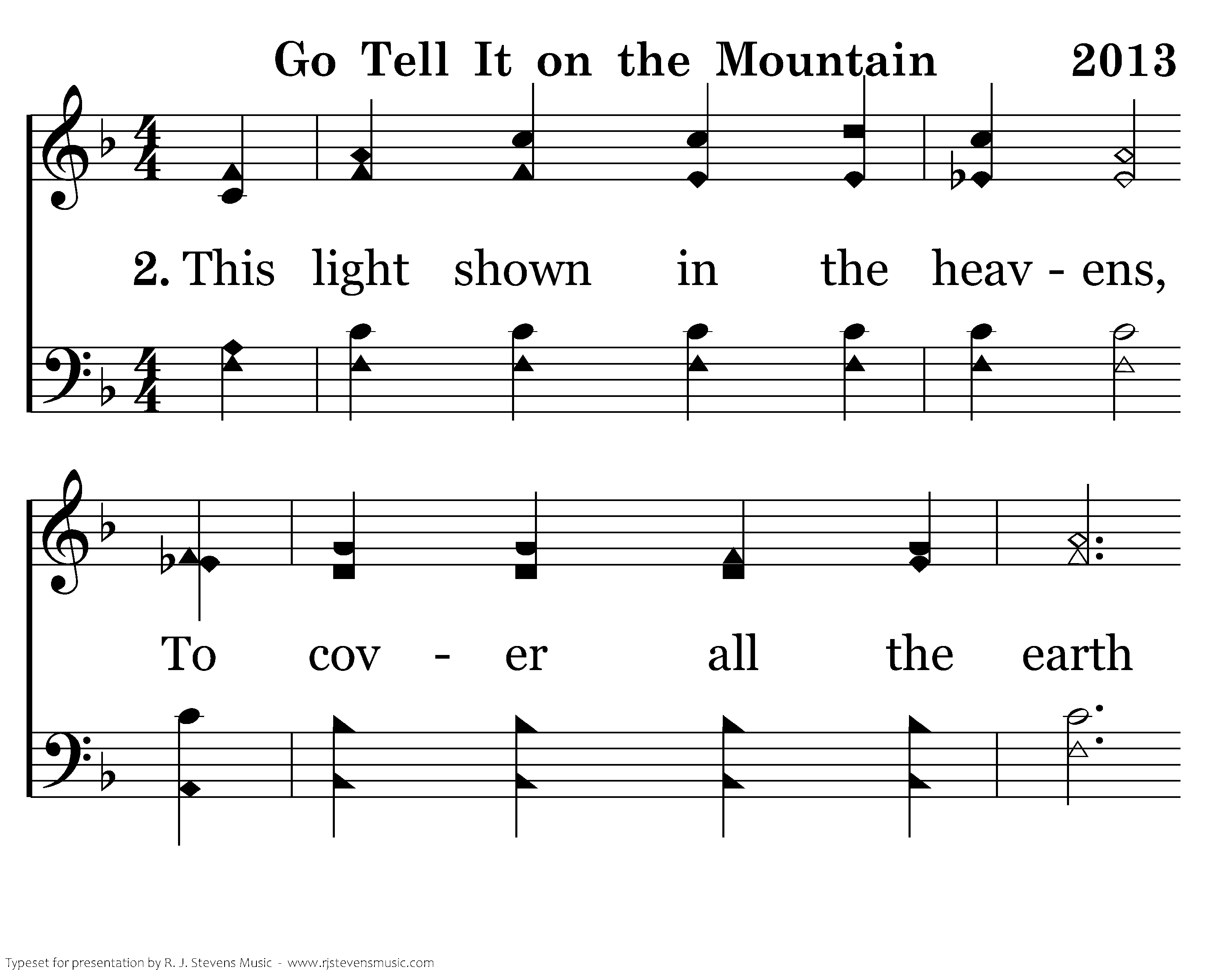 This light shown in the heavens, To cover all the earth It was a sign to tell men About our Savior's birth. Go, tell it on the mountain, Over the hills and ev'rywhere; Go, tell it on the mountain That Jesus Christ is born.