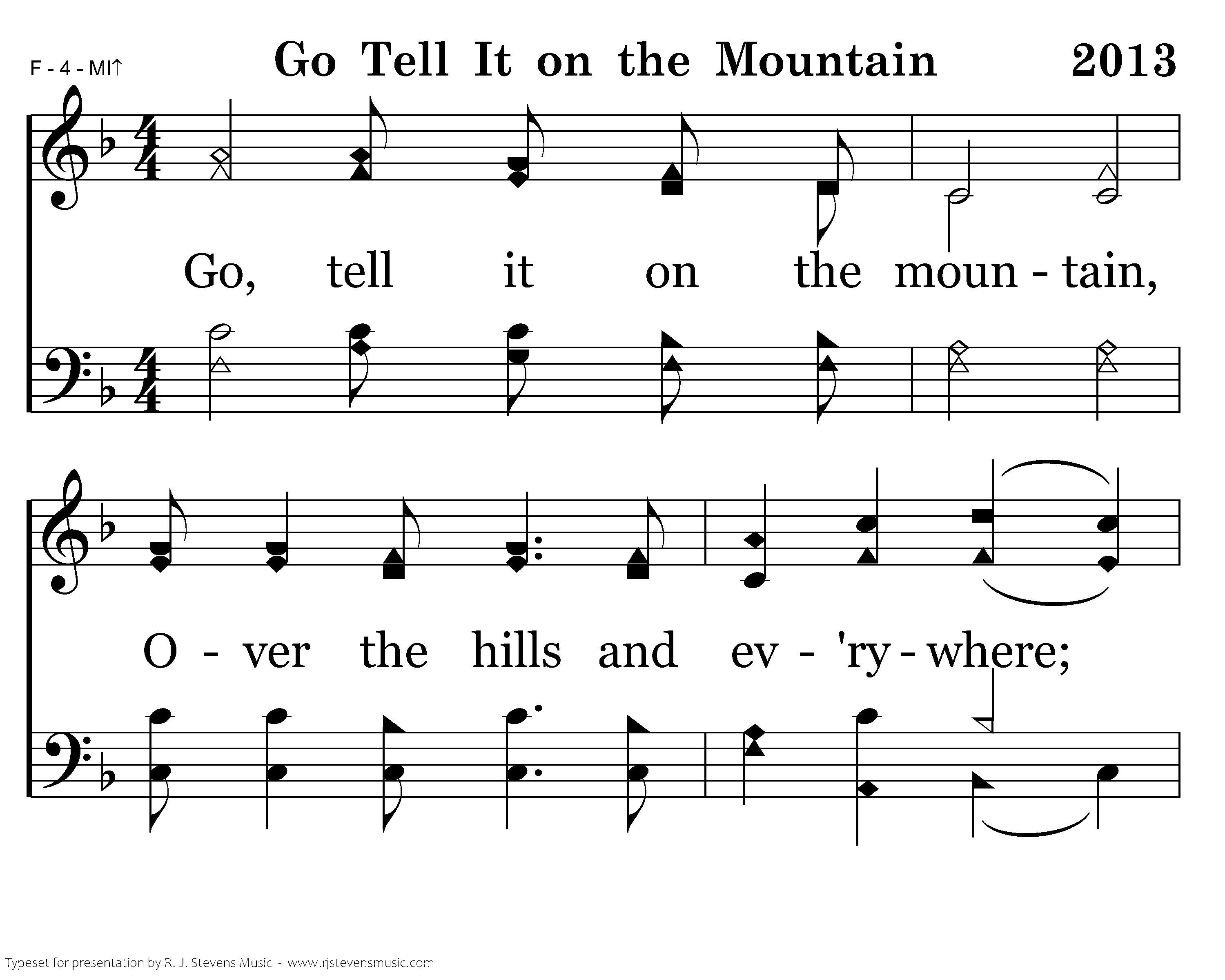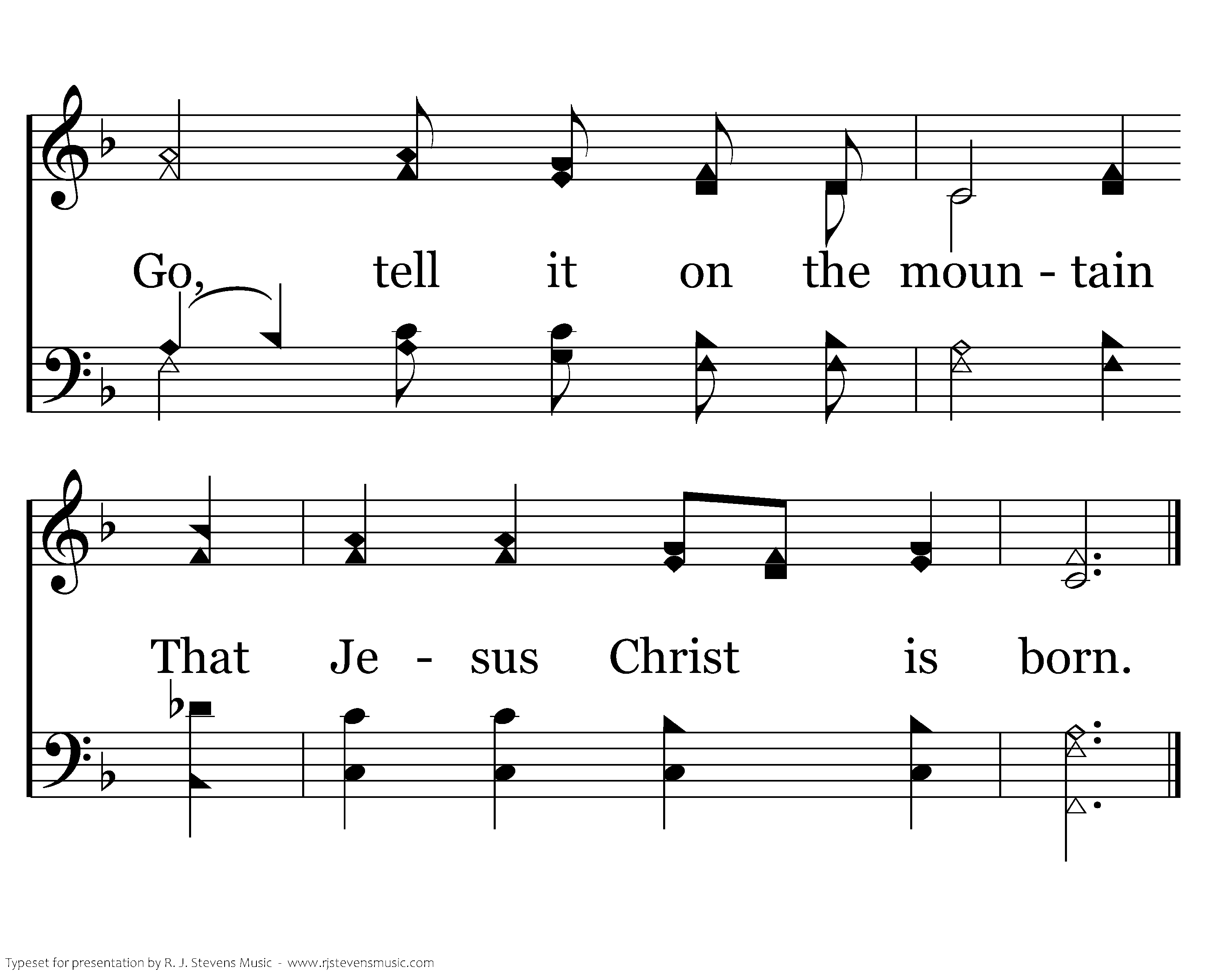 Go, tell it on the mountain, Over the hills and ev'rywhere; Go, tell it on the mountain That Jesus Christ is born. The shepherds all were watching, While seated on the ground A light from heav'n descended And glory shown around. Go, tell it on the mountain, Over the hills and ev'rywhere; Go, tell it on the mountain That Jesus Christ is born.