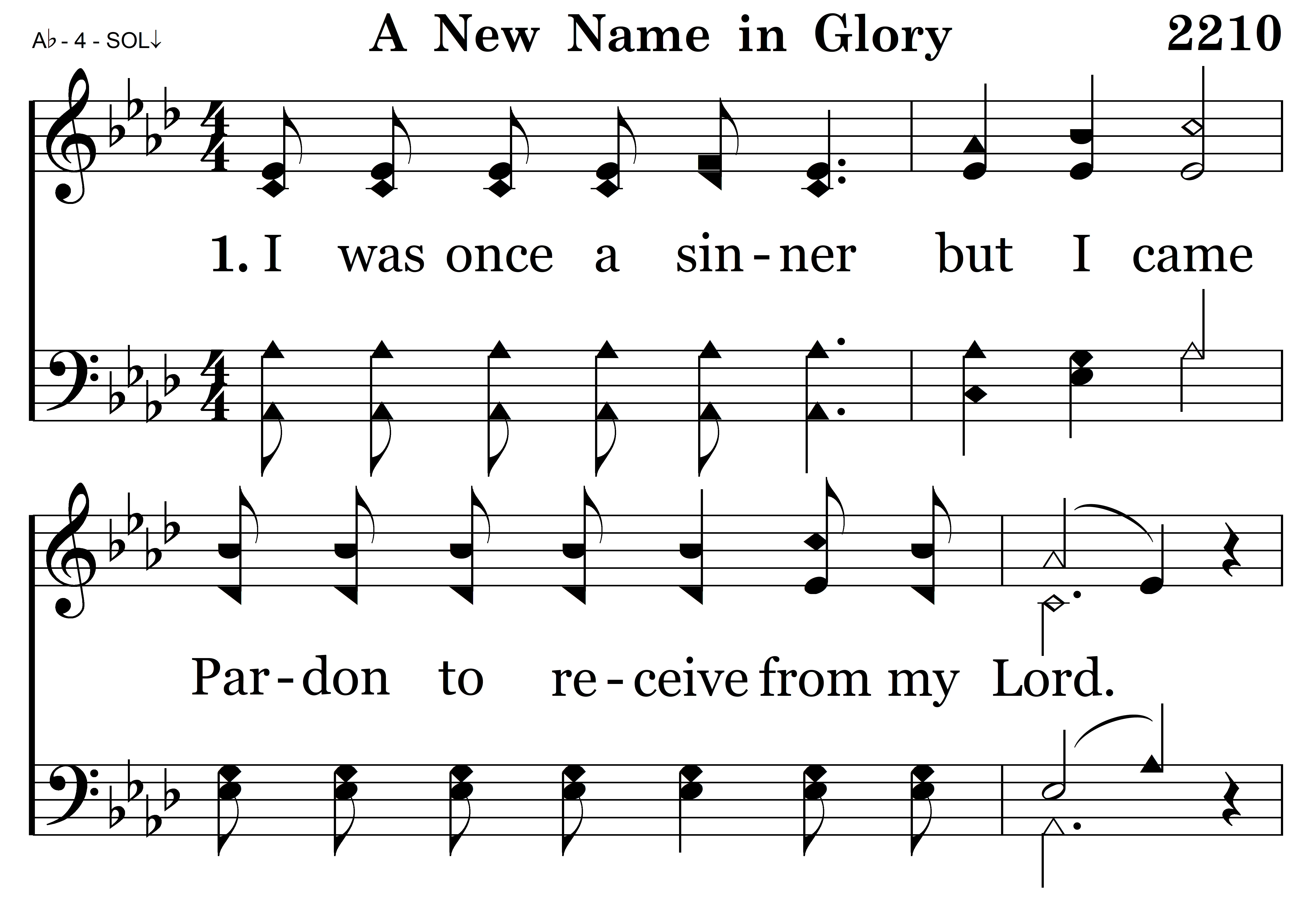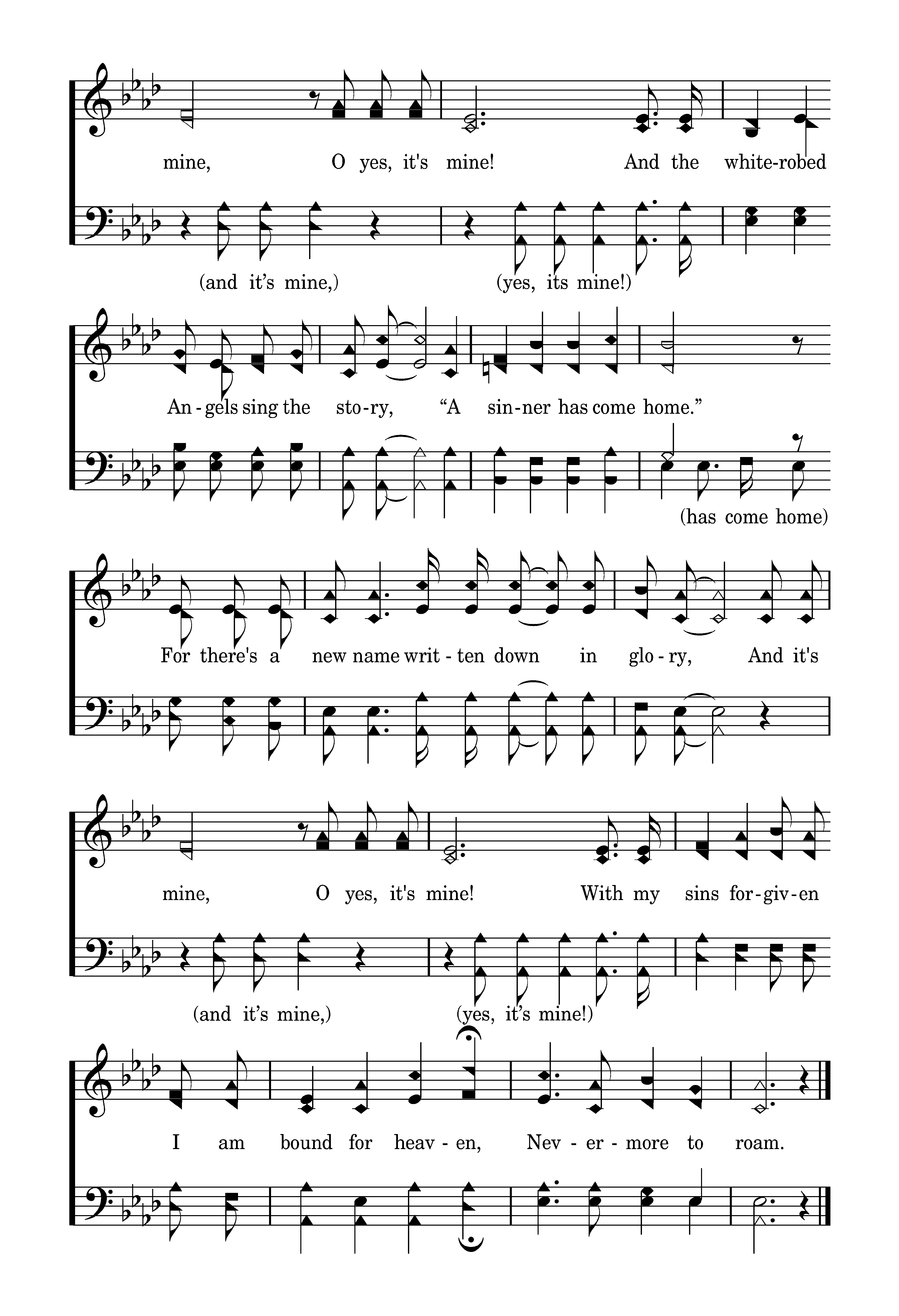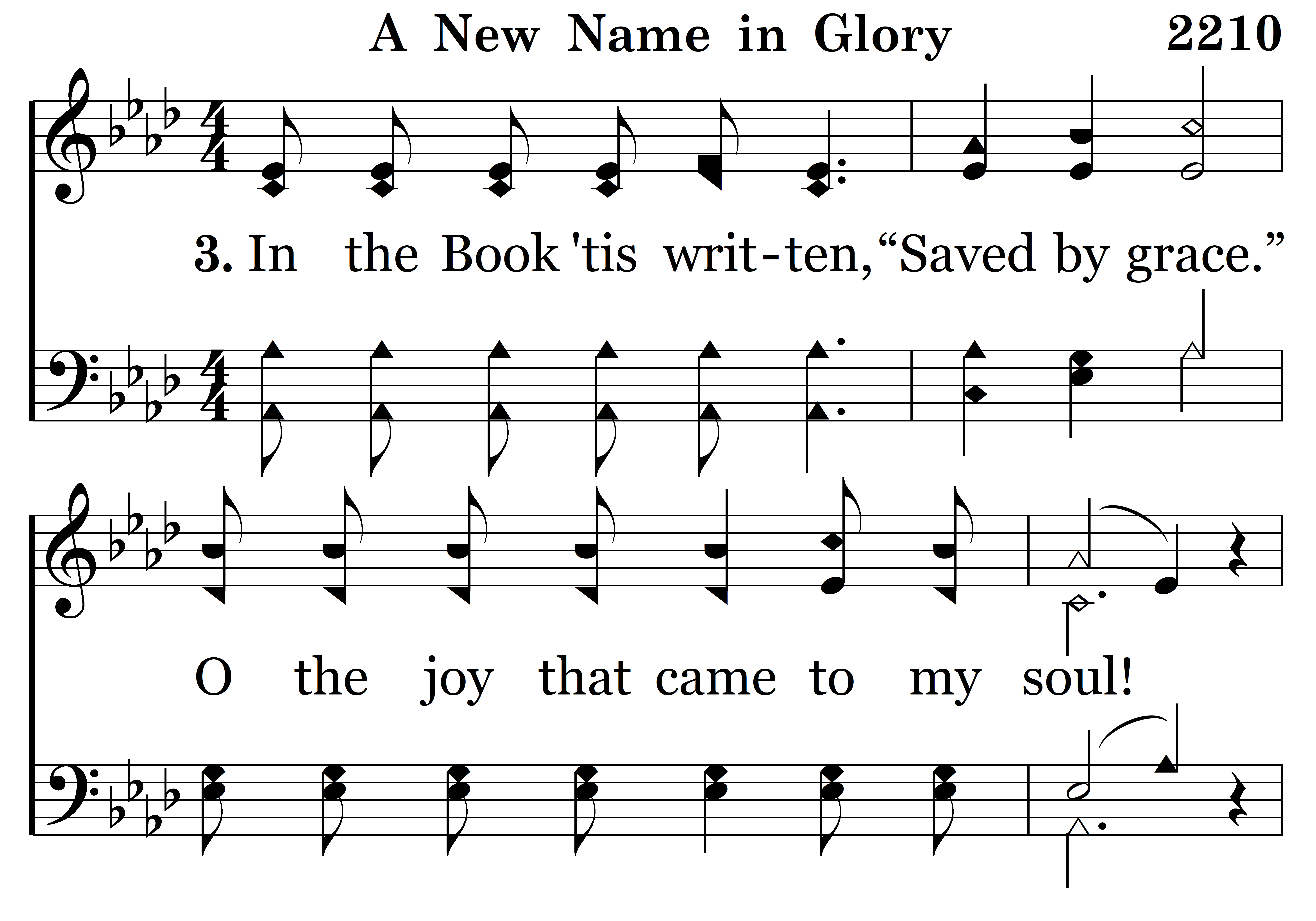 There's a new name written down in glory, And it's mine, (and it’s mine,) O yes, it's mine! (yes, its mine!) And the white-robed Angels sing the story, “A sinner has come home.” (has come home for) For there's a new name written down in glory, And it's mine, (and it’s mine,) O yes, it's mine! (yes, it’s mine! With my sins forgiven I am bound for heaven, Nevermore to roam.