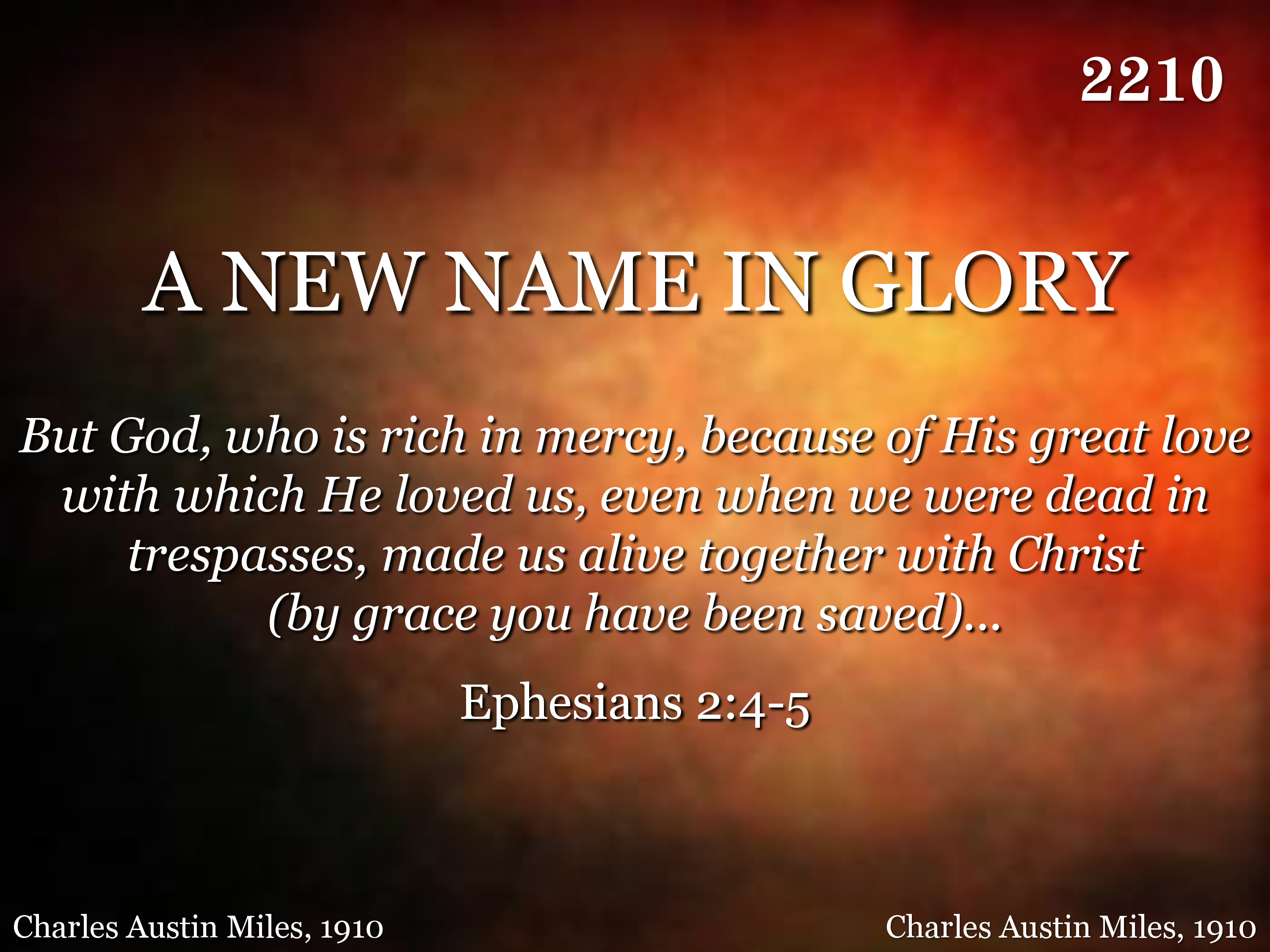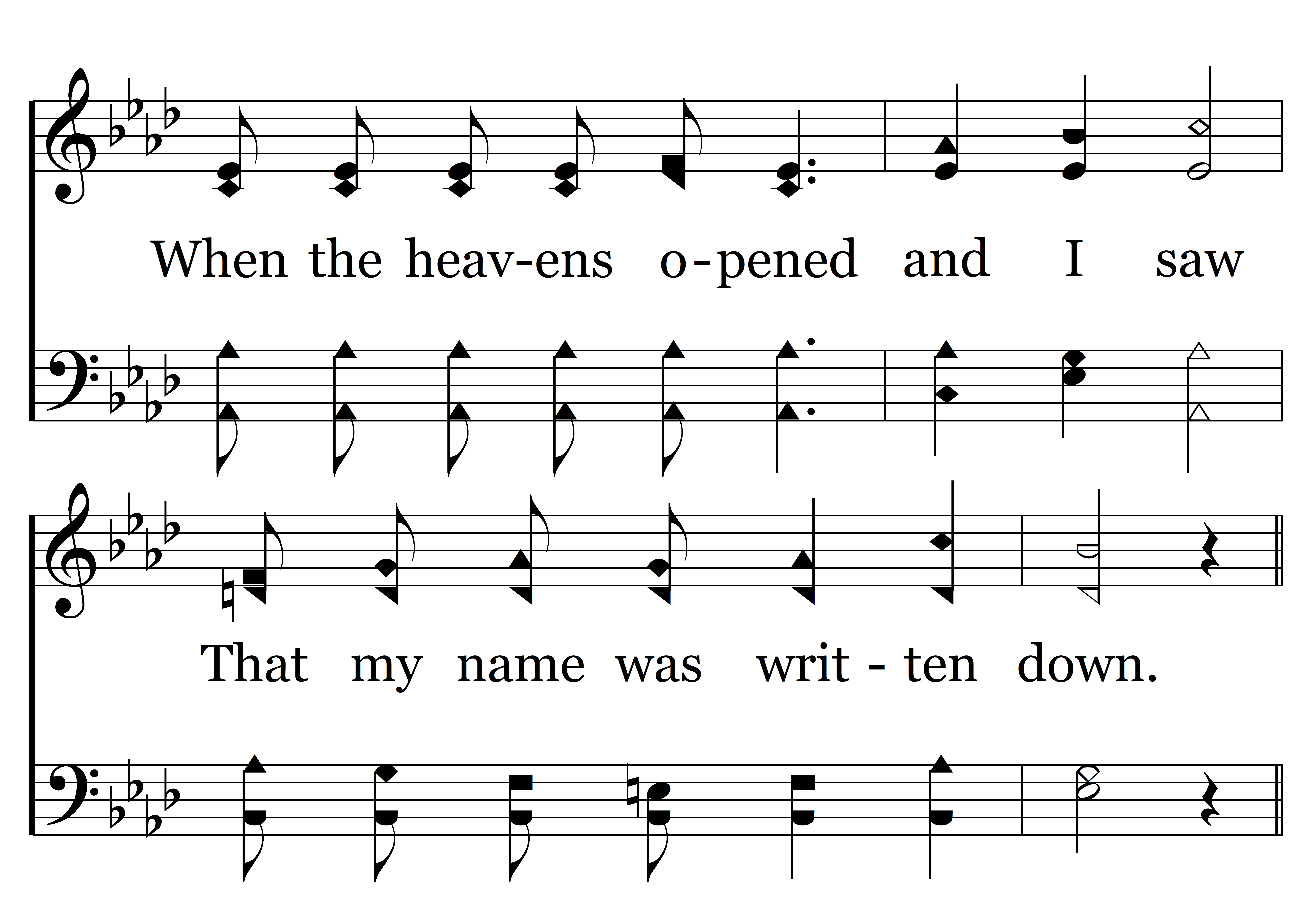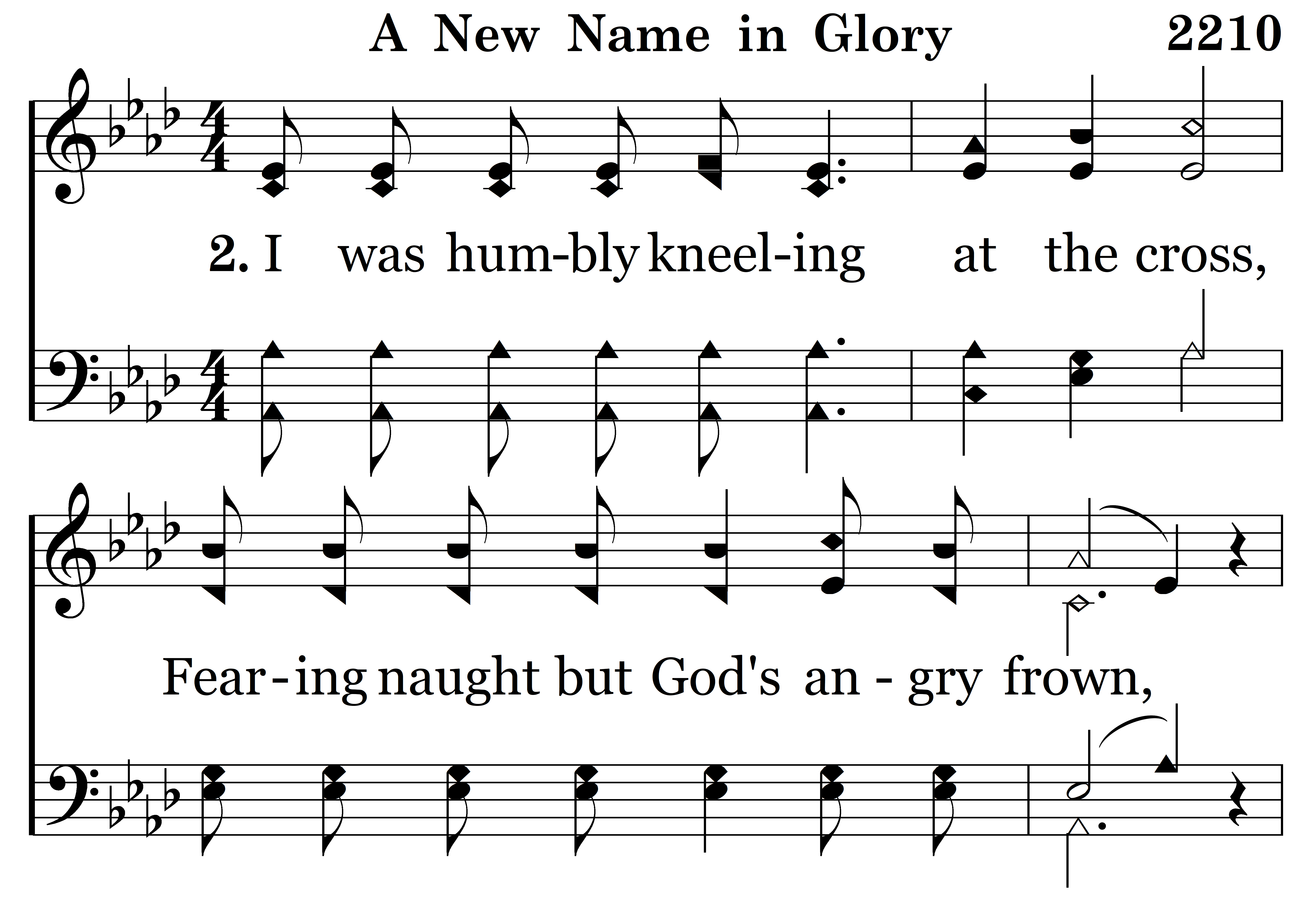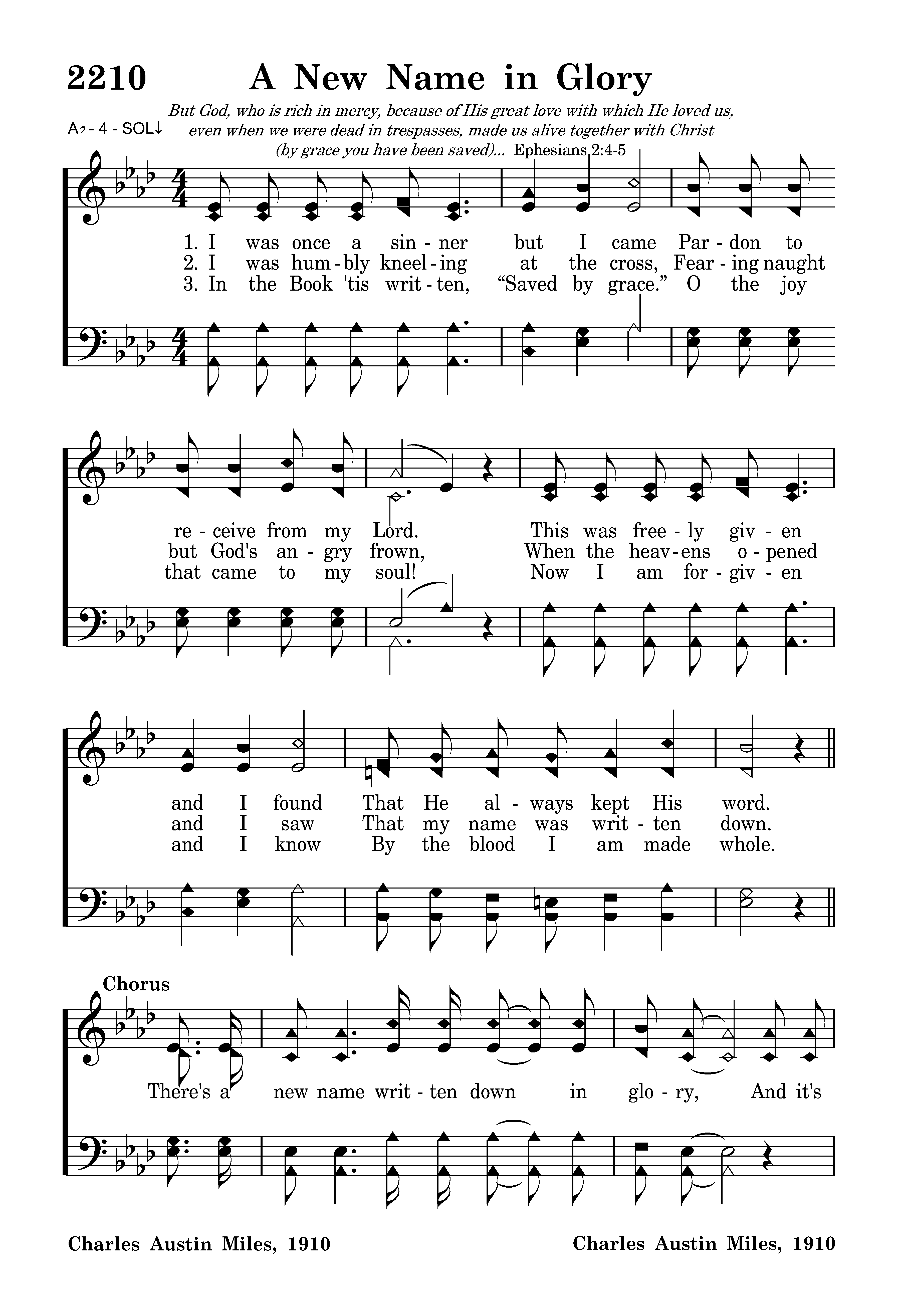 There's a new name written down in glory, And it's mine, (and it’s mine,) O yes, it's mine! (yes, its mine!) And the white-robed Angels sing the story, “A sinner has come home.” (has come home for) For there's a new name written down in glory, And it's mine, (and it’s mine,) O yes, it's mine! (yes, it’s mine! With my sins forgiven I am bound for heaven, Nevermore to roam.