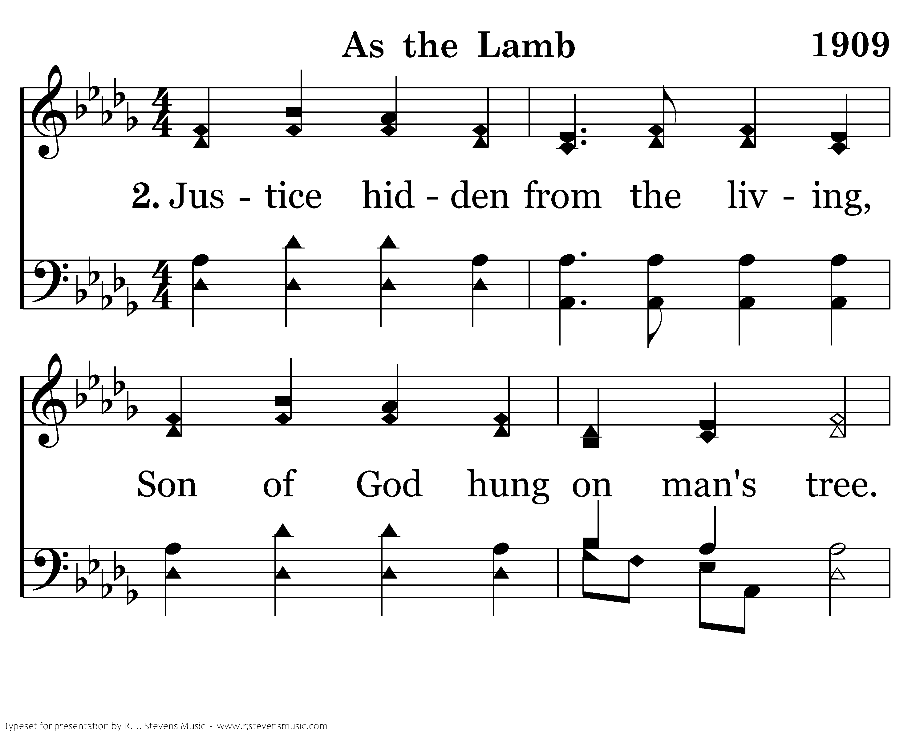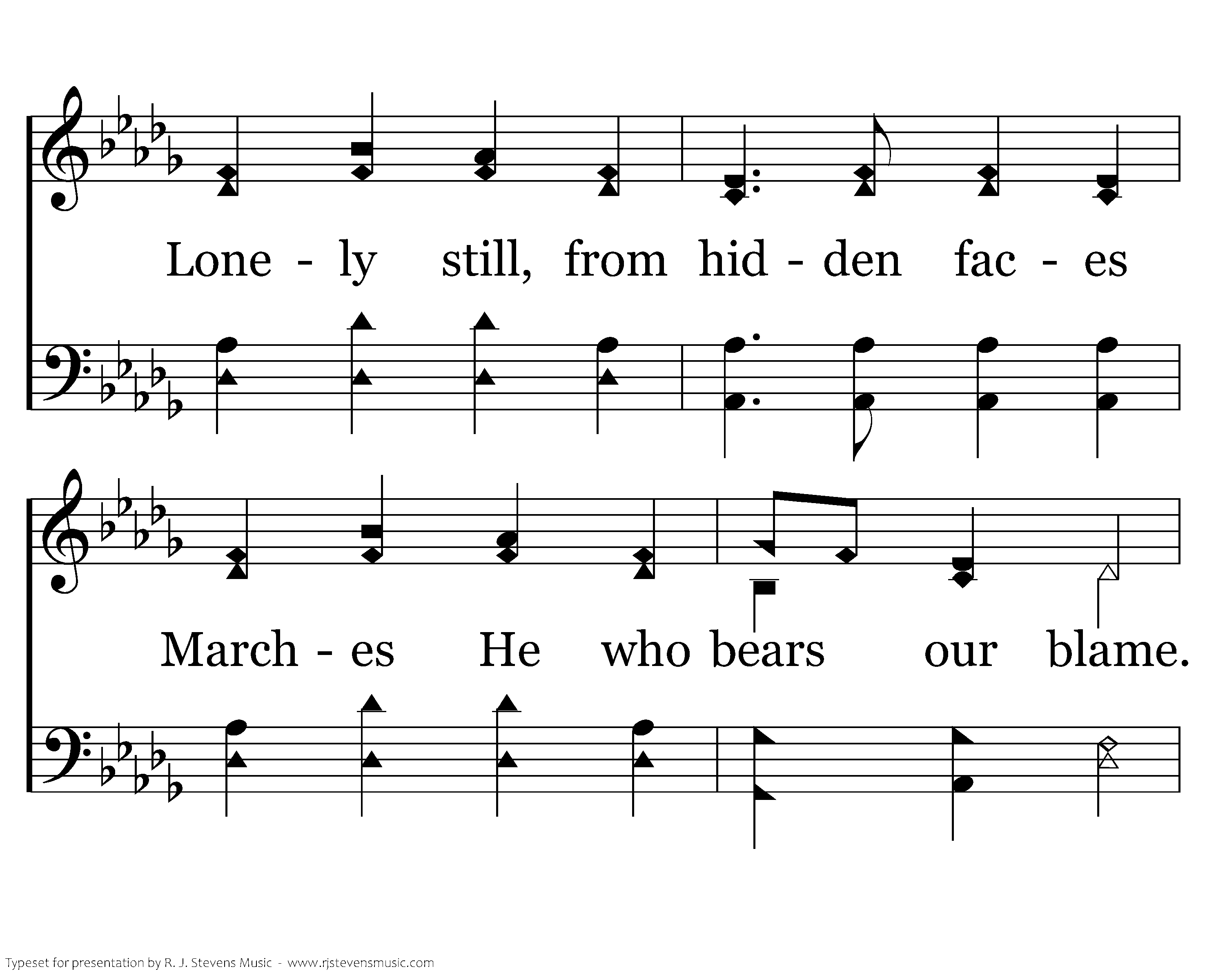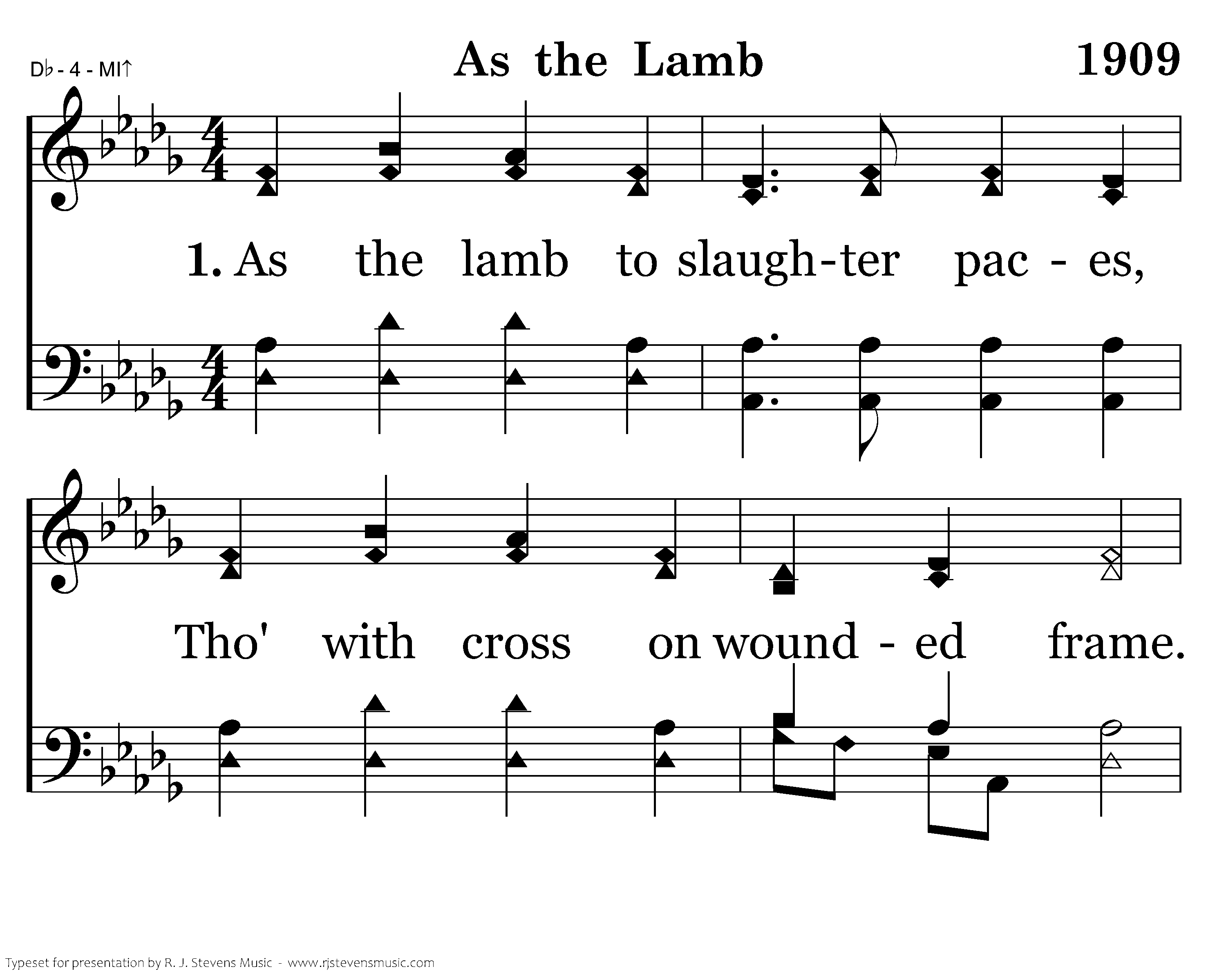 As the lamb to slaughter paces, Tho' with cross on wounded frame. Lonely still, from hidden faces Marches He who bears our blame. Not one comrade near His trial, Not a word His cup to spare; Still, He utters no revile In this court, the devil's lair.